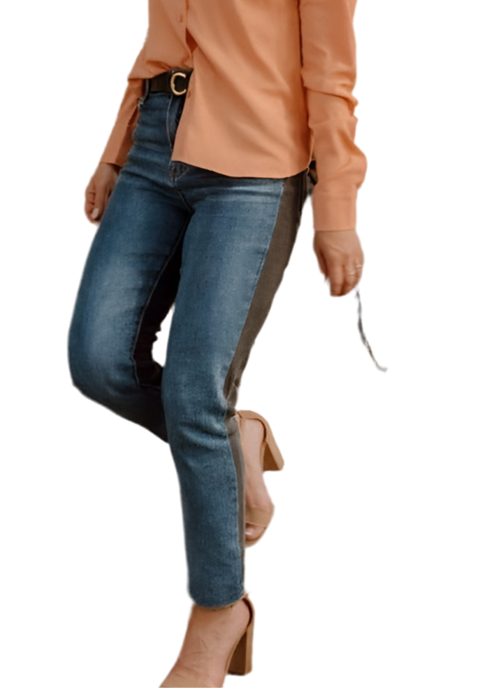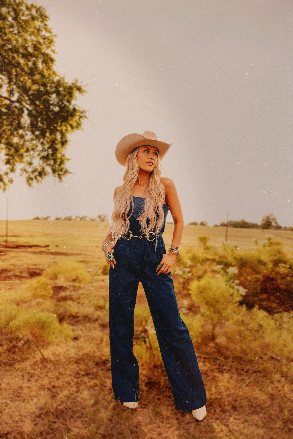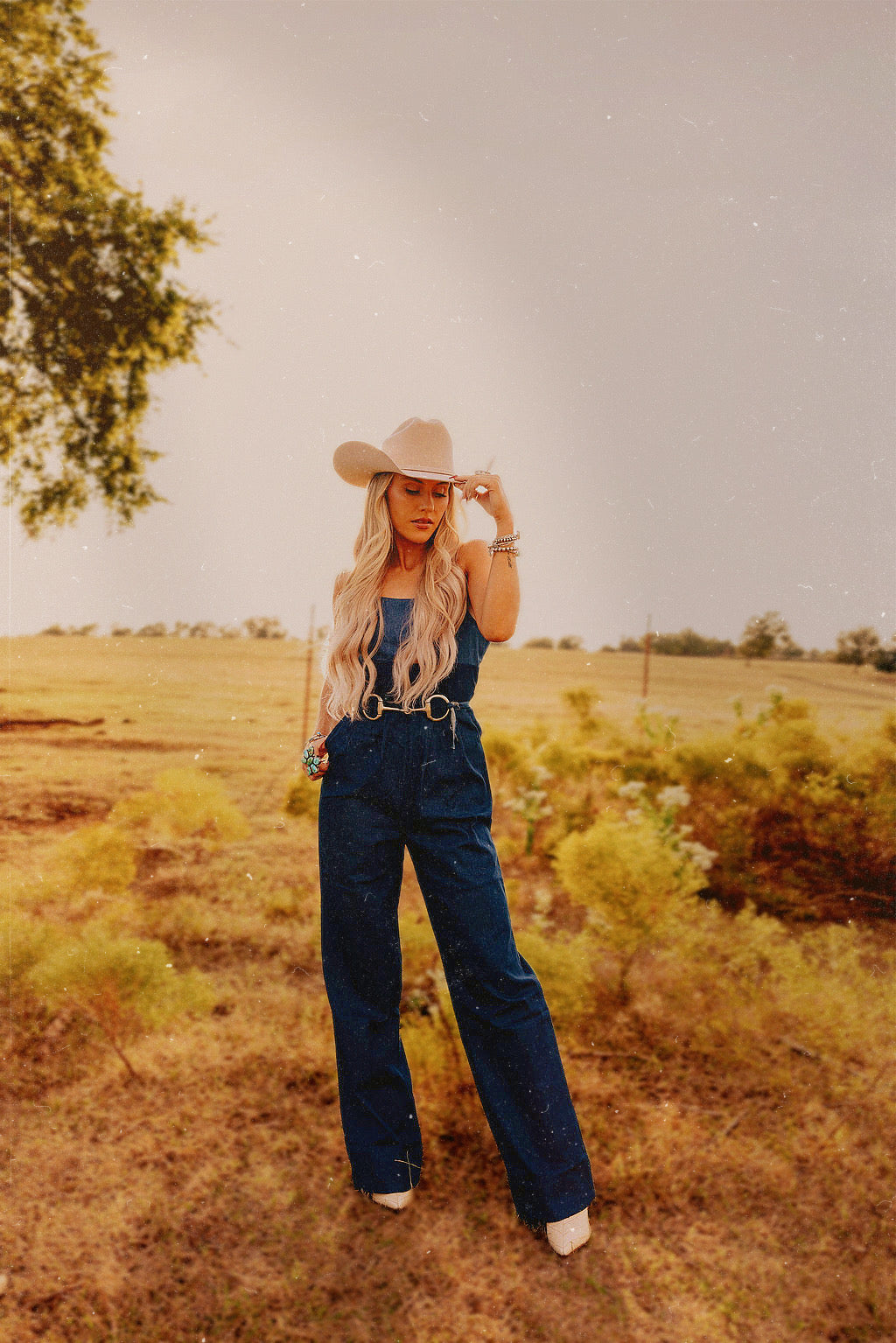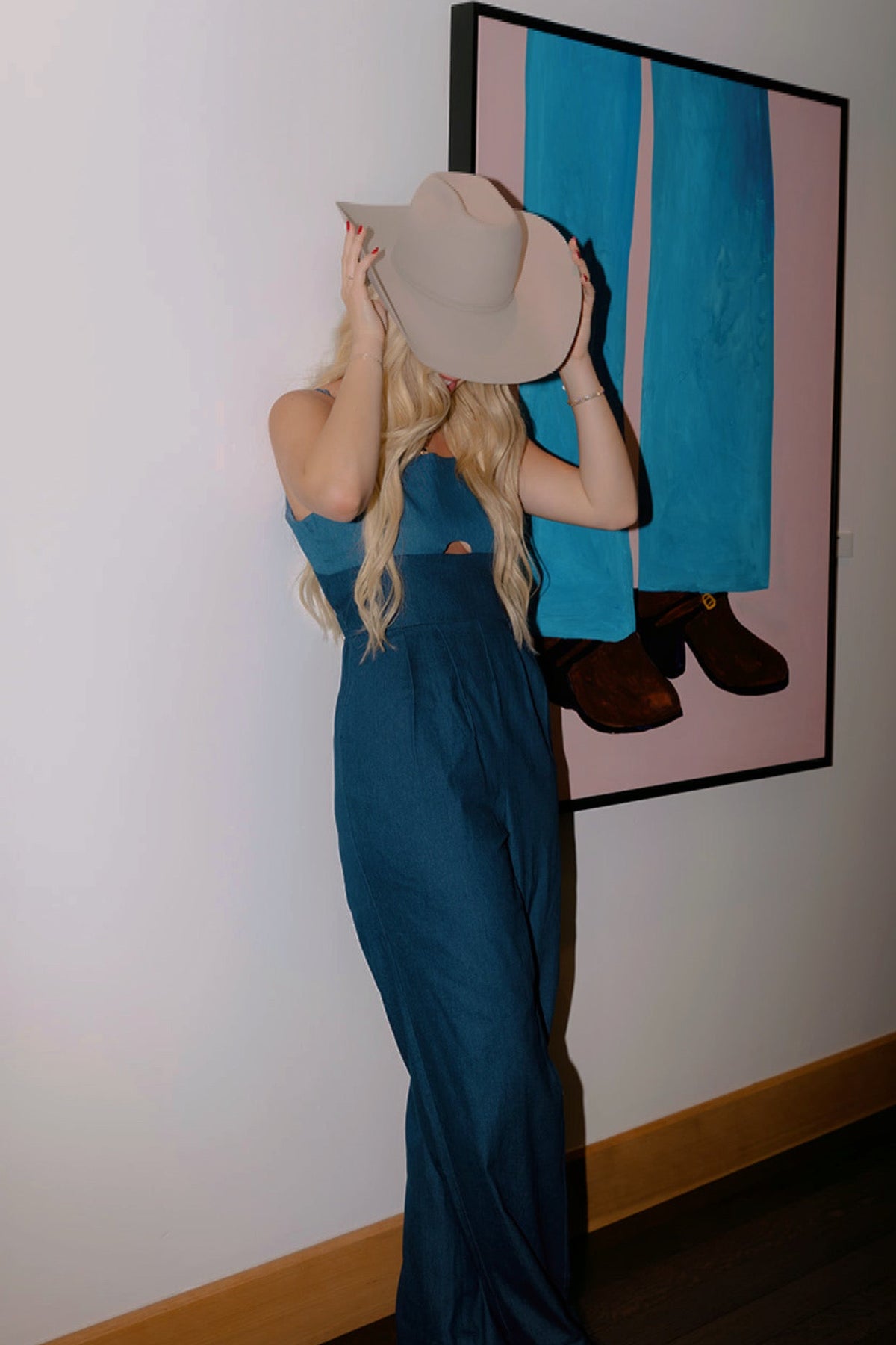 Two-toned denim trendy women's jumpsuit features a stunning keyhole, spaghetti strap top and zipper closure on the backside.  This denim jumpsuit flatters every curve, while the wide-leg cut and high waist elongate your frame. The square neckline and open arms give it a sleek, feminine edge making it the perfect western fashion jumpsuit.
