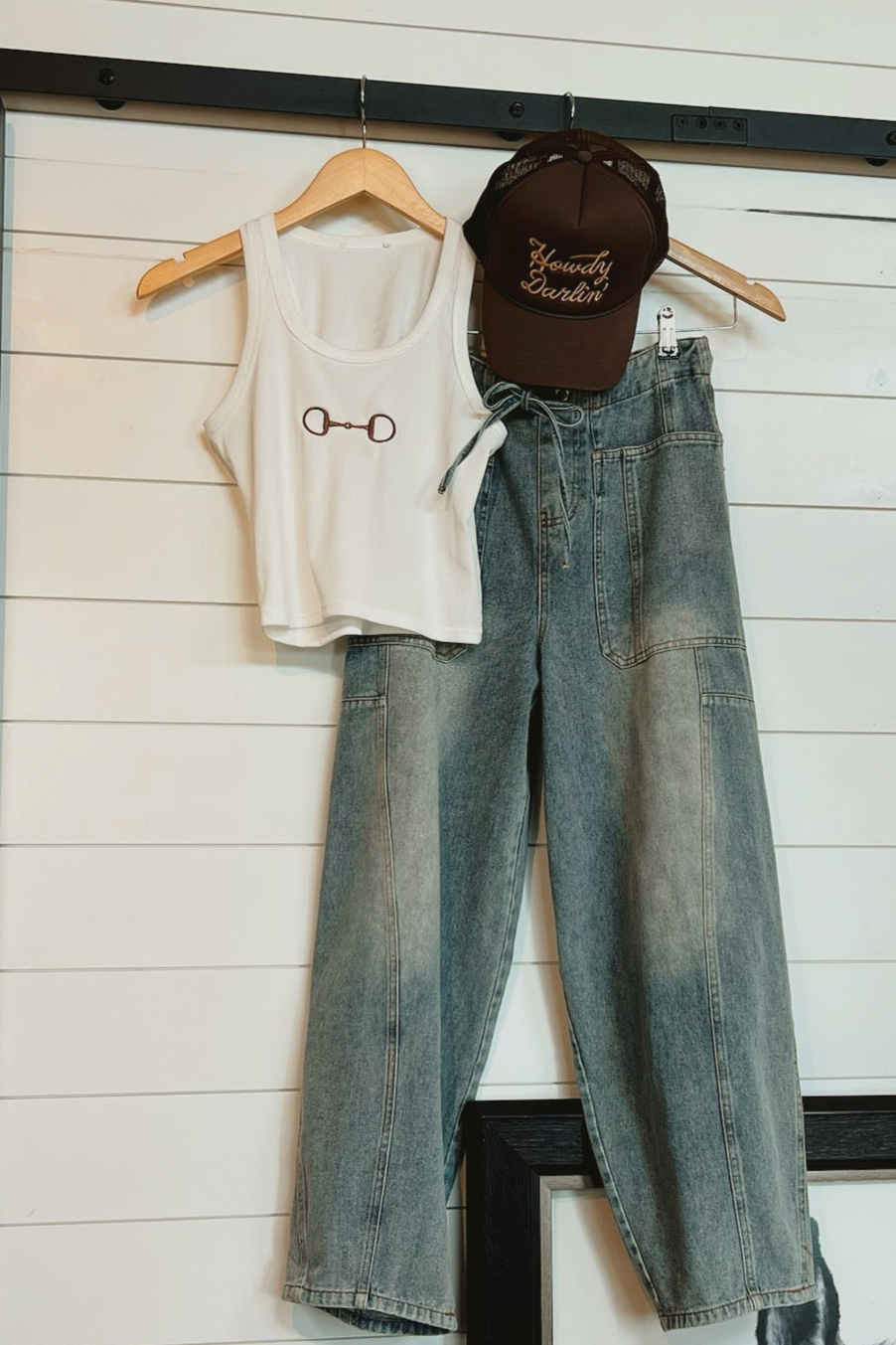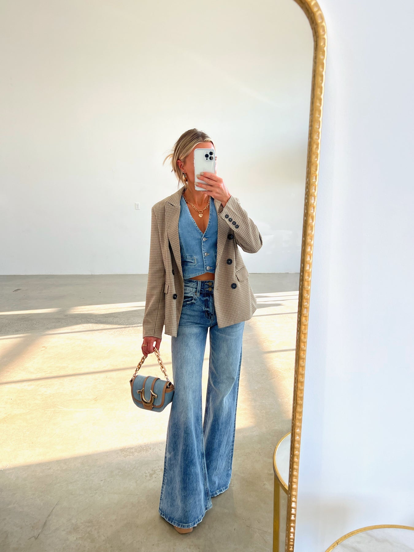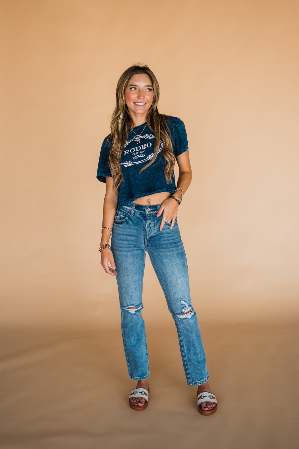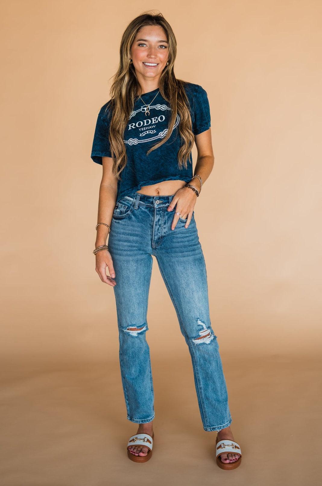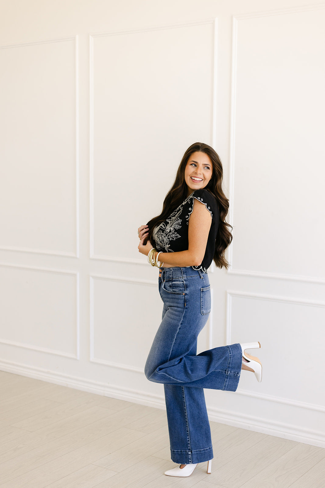 A high waisted, premium denim, vintage-wash wide leg trouser featuring a double button closure detail. With an 11" rise and 34" inseam, these jeans can go from the office to the arena with ease.