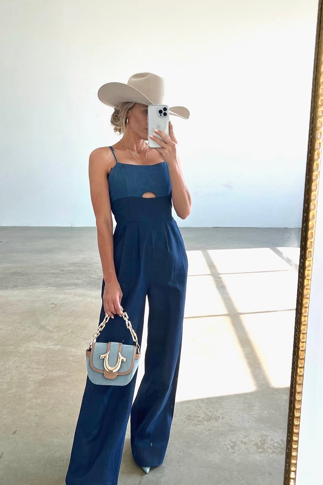 Two-toned denim trendy women's jumpsuit features a stunning keyhole, spaghetti strap top and zipper closure on the backside. This denim jumpsuit flatters every curve, while the wide-leg cut and high waist elongate your frame. The square neckline and open arms give it a sleek, feminine edge making it the perfect western fashion jumpsuit.