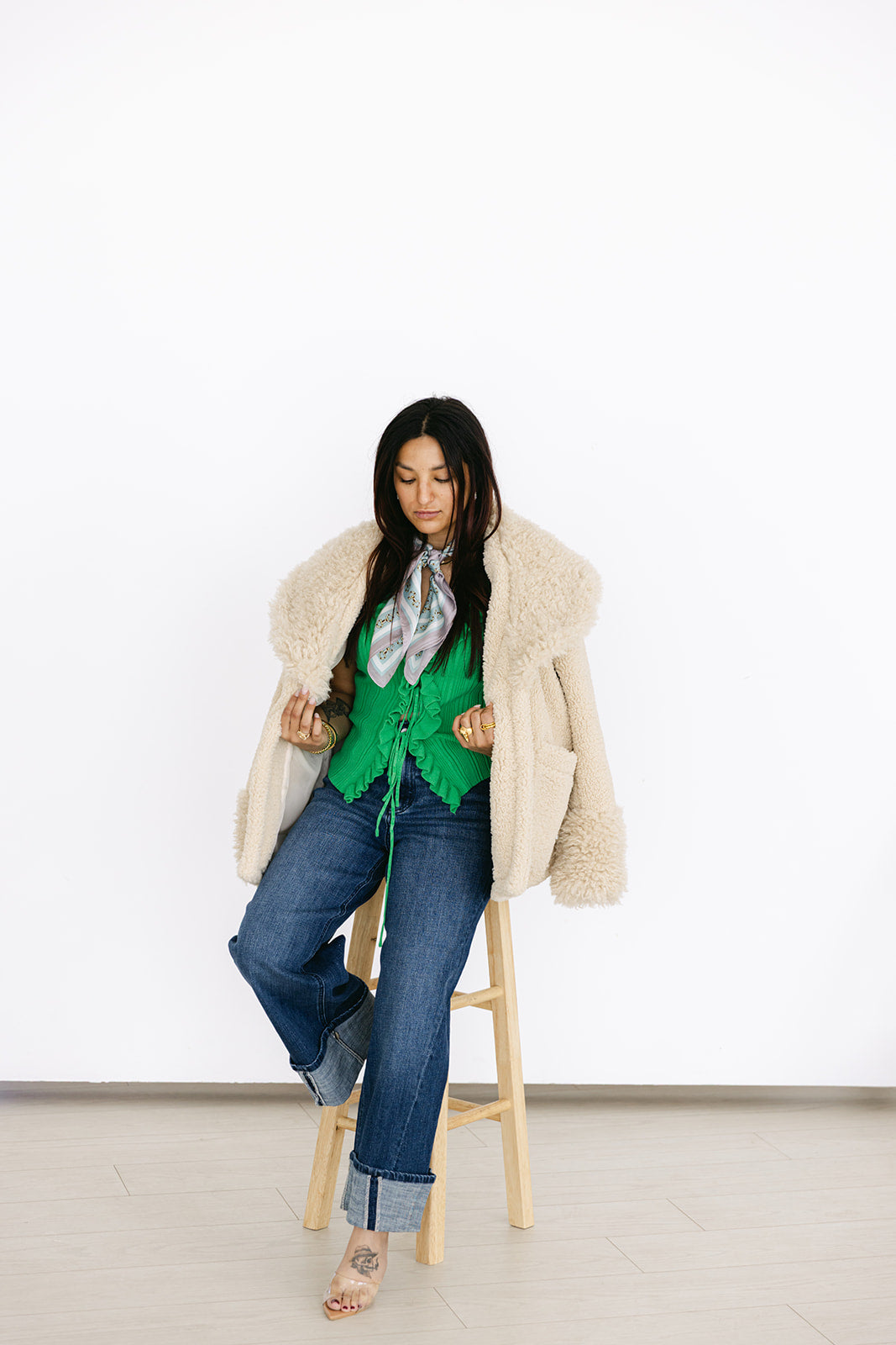 Exaggerated cuffs and pointed collar for high-fashion edge