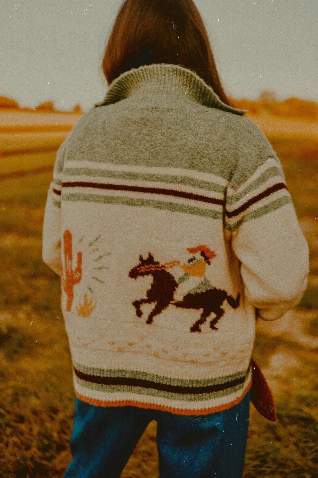 Horse Jacquard shawl knit cardigan with back horse detail.