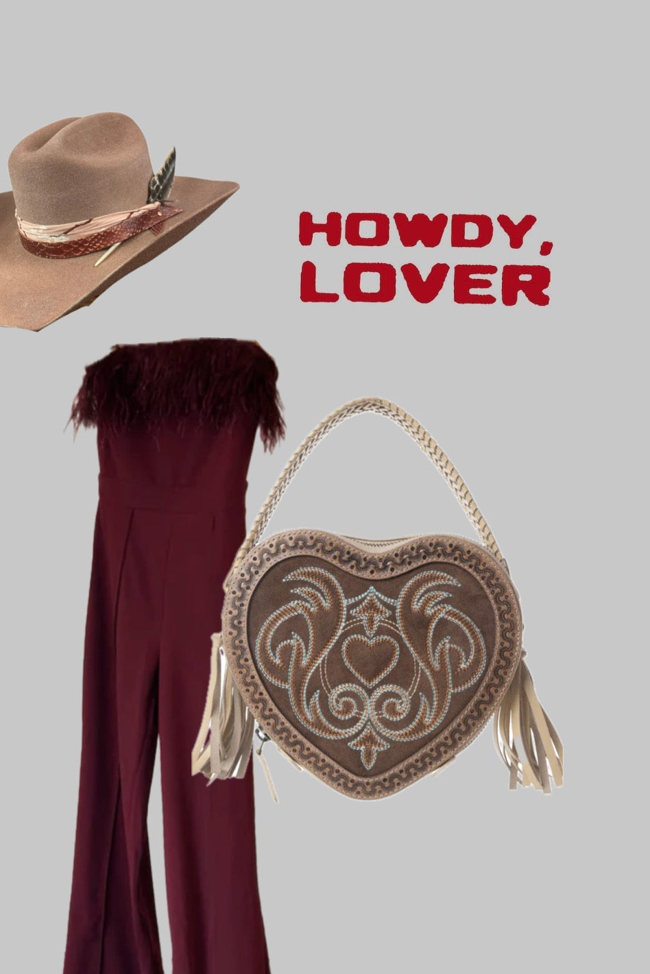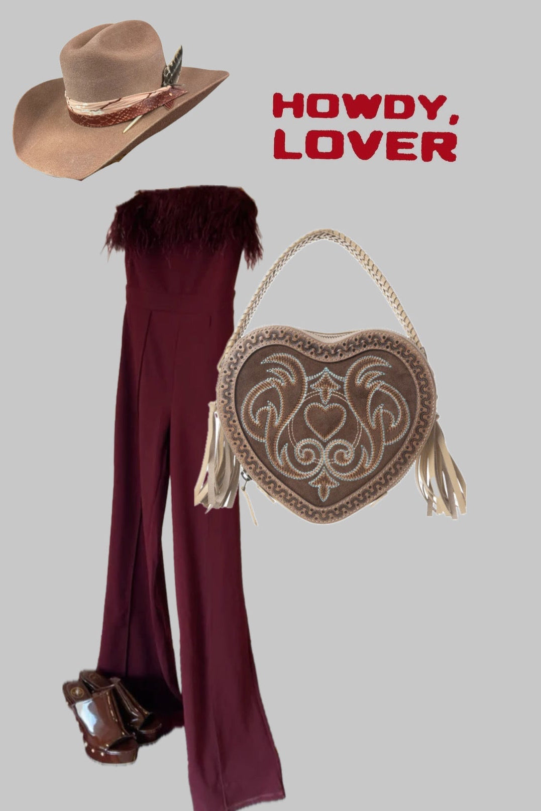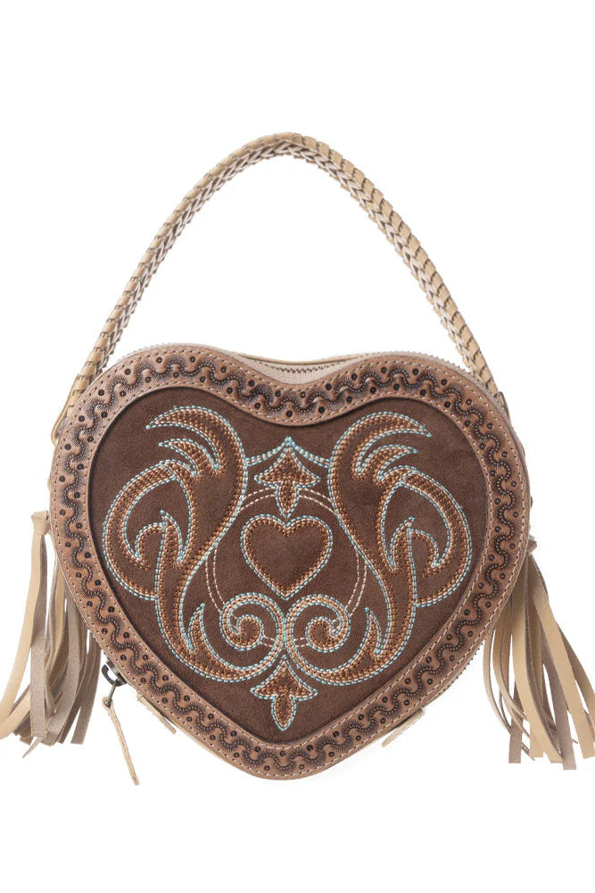 This charming heart-shaped bag is a beautiful example of handmade western style, crafted as one of our standout hand tooled bags. Rich brown leather is carved with flowing scrolls and a central heart motif, edged with scalloped stitching and accented with long fringe tassels for that true ranch-and-rodeo feel. A braided, adjustable stripe shoulder strap gives you a comfy, customizable carry while the thoughtful inside zipper pocket keeps your small essentials safe and organized. Simple, sturdy, and full of personality, this hand tooled leather purse blends classic craftsmanship with practical everyday use.