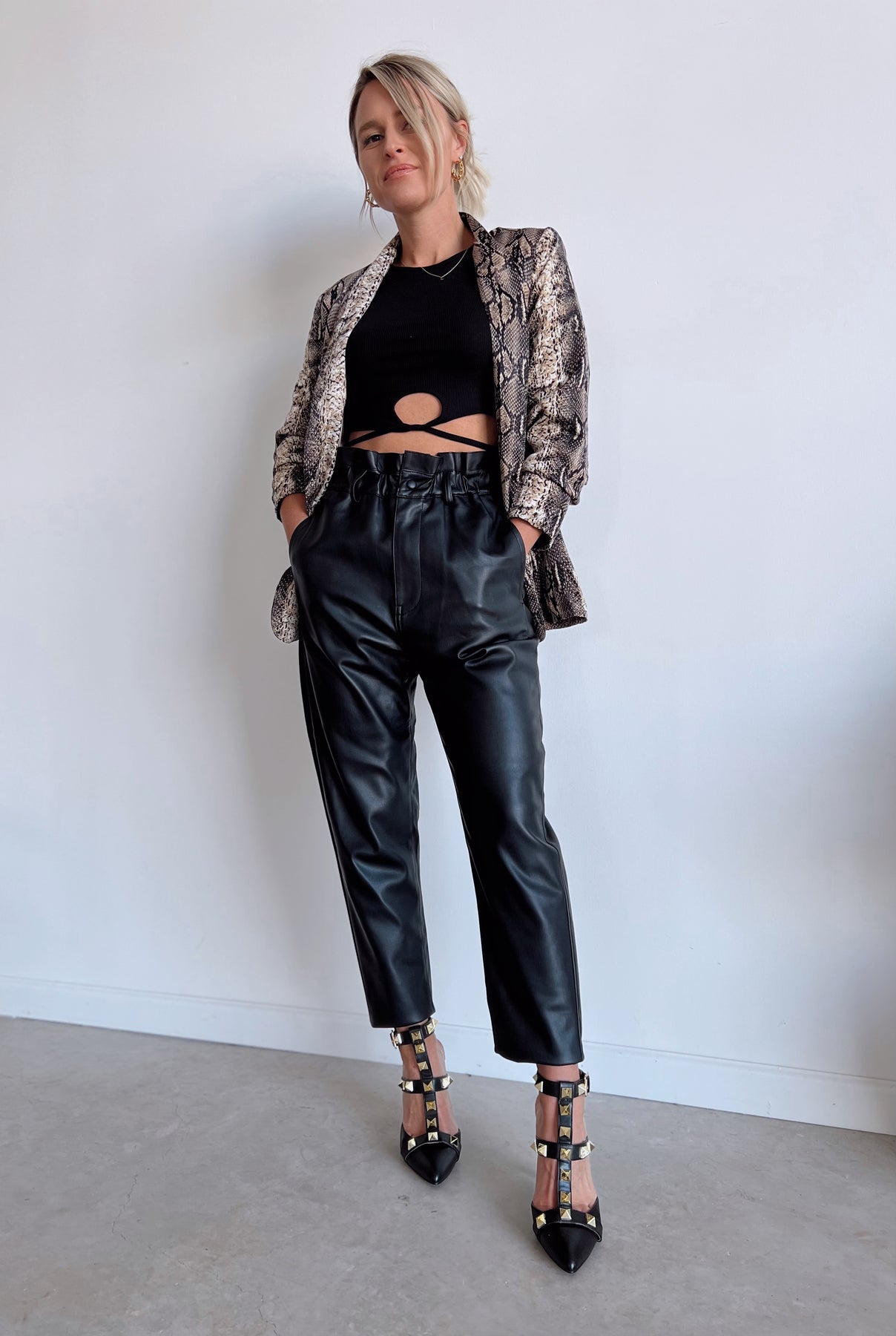 This matching set features a strapless, ruched crop top with an overlapping bodice and coordinating high-waisted wide-leg pants. The elastic waistband adds comfort, while the structured silhouette keeps it effortlessly on-trend.