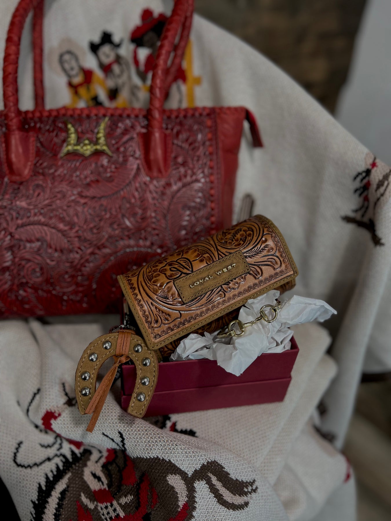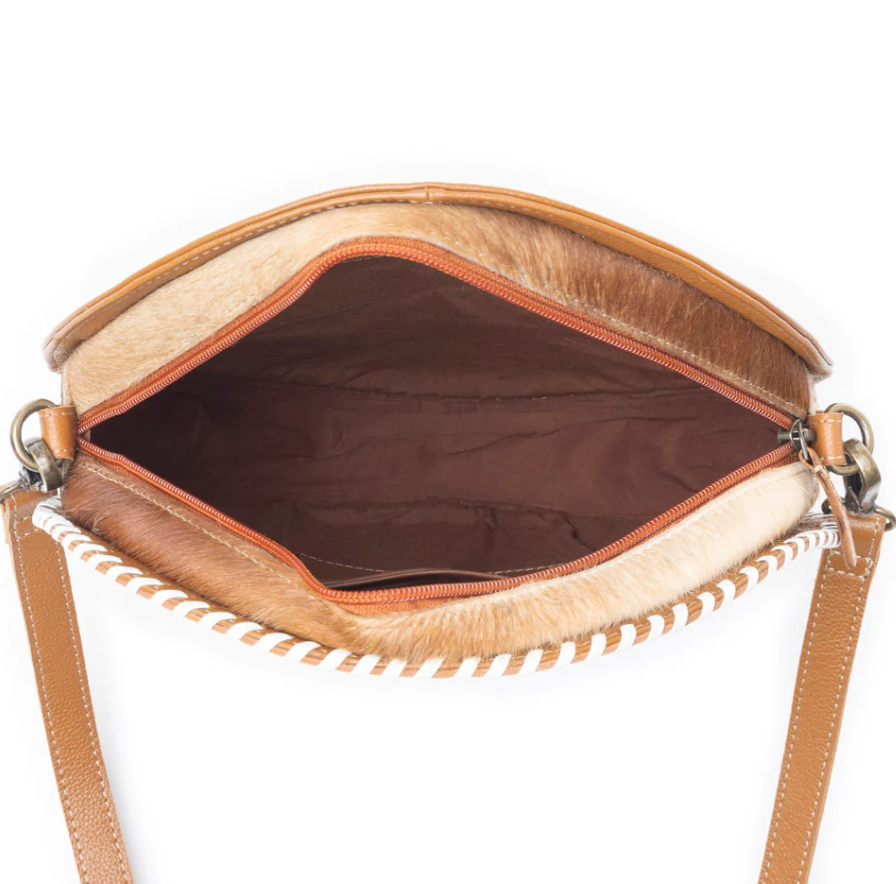 The Hide and Fringe Medium Cowhide Purse in calfskin combines rustic western charm with refined craftsmanship. The intricate tooling on the flap and the fringed accents add a playful, bohemian flair, while the hair-on leather enhances its rich texture and unique appeal.