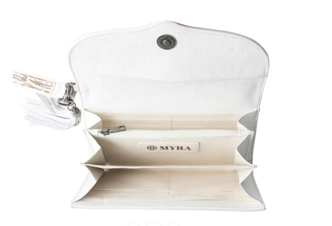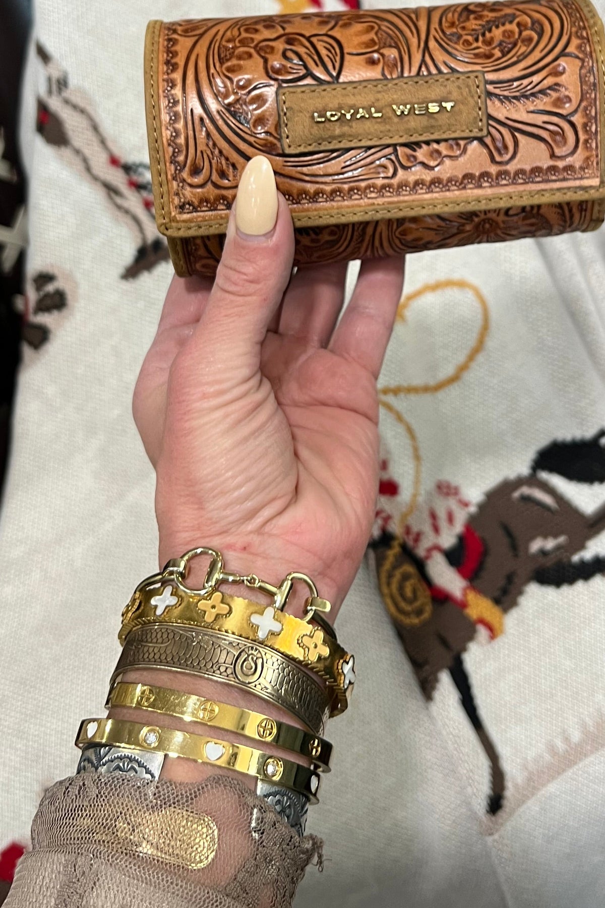 The Webster Wallet combines timeless design with functional features, offering a perfect blend of style and practicality. This western leather wallet combines exquisite hand tooled leather detailing with classy black & white hairon hide. The compact size and thoughtfully organized compartments allow this ladies western wallet to fit seamlessly into your pocket or bag, ensuring easy access to essentials. Whether you’re off to work, venturing on a trip, this Myra wallet is a stylish and functional accessory.