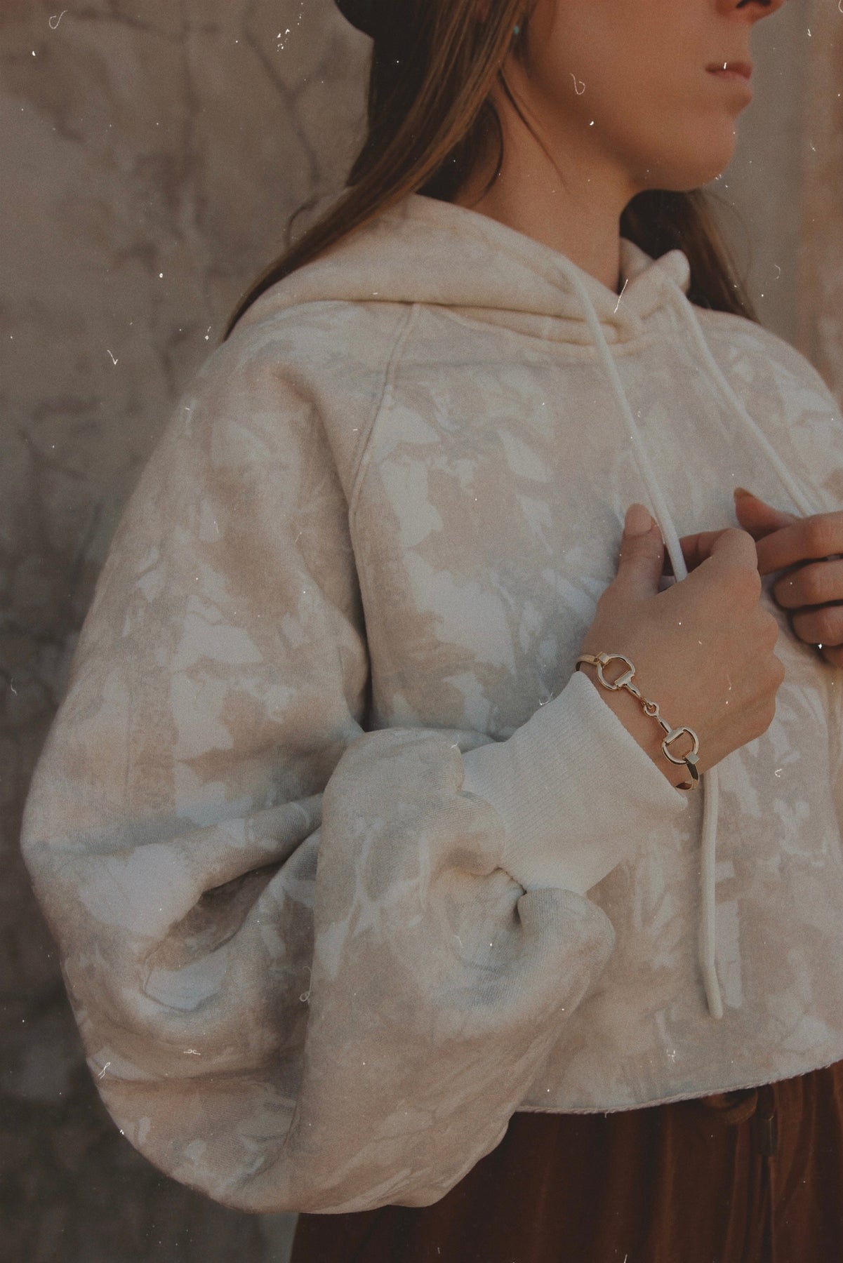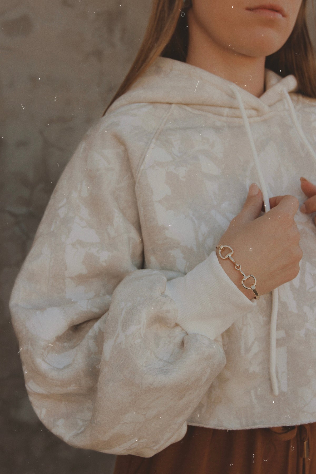 Sleek and minimal with a rustic twist, this Western bit bangle bracelet features an equestrian-style horse bit detail at the center. Material: Zinc, Brass Size: 2.5"