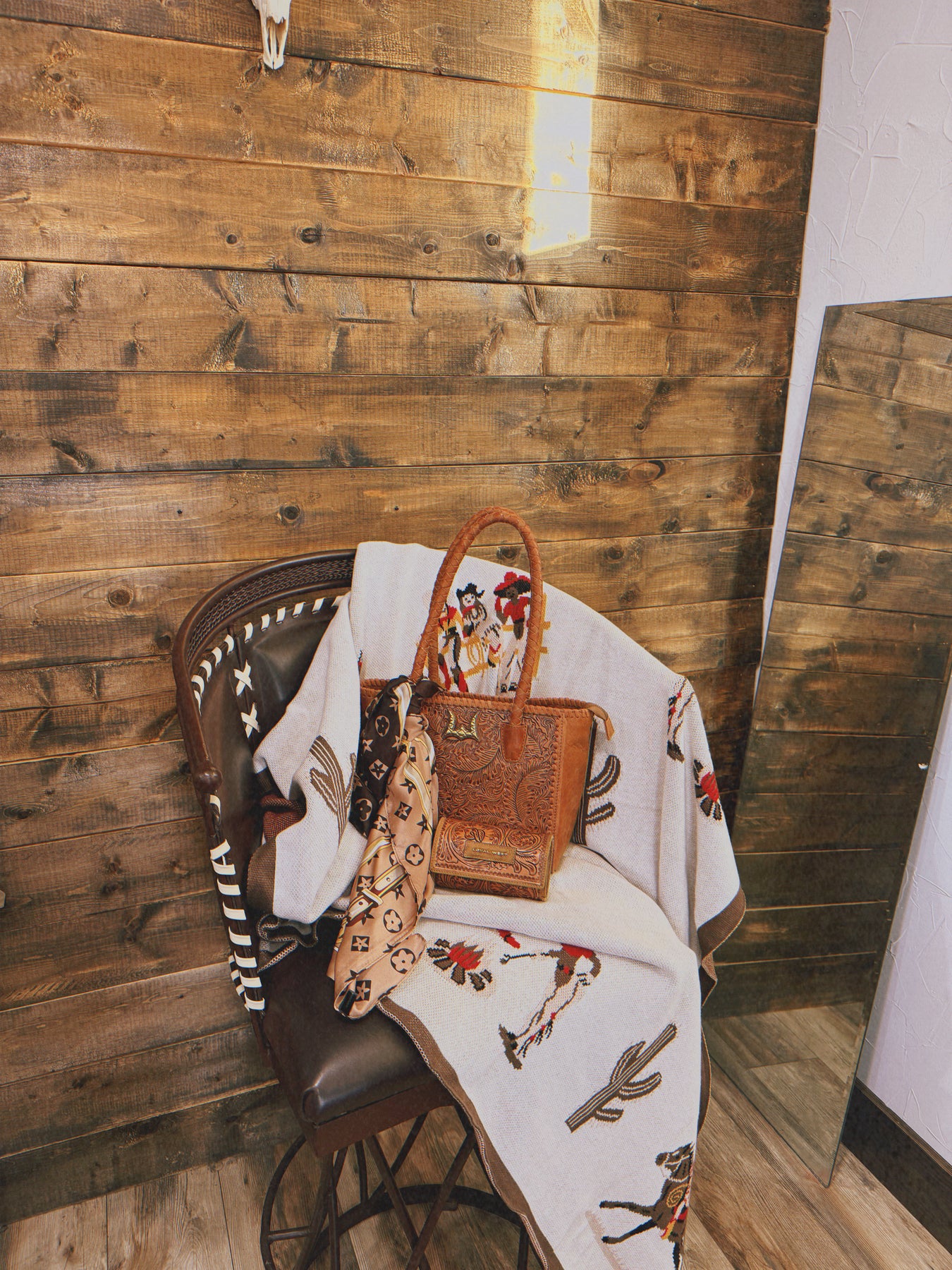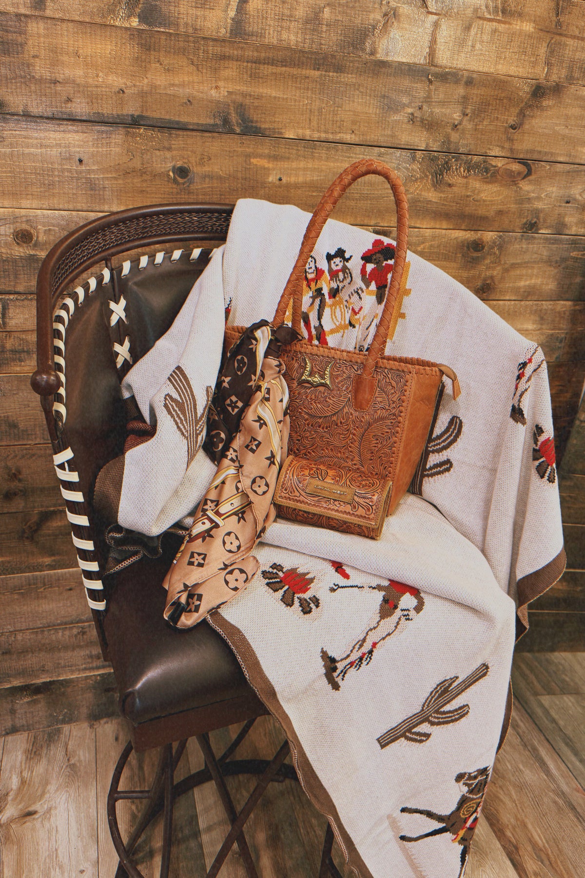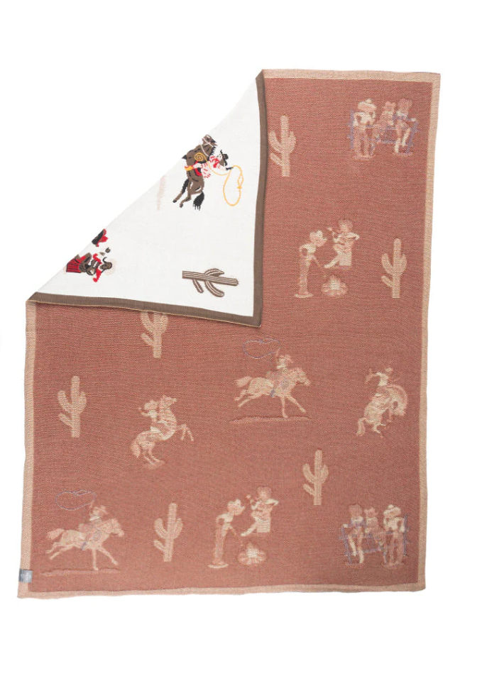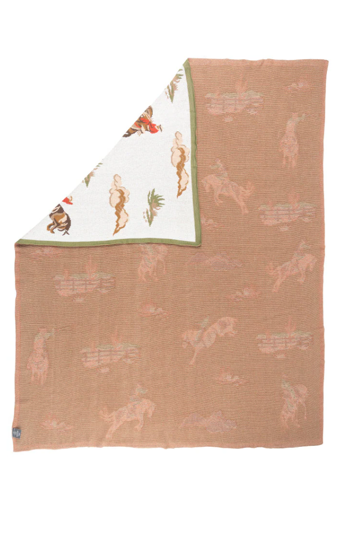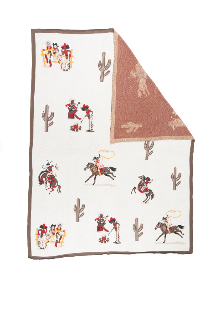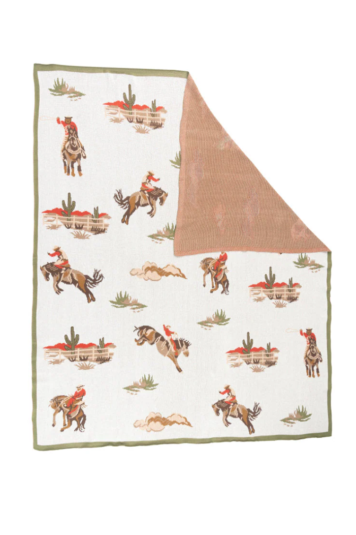 xperience the rugged charm of the Old West with this premium western print blanket featuring vibrant cowboy scenes against a natural canvas backdrop. The meticulously crafted western pattern showcases bronc riders, cactus landscapes, and desert elements framed by an olive border. Perfect for adding rustic throws to your home decor collection, this conversation-starting cotton masterpiece blends nostalgic ranch life with contemporary style. Each authentic design celebrates the adventurous spirit of frontier America.