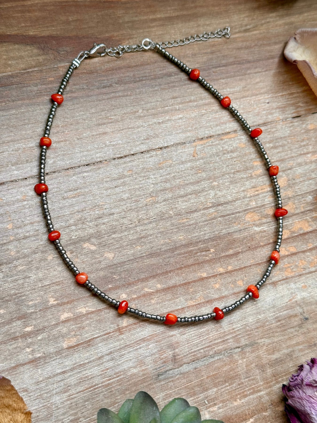 This Antique Silver Seed Bead & Dyed Red Coral Choker is a vibrant, handcrafted piece made by The Bijoux FAB. Designed with antique silver seed beads and rich red coral accents, this 14-inch choker adds the perfect pop of color and texture to any outfit — from Western fashion to everyday casual looks.