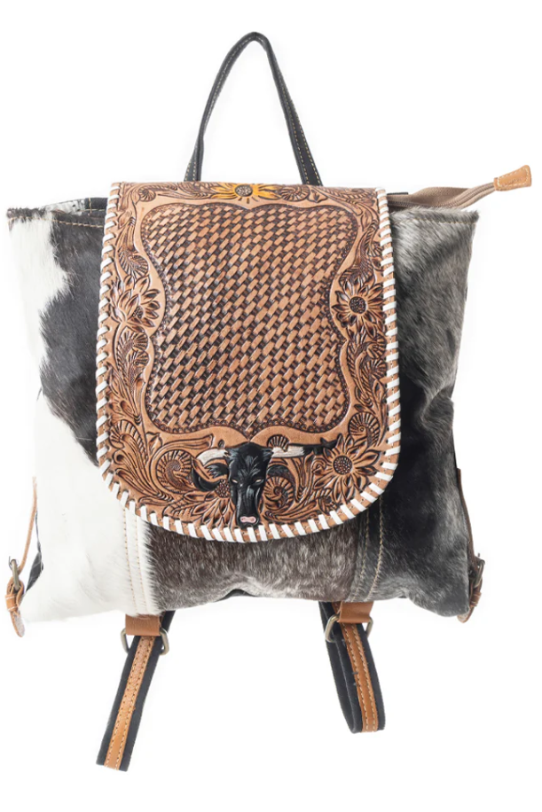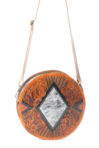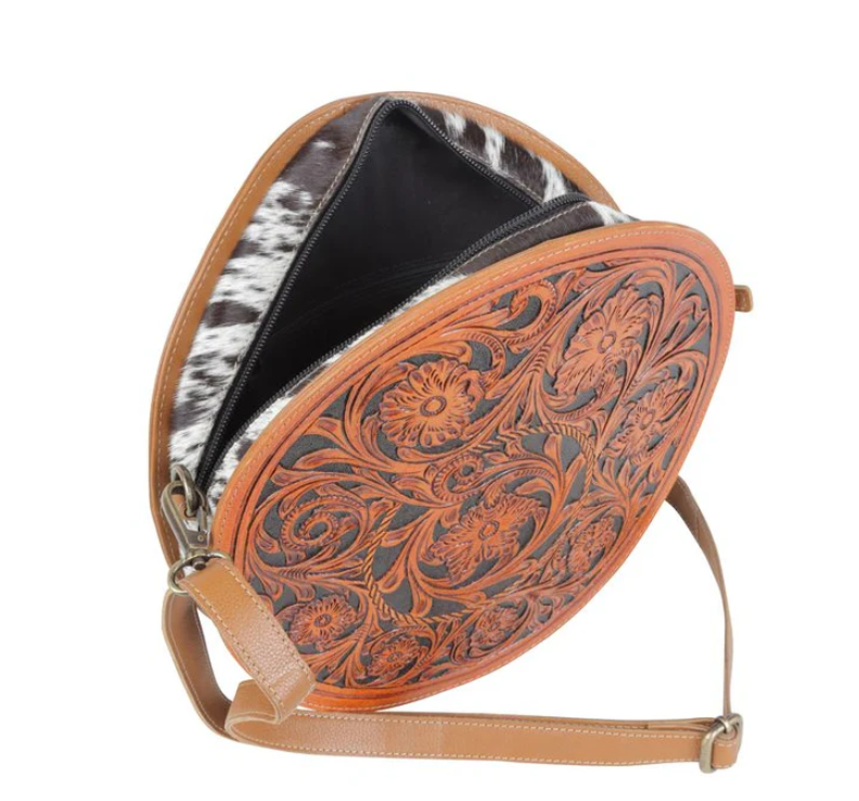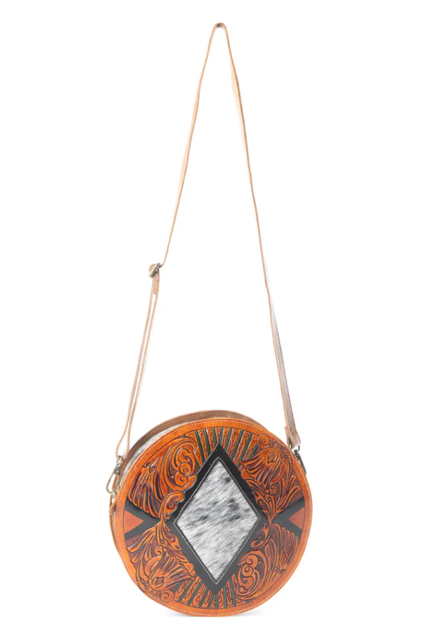 Inspired by Western artisanal elegance, this captivating tooled handbag from Myra is a timeless companion for your journeys near and far. Featuring intricate hand tooled leather details and hairon accents, this bag showcases the perfect blend of rustic charm and sophistication. Alongside, this hairon leather bag is designed with practicality in mind, offering an inside zipper pocket and phone compartment.