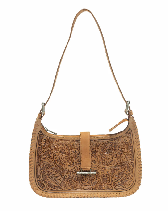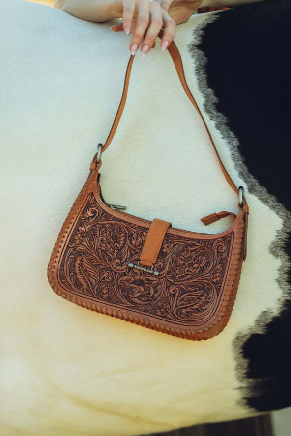 The Dannia Large Purse is a beautifully crafted shoulder bag that combines rich saddle brown handtooled leather with soft, smooth calfskin. The intricate handtooling adds a unique, artisanal touch, giving this bag an elegant and timeless appeal. Designed for everyday use, the Dannia Purse is both stylish and practical, with premium hardware that complements its luxurious materials. Perfect for pairing with casual or chic outfits, this bag effortlessly elevates any look with its refined craftsmanship and sophisticated charm.