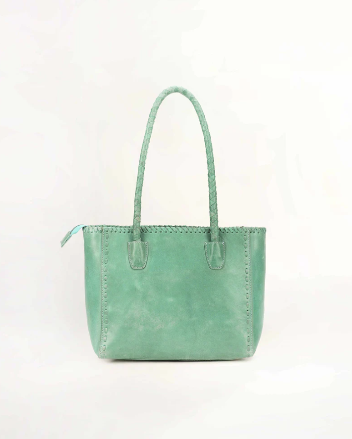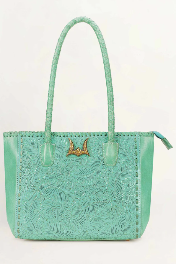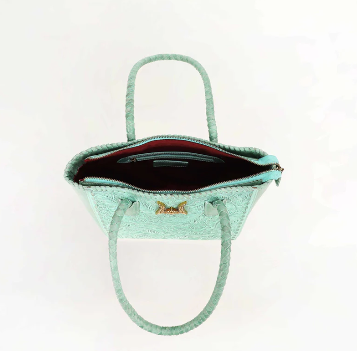 The Drover Medium Bag in turquoise handtooled leather and calfskinoffers a perfect blend of rustic charm and refined craftsmanship. The intricate handtooled detailing on the leather adds rich texture, while the smooth calfskin enhances durability and gives the bag a luxurious feel.