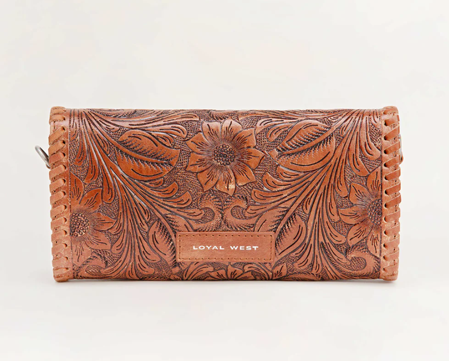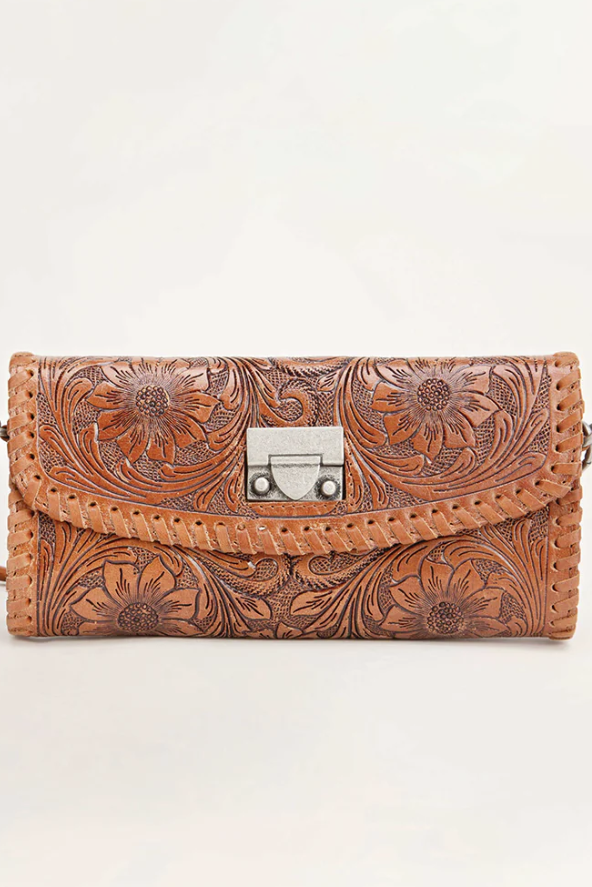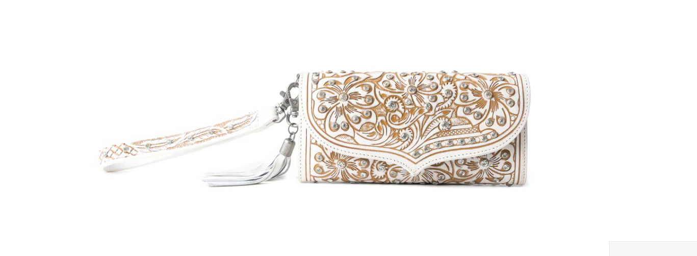 ourney into elegance with this dazzling wallet featuring the look of hand-tooled leather in desert sand and ivory. Adorned with crystal-studded desert wildflowers and flowing feather scrollwork, this Western beauty includes a matching wristlet strap and playful tassel. Perfect for the free spirit who carries a bit of desert magic everywhere. The front flap keeps the spacious interior compartments snug, while the matching wristlet carrying strap completes this gorgeous wallet.