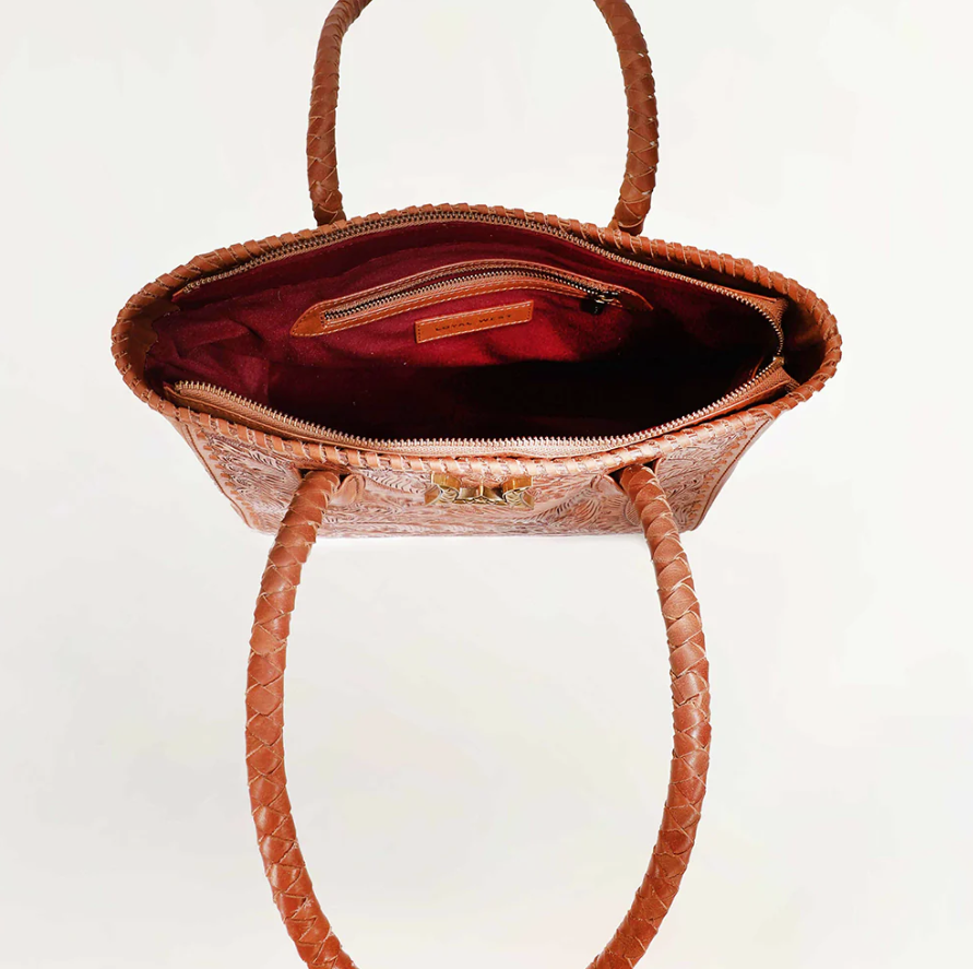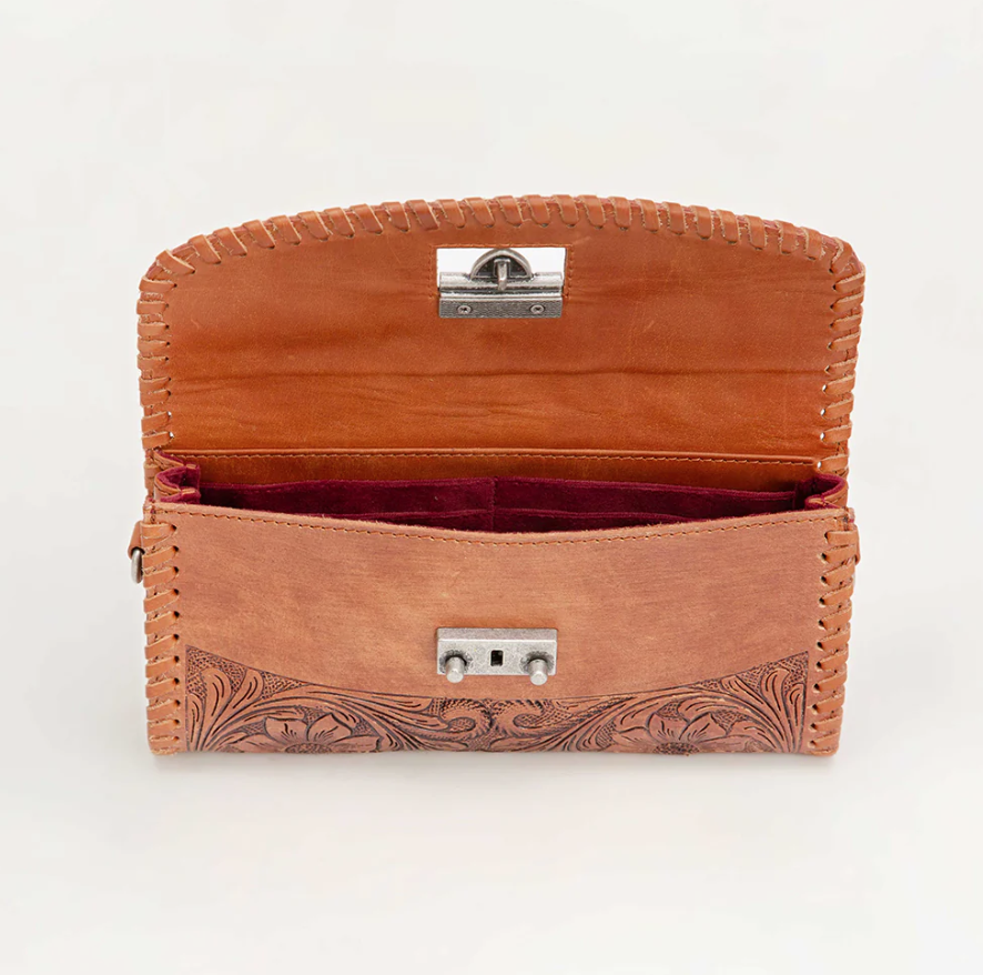 The Elena Mini Bag is a refined crossbody bag crafted from rich brown handtooled leather and soft calfskin. The intricate handtooling adds a unique, artisanal touch, while the smooth calfskin provides both elegance and durability.