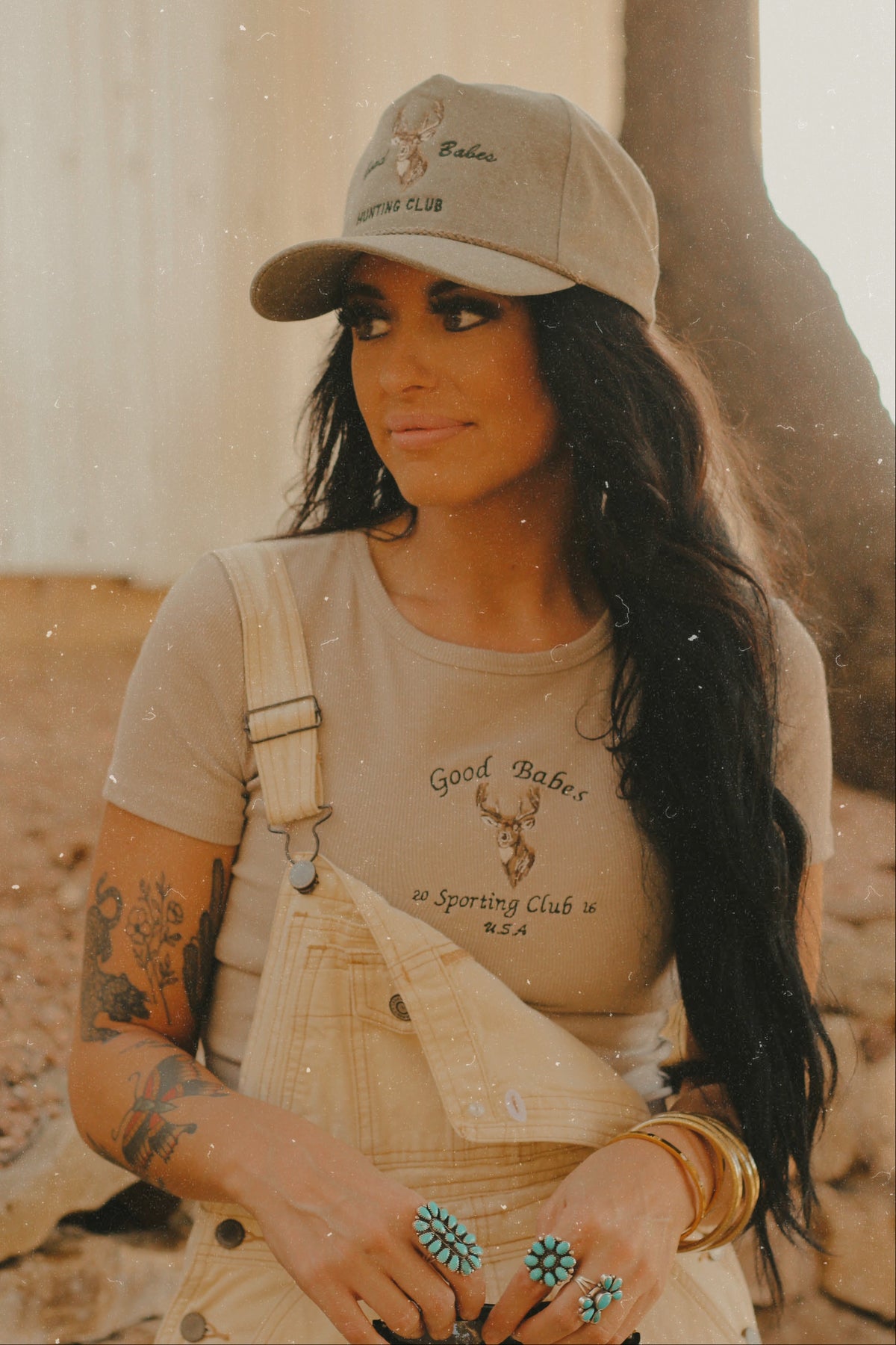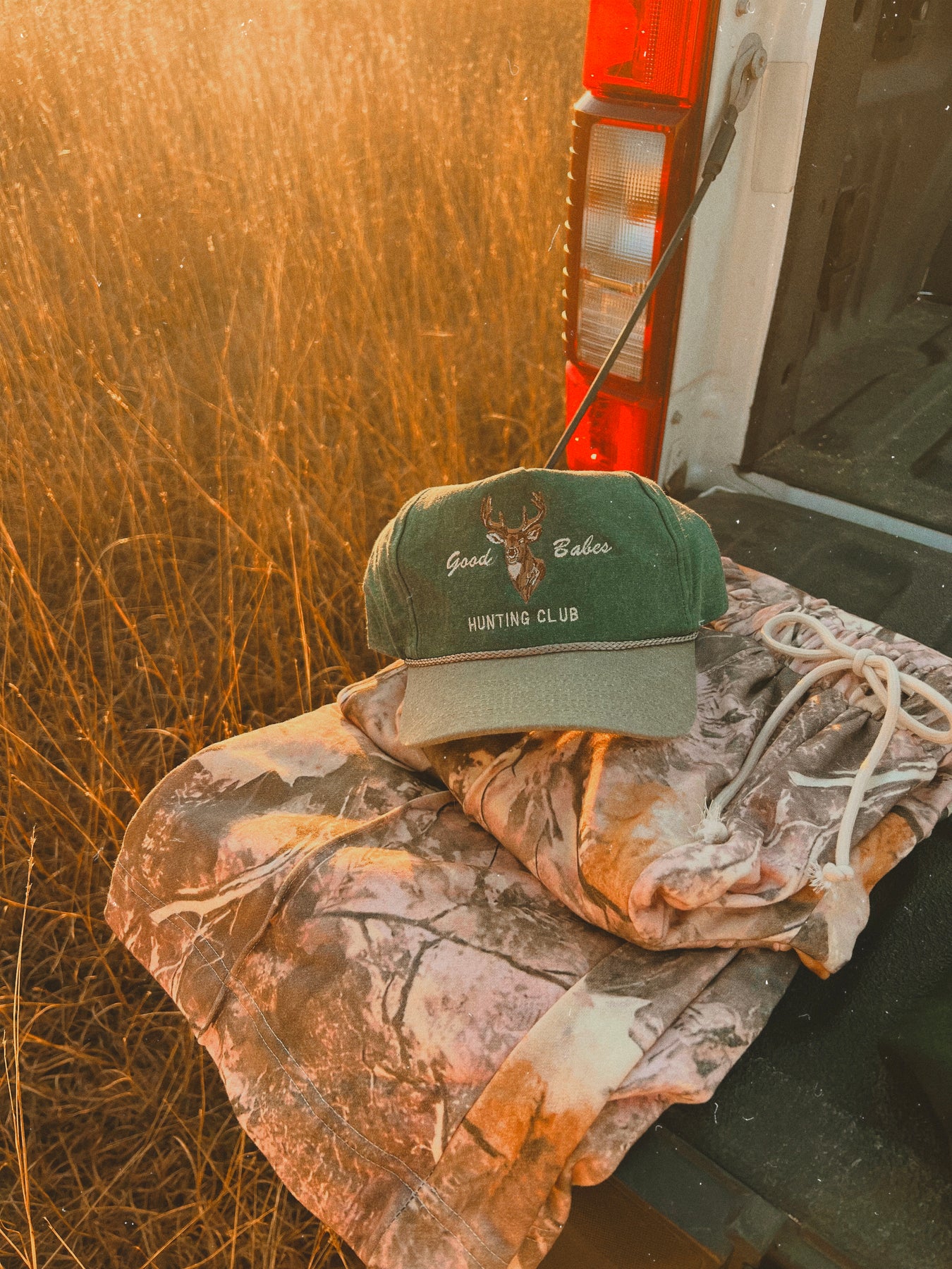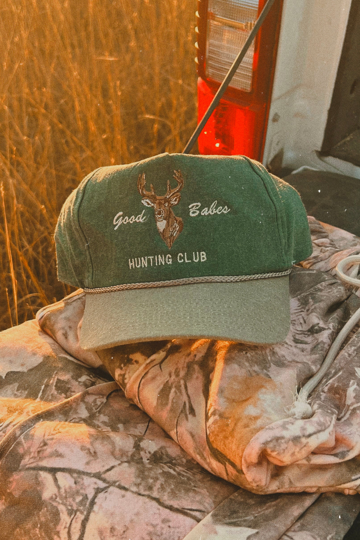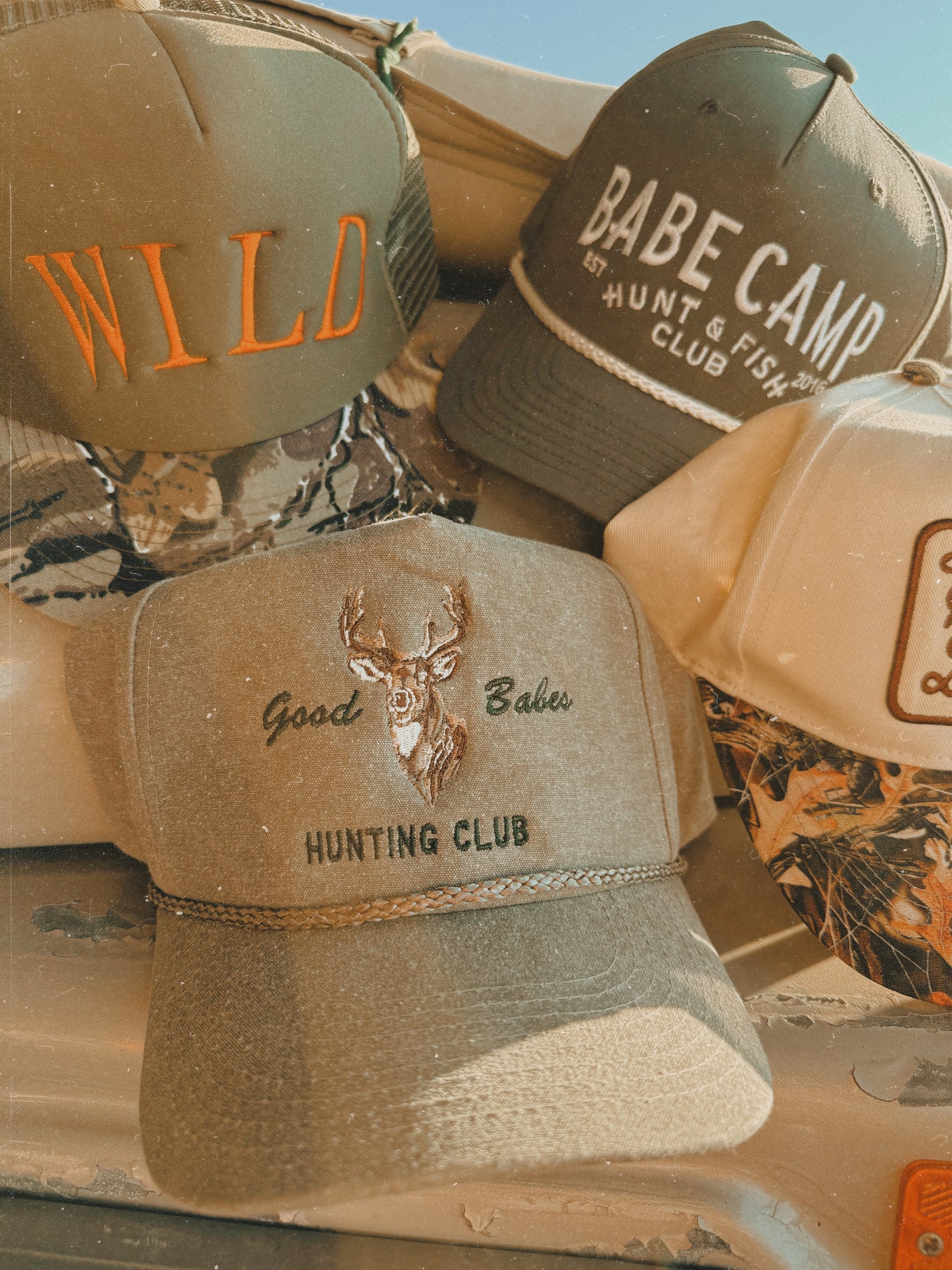 Outdoors to the bone. The Good Babes Hunting Club Trucker Hat in Olive features bold gold rope trim and a custom buck embroidery. Clean, classic, and made to stand out.