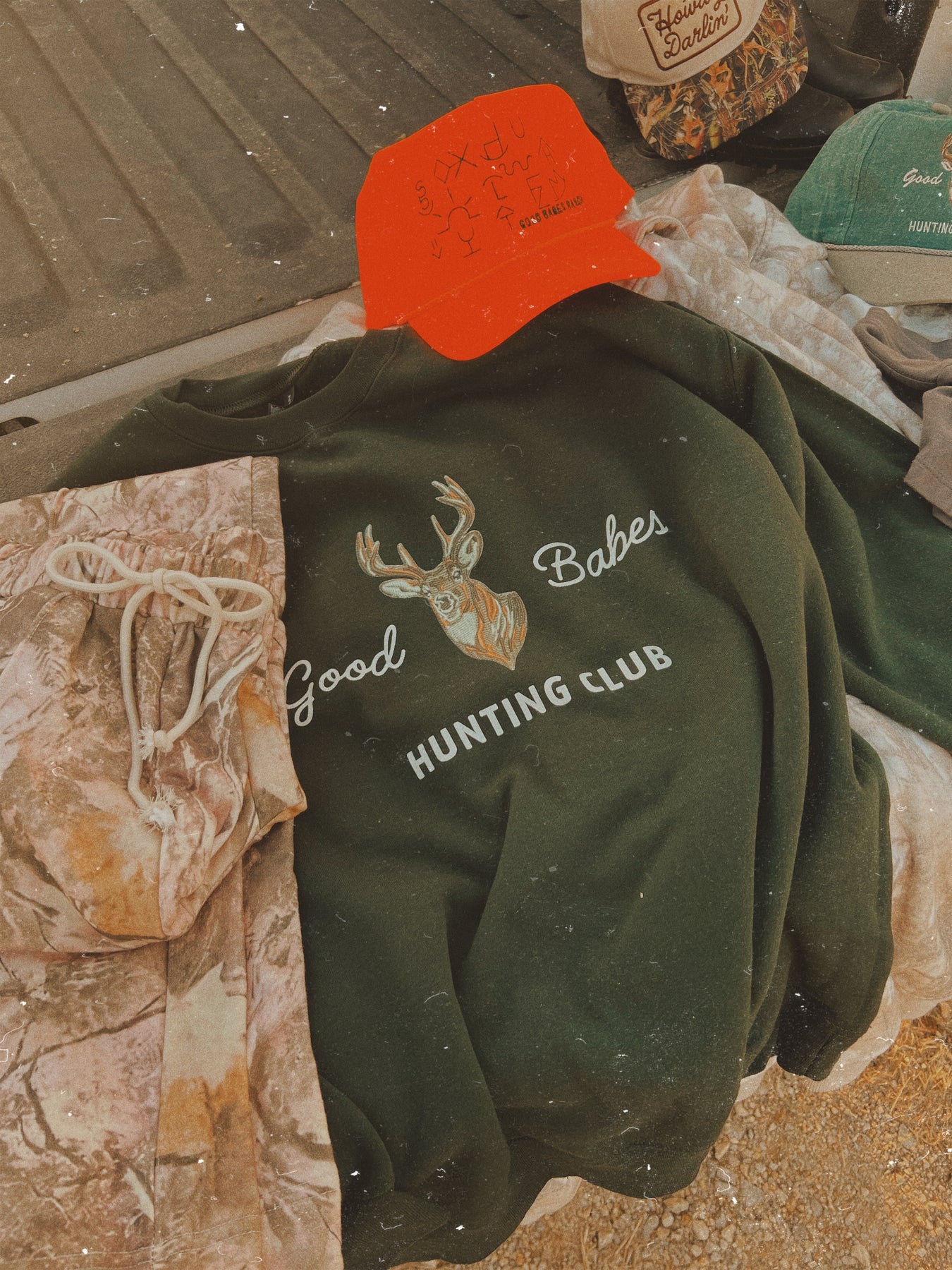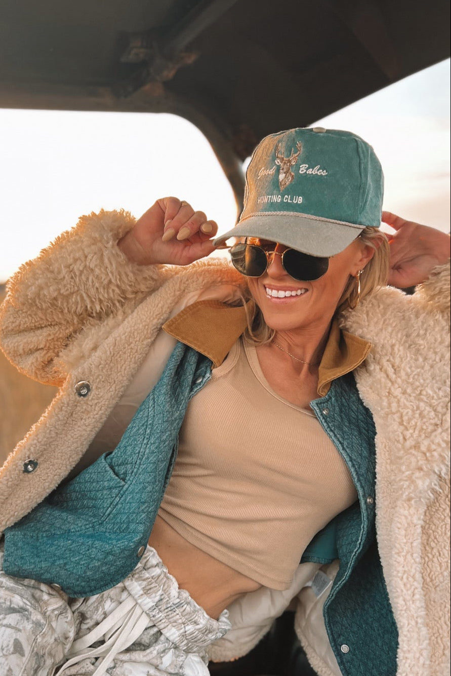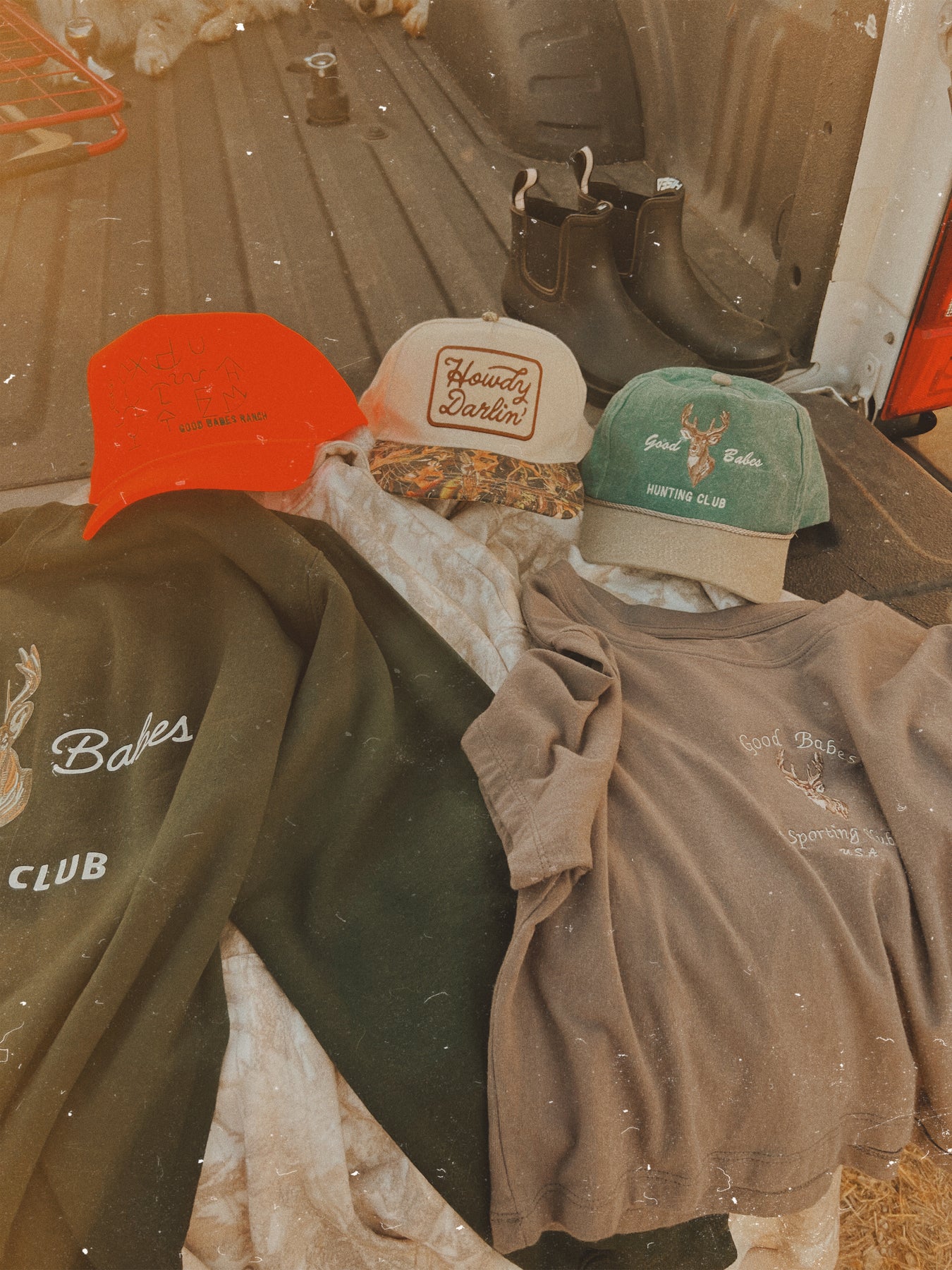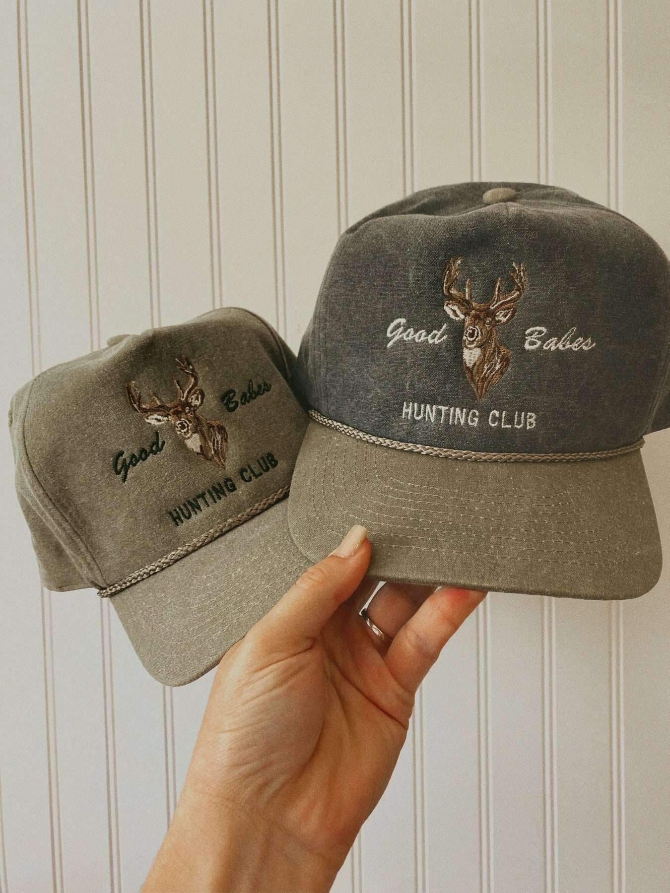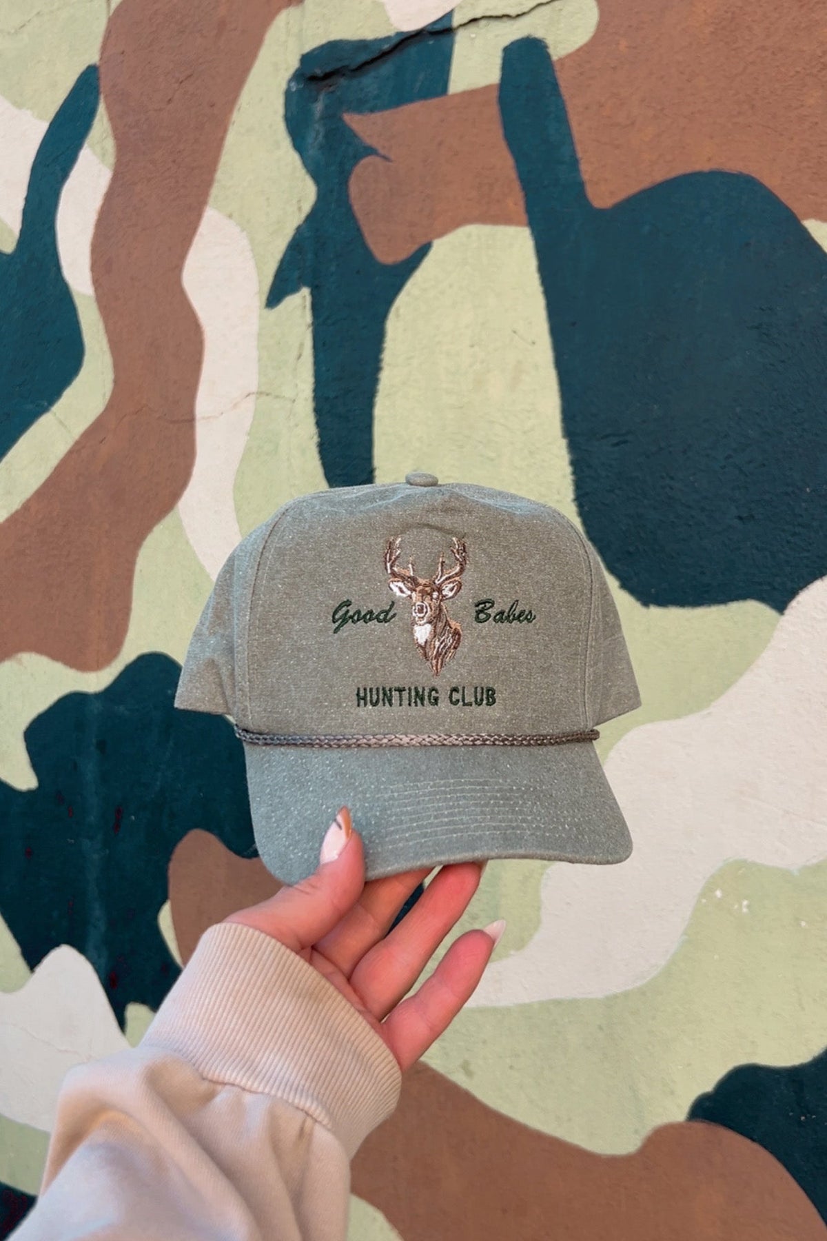 Outdoors to the bone. The Good Babes Hunting Club Trucker Hat in Olive features bold gold rope trim and a custom buck embroidery. Clean, classic, and made to stand out.
