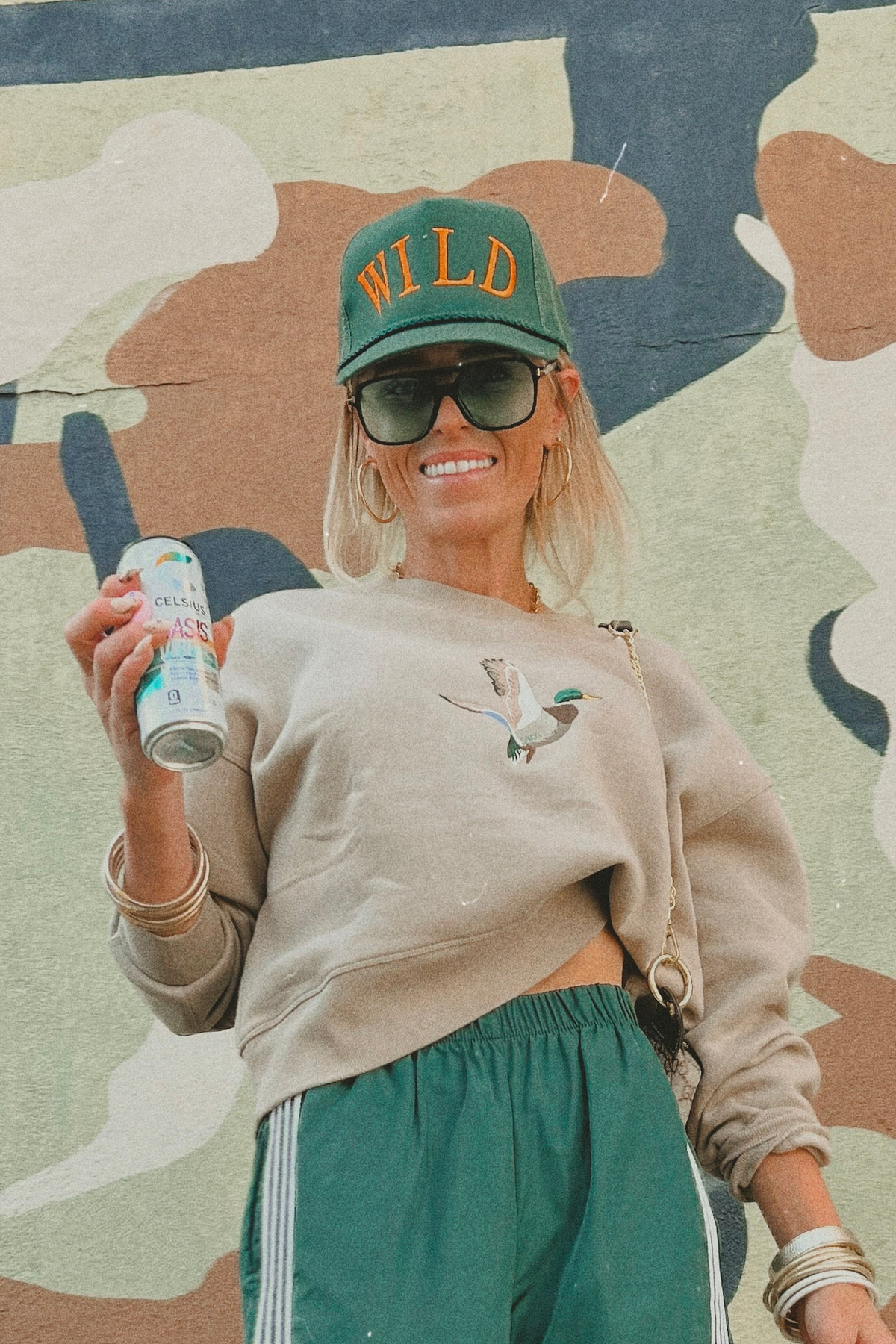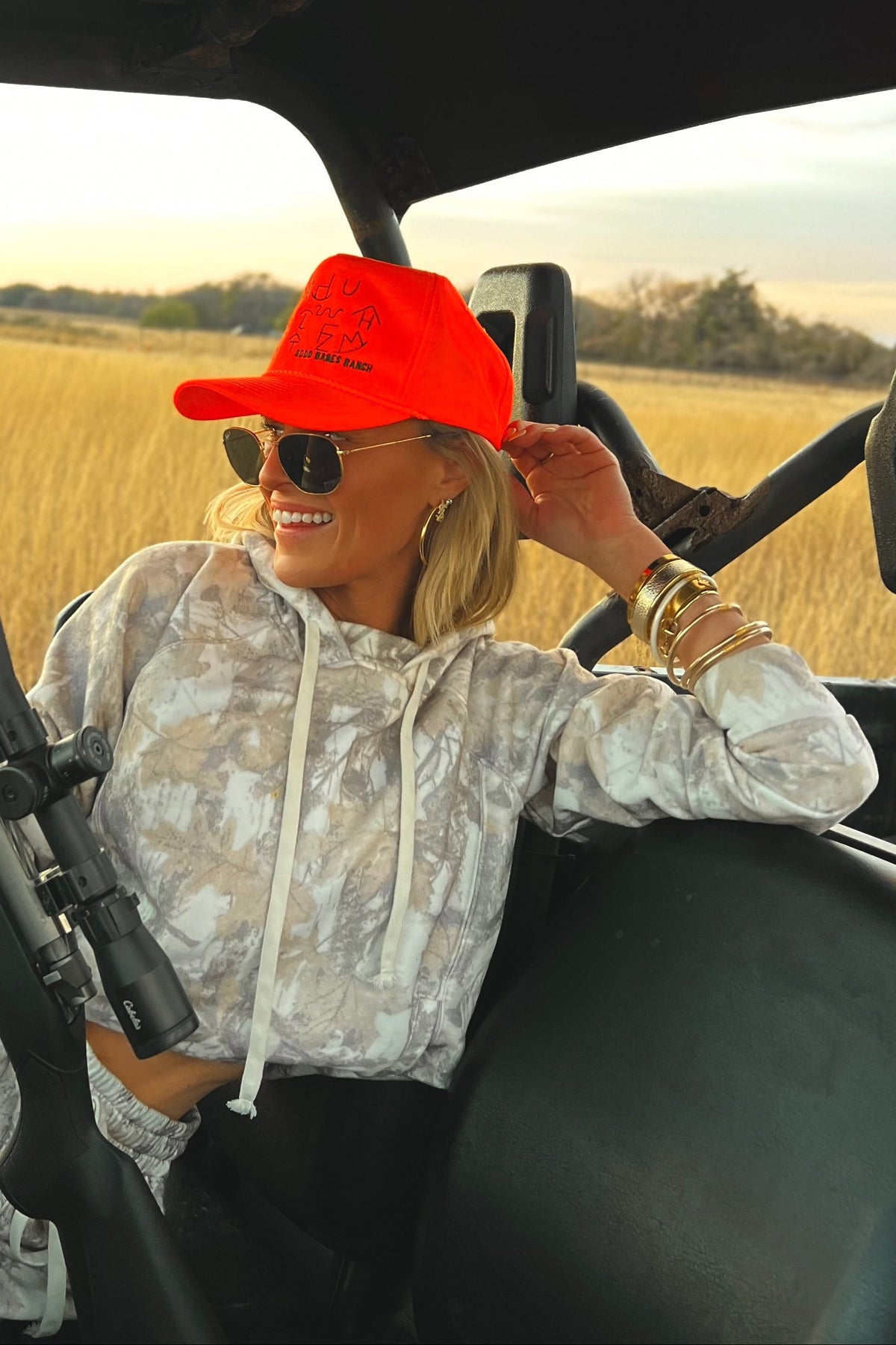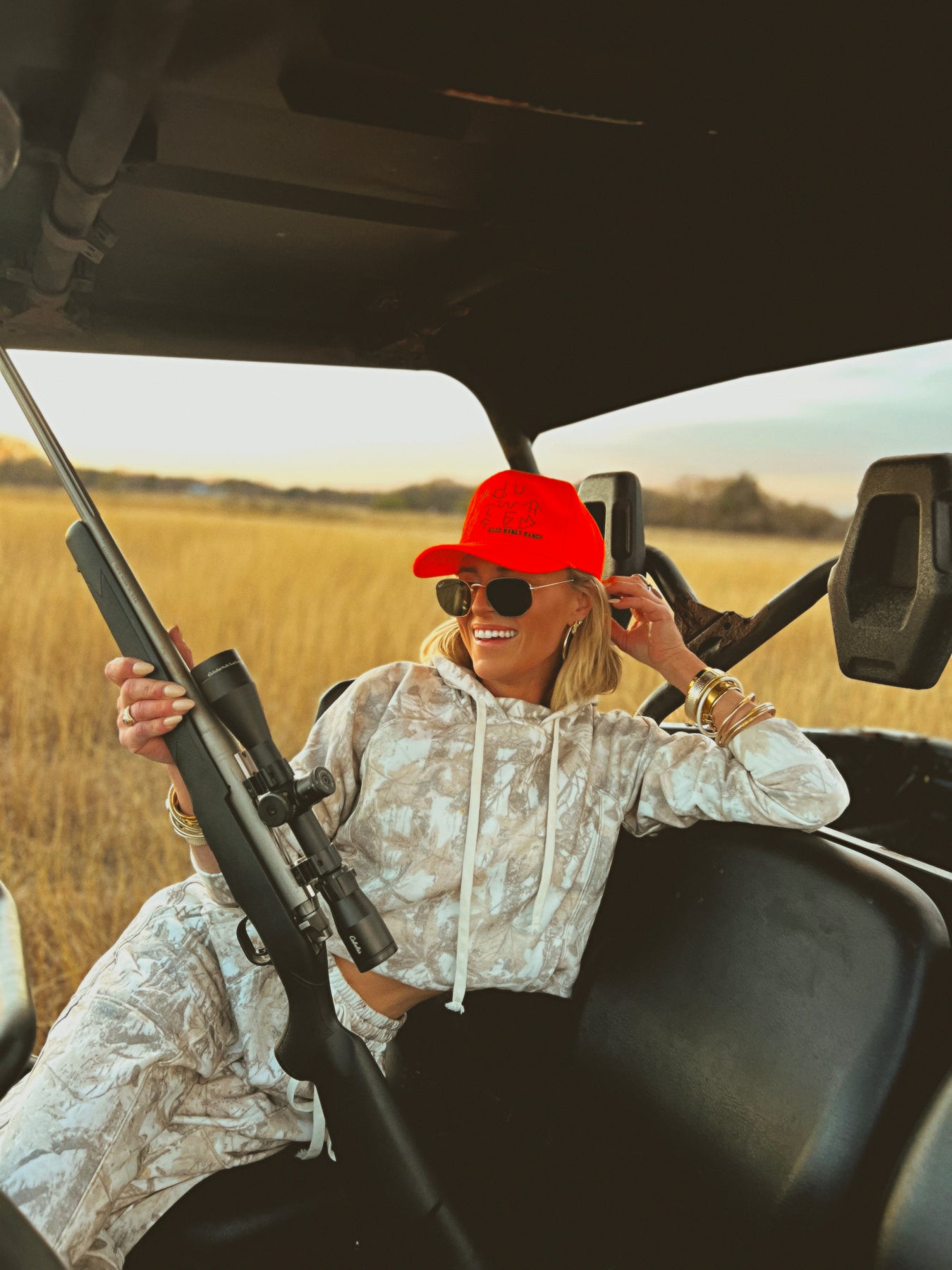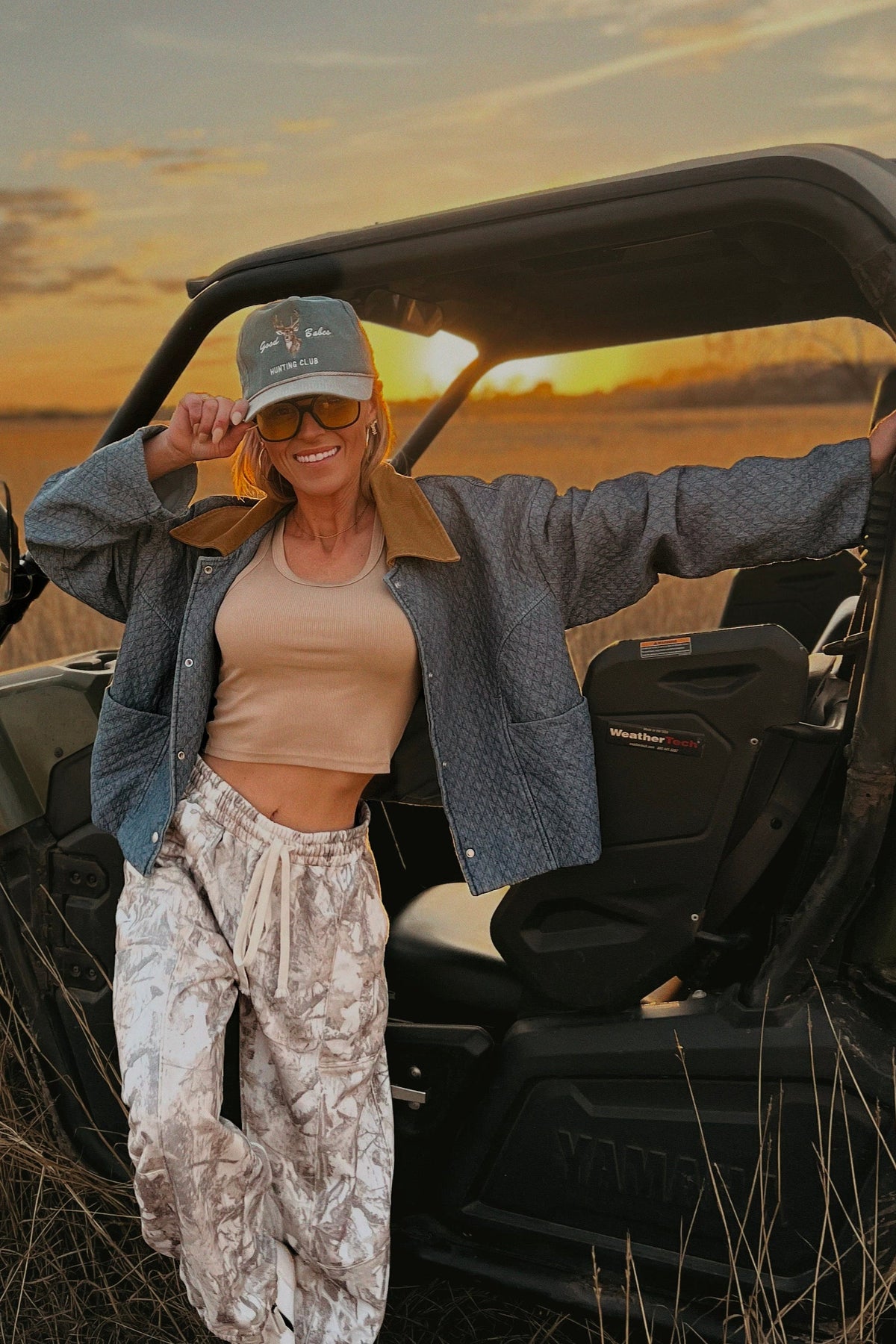 Outdoors to the bone. The Good Babes Hunting Club Trucker Hat in Olive features bold gold rope trim and a custom buck embroidery. Clean, classic, and made to stand out.