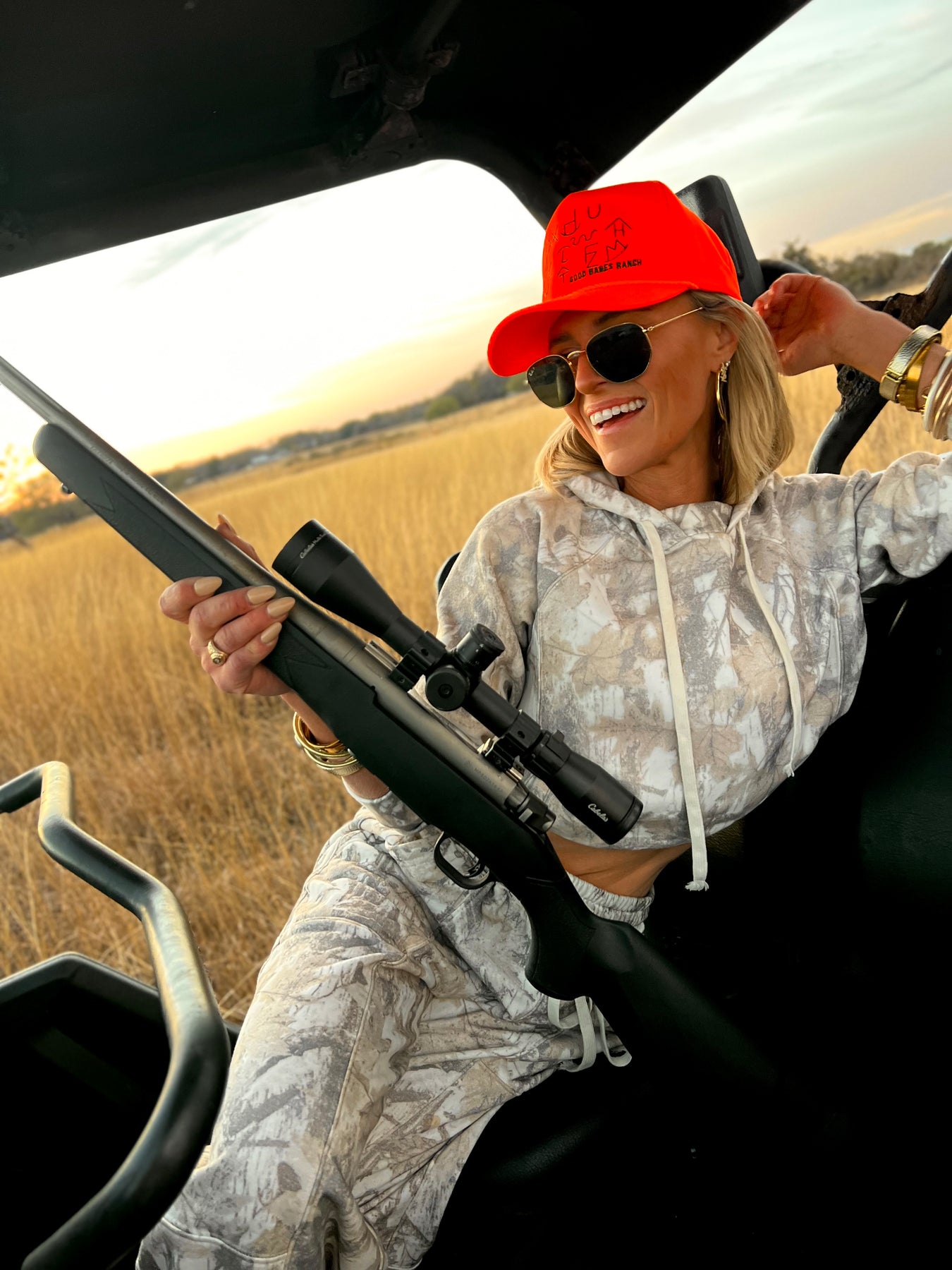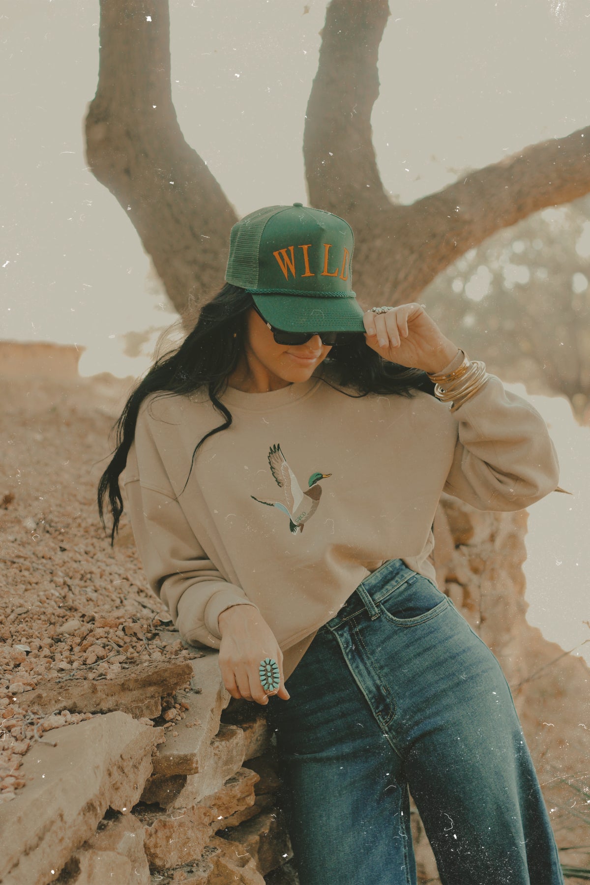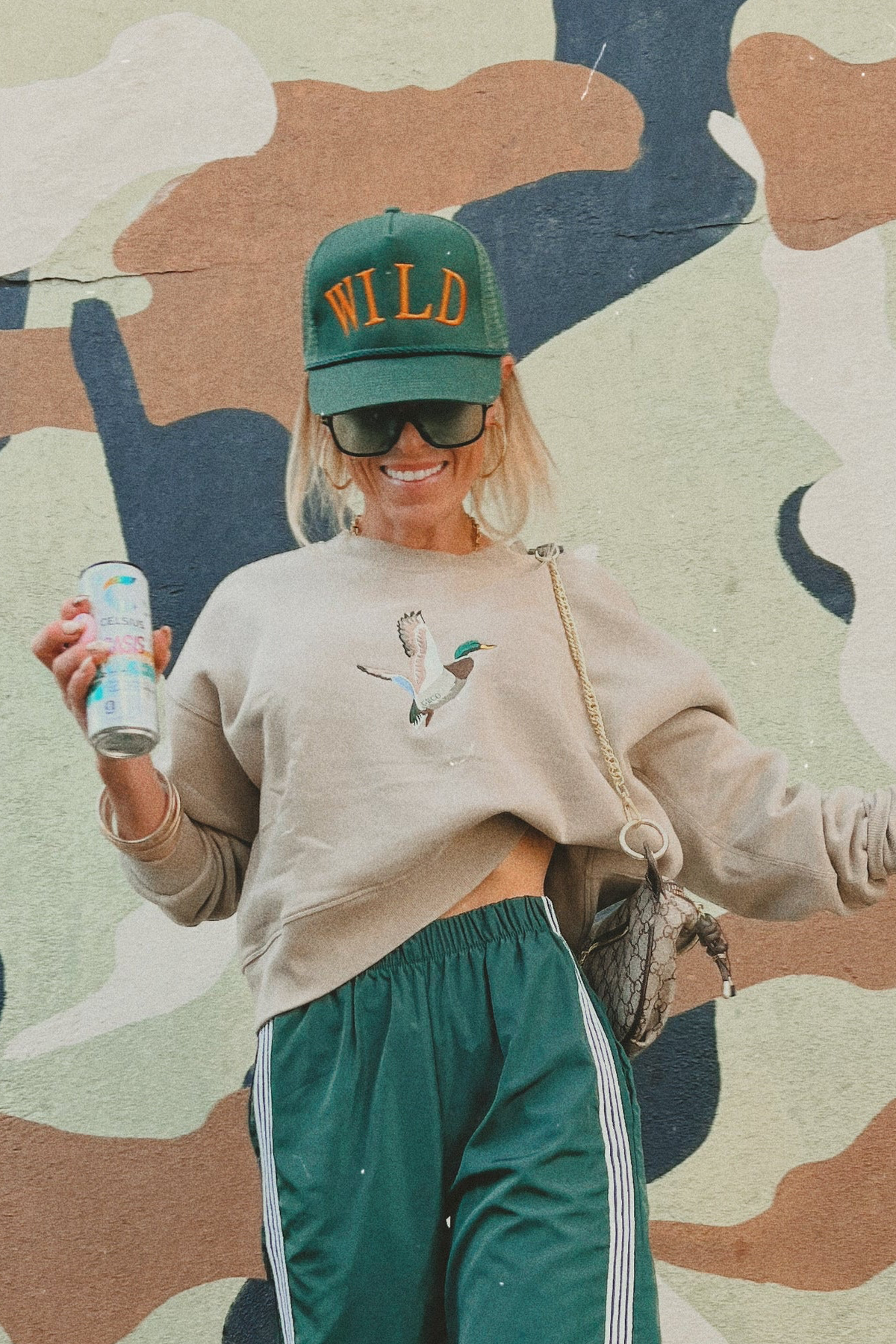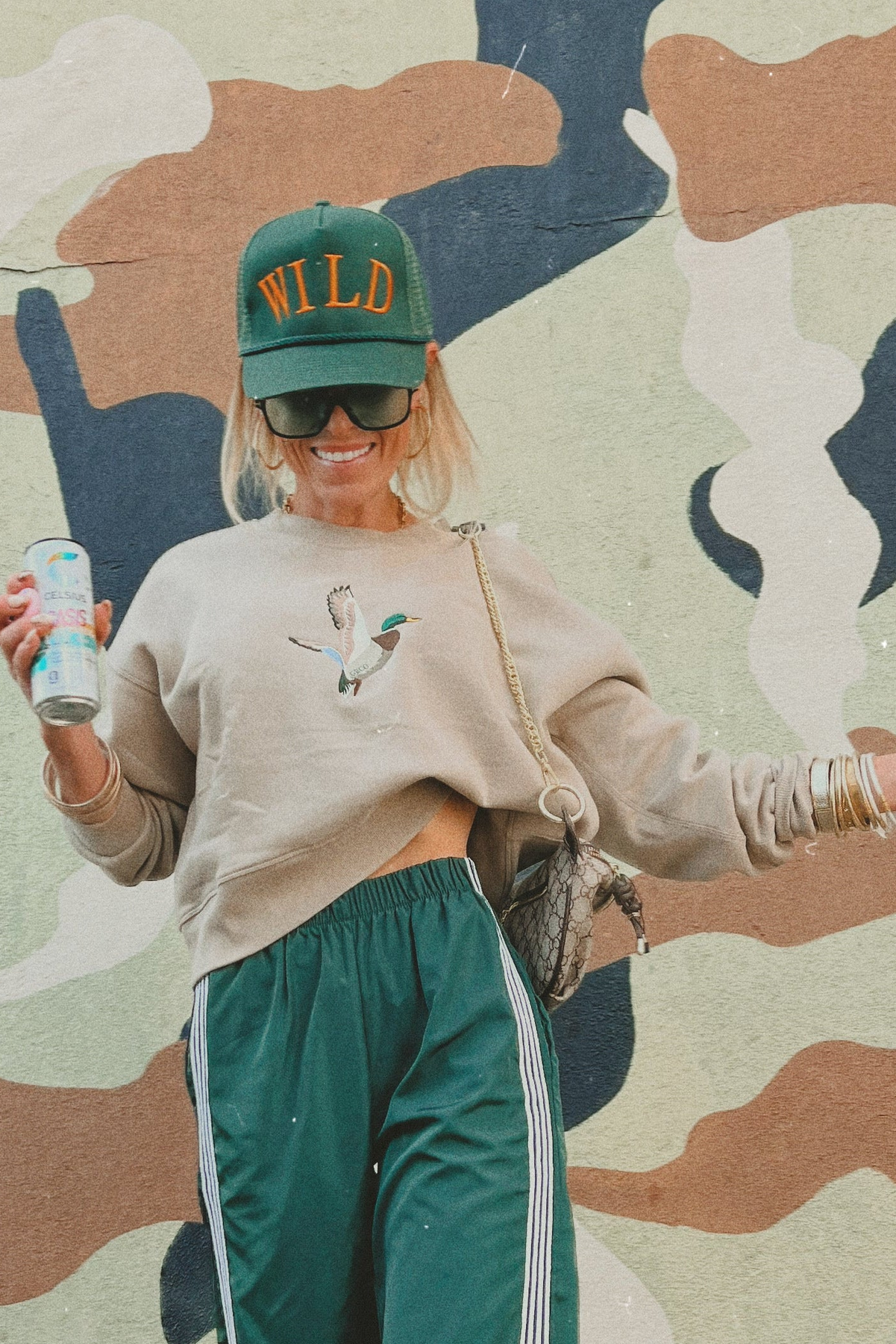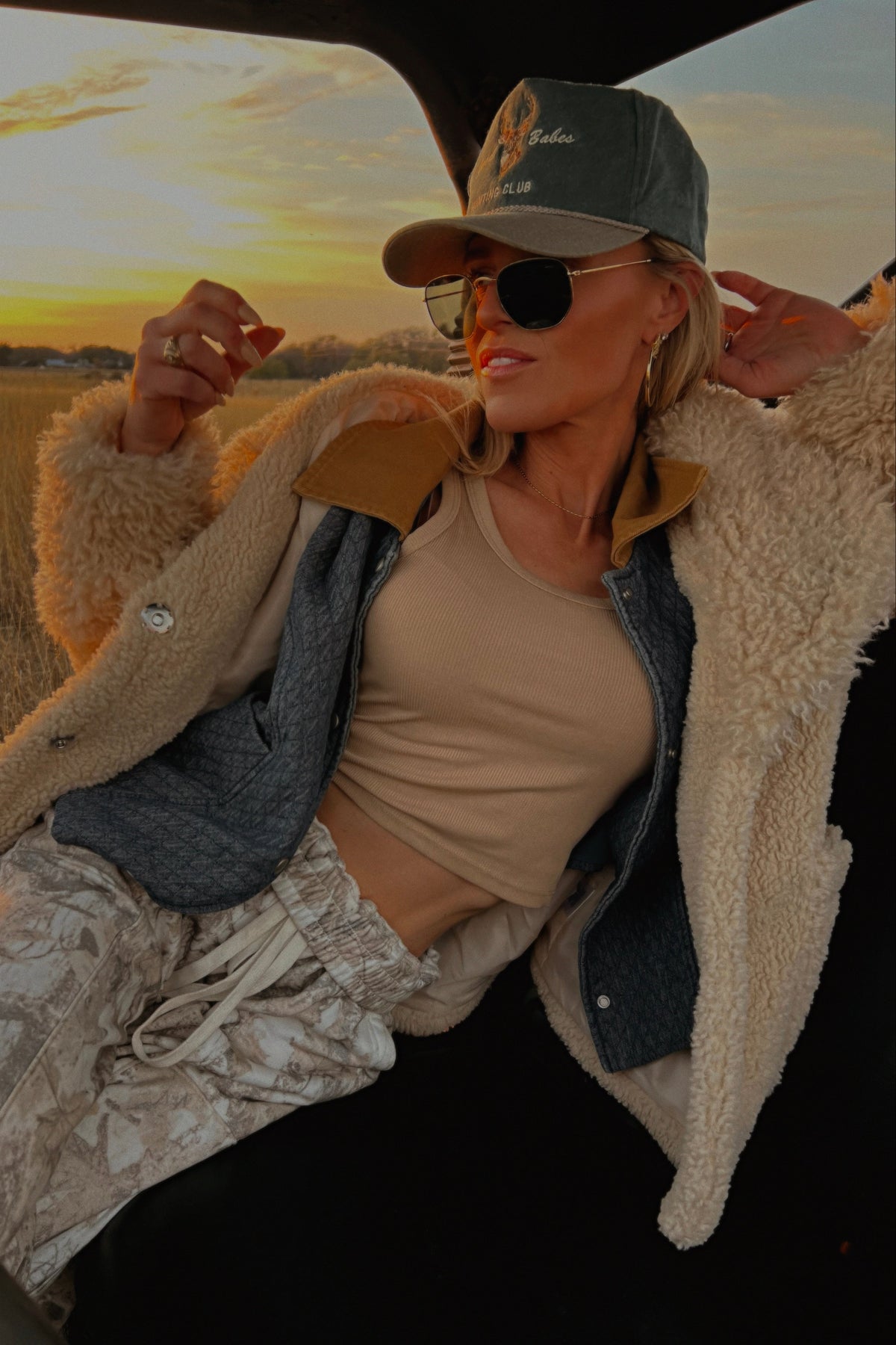 Outdoors to the bone. The Good Babes Hunting Club Trucker Hat in Olive features bold gold rope trim and a custom buck embroidery. Clean, classic, and made to stand out.