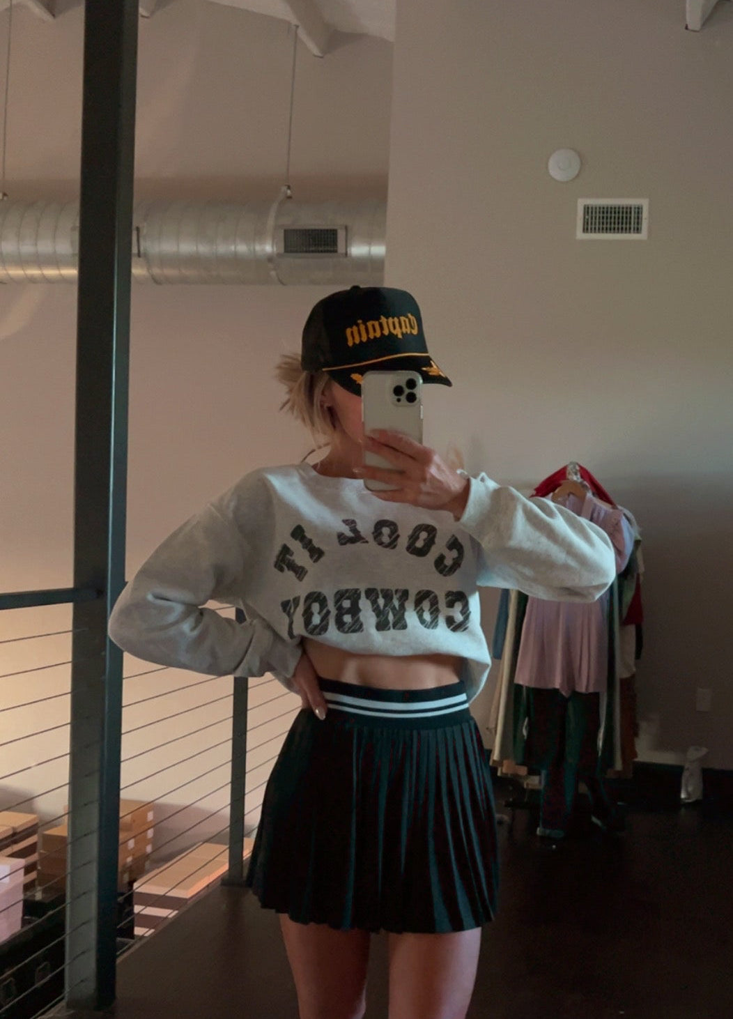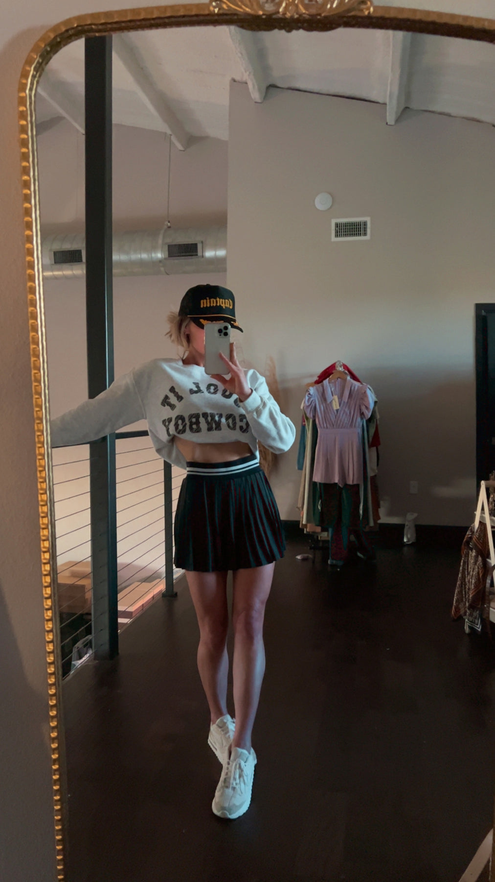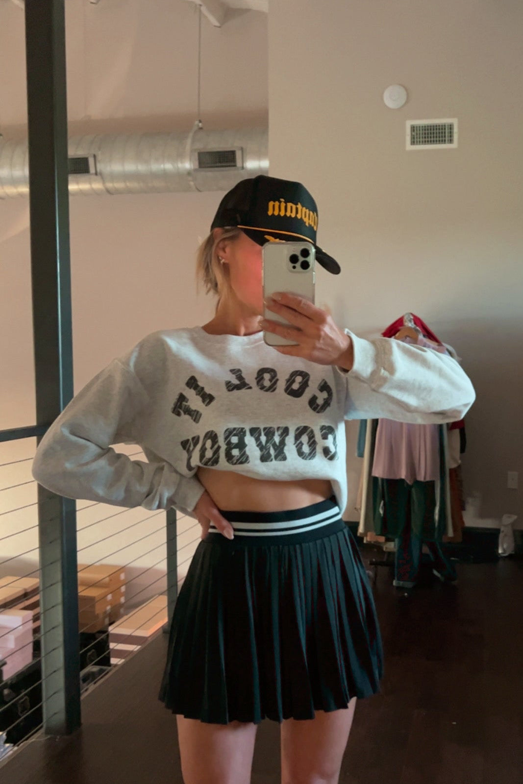 This mini skirt features a blend of tennis-inspired details and retro elements. The horizontal two-tone strip trim waistband reveal an iconic yet contemporary vibe while pleating adds volume and movement to the skirt.
