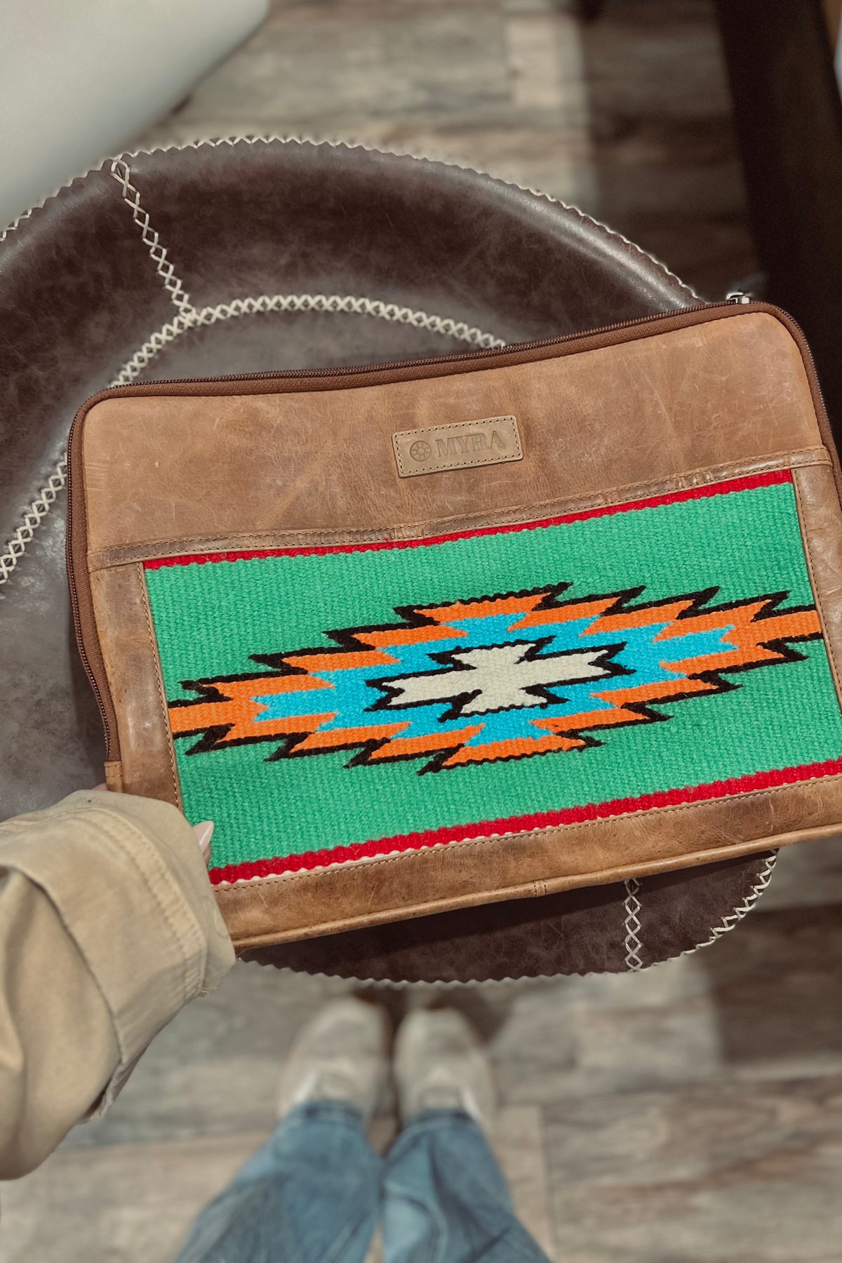Allow this great accessory to elevate your tech style! This artisanal laptop case features a vibrant upcycled rug panel in turquoise, burgundy, and gold geometric patterns. Wrapped in rich brown leather and designed for durability, this eco-conscious accessory transforms your daily commute into a statement of sustainable sophistication. Zipper closure keeps everything secure.