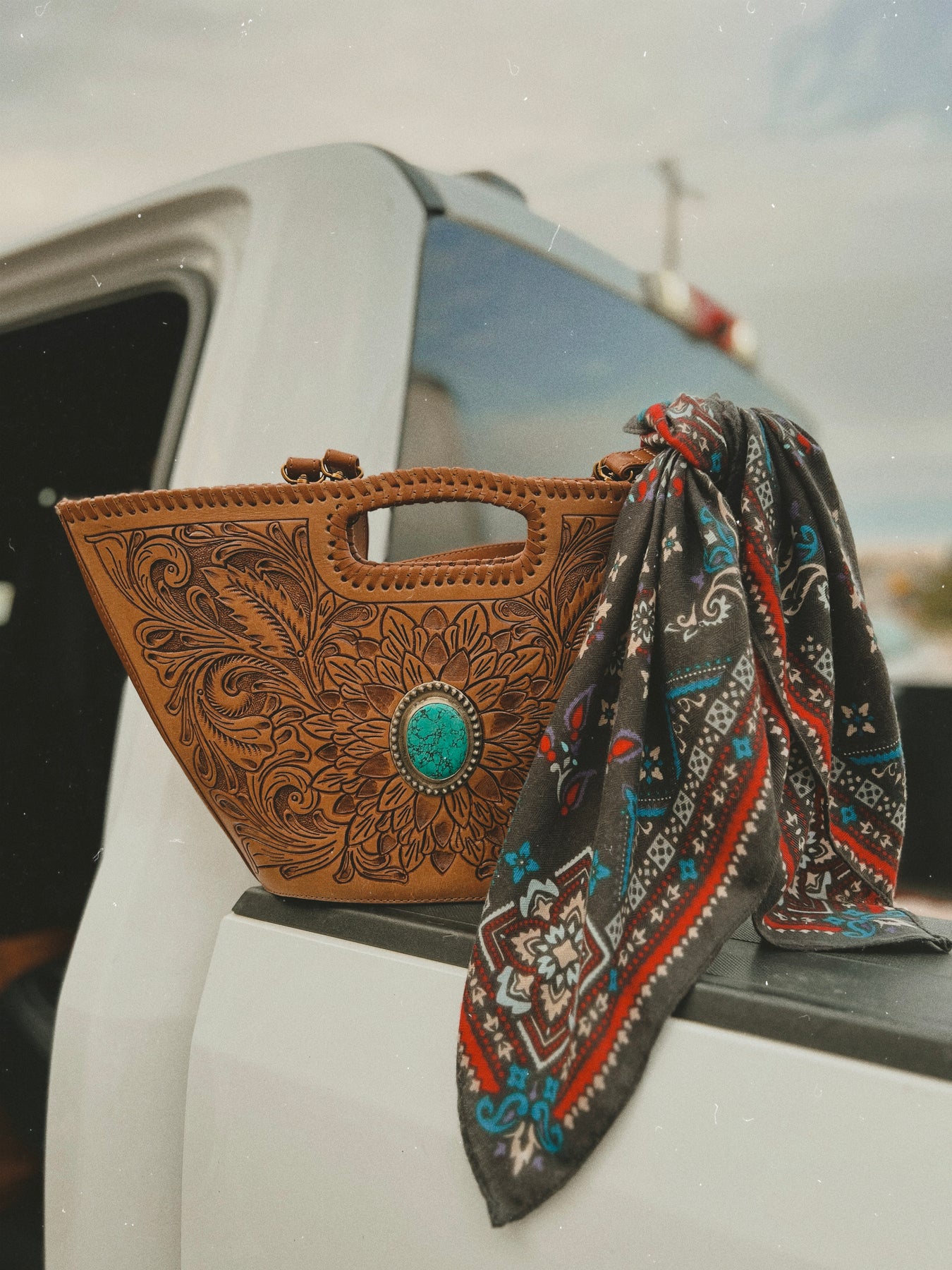 Inspired by the rugged beauty of the desert, the Desert Marigold Bucket Bag combines timeless Western charm with modern practicality. Hand-tooled with intricate detailing, this tote bag is elevated by a striking turquoise stone centerpiece on both the front and back, making it a true statement piece from every angle. Crafted for everyday use, its spacious design offers convenience without compromising on style. The structured yet easy-to-carry silhouette ensures it transitions seamlessly from daily errands to special outings. Practical, durable, and beautifully detailed — the Desert Marigold Bucket Bag is more than just an accessory; it’s a piece of art designed to be lived with.