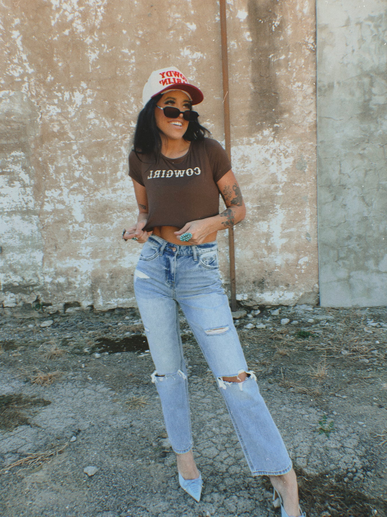 Cropped mini tee with a "Cowgirl" graphic on the front