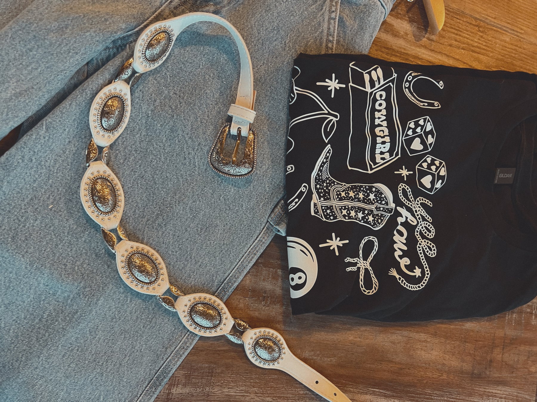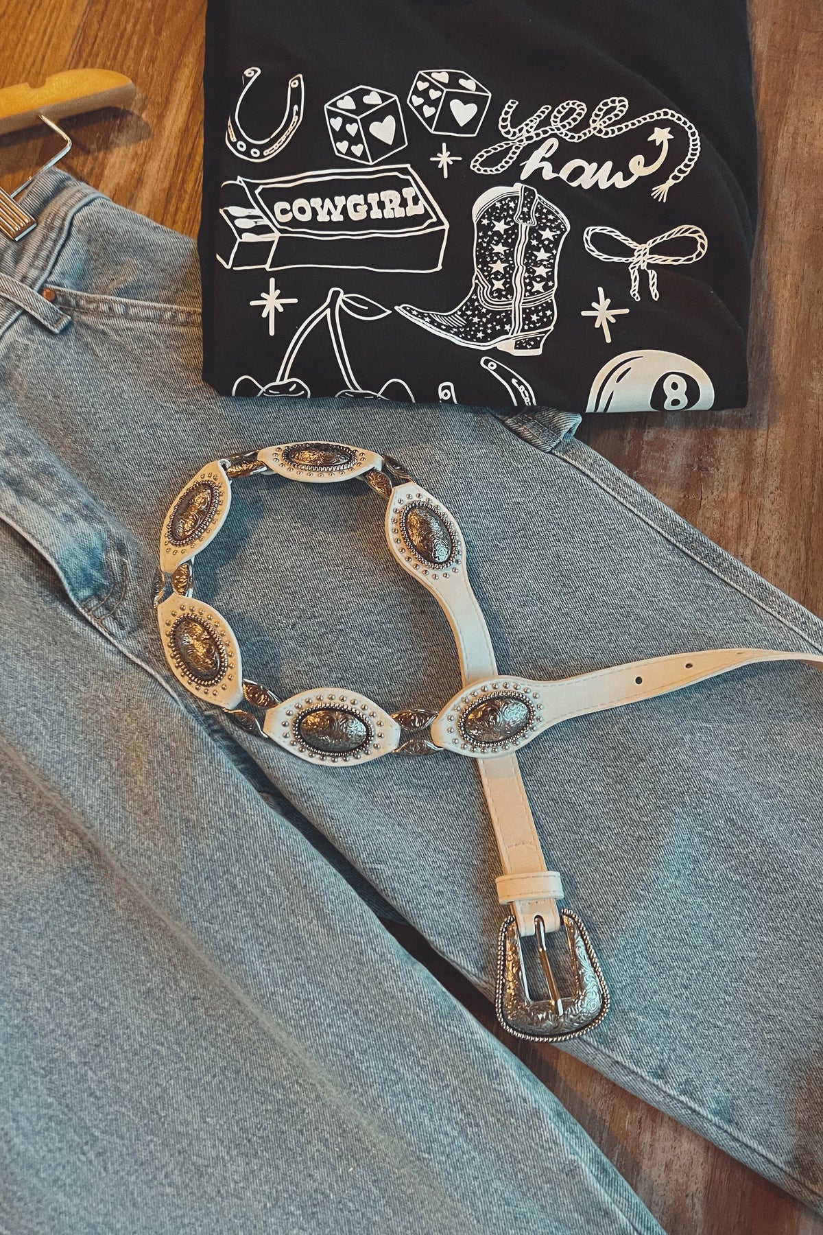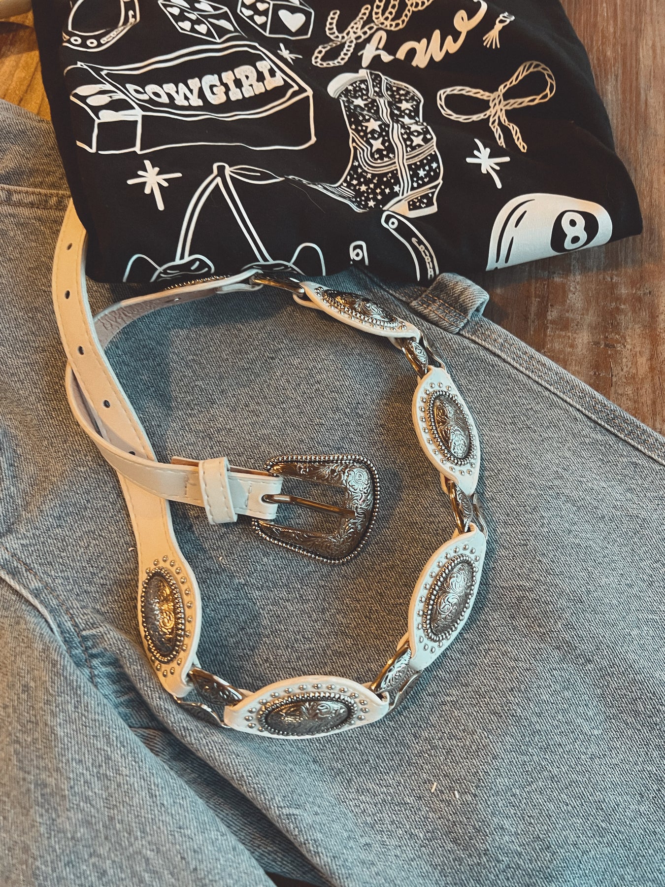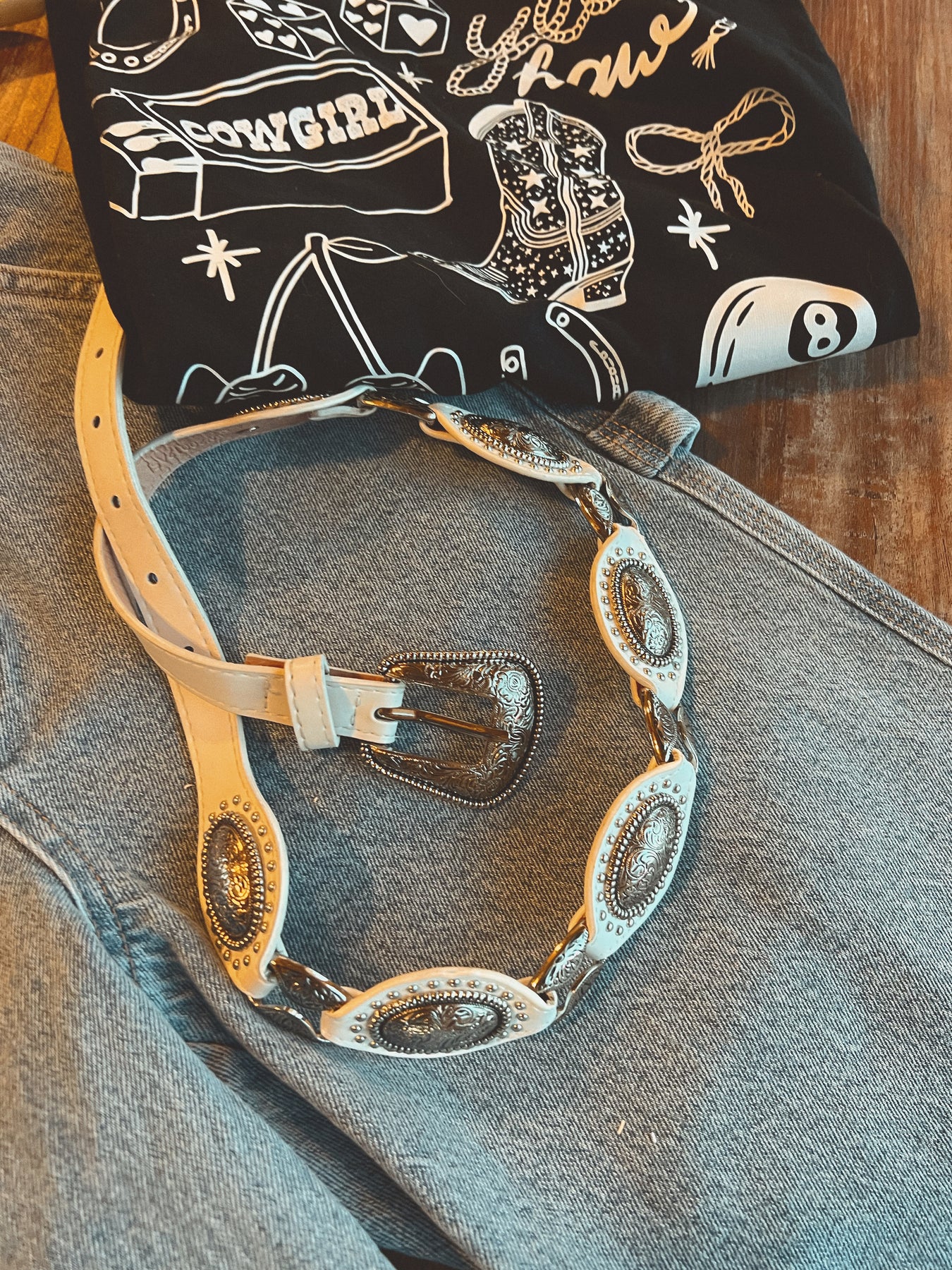 A classic staple with western flair. The Talia features detailed silver conchos along a sleek white leather strap, blending classic style with a modern edge. Whether cinched over denim or layered with a flowy dress, this belt adds the perfect finishing touch to any look.