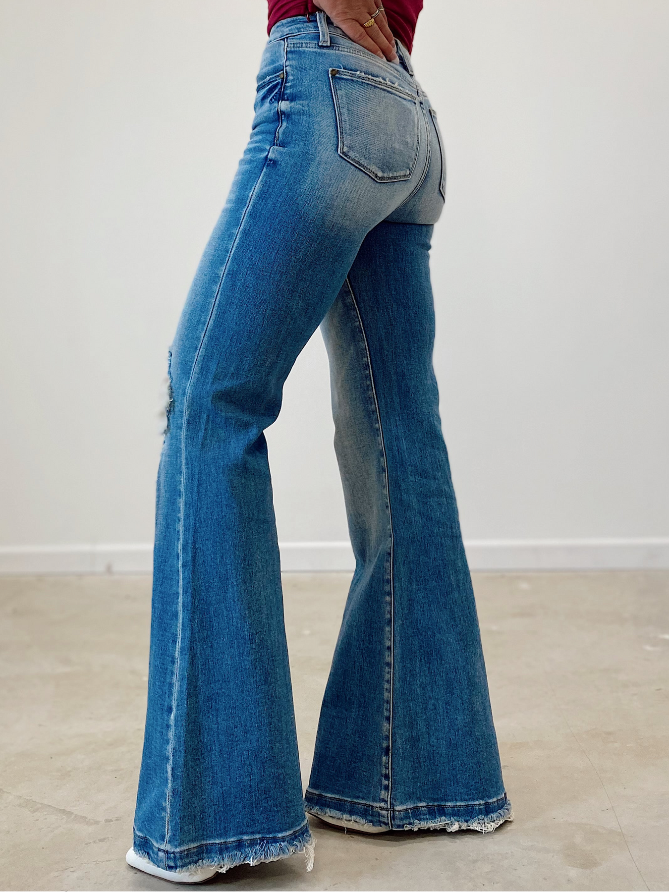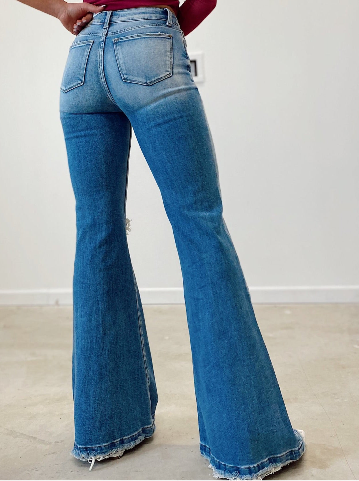 These super high-rise flare jeans are inspired by classic ‘70s silhouettes, featuring a flattering wide leg, knee distressing, and a 34" inseam. Finished with a button closure, zip fly, and 5-pocket styling—perfect for elevating your everyday denim lineup. Not to mention, they have a GREAT stretch.