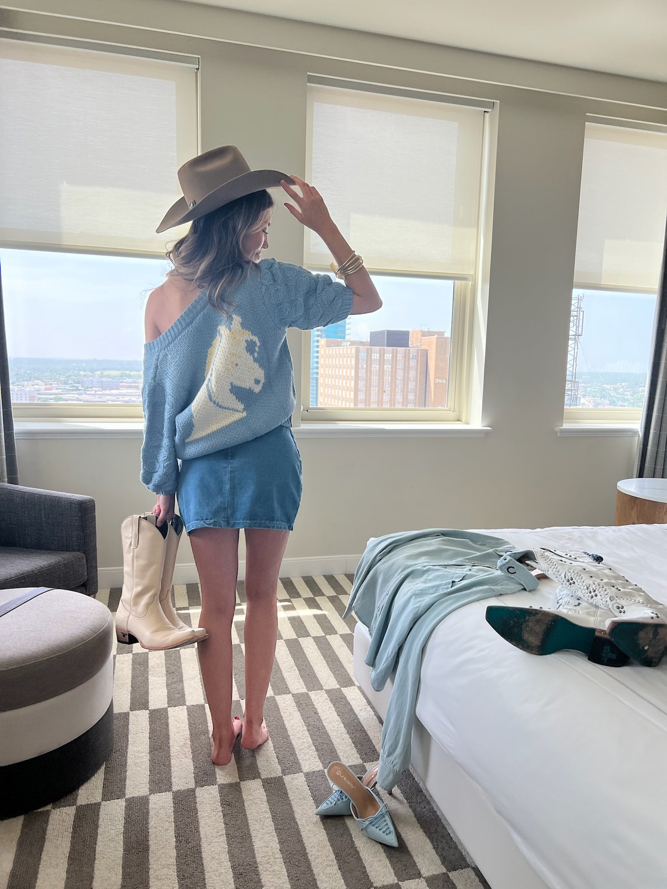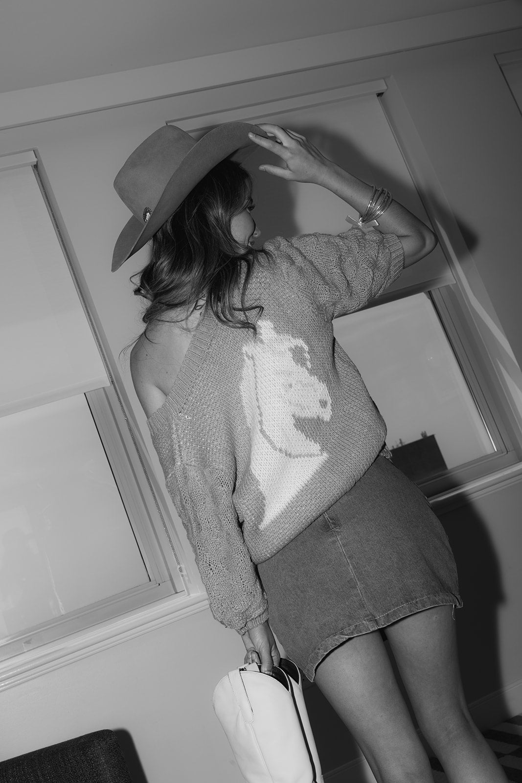 Cozy meets cowgirl chic. This Horse Knit Cardigan is the perfect daytime layer for strolling the Vegas Strip during NFR. With eye-catching puff sleeves and a playful horse pattern, it adds Western charm to any look. Toss it over denim and boots for a comfy, statement-making fit that’s rodeo-ready from morning mimosas to sunset snaps.