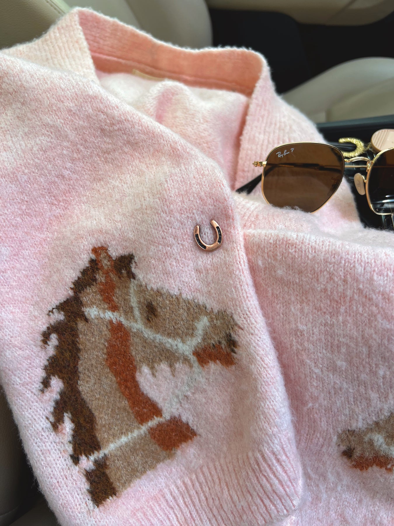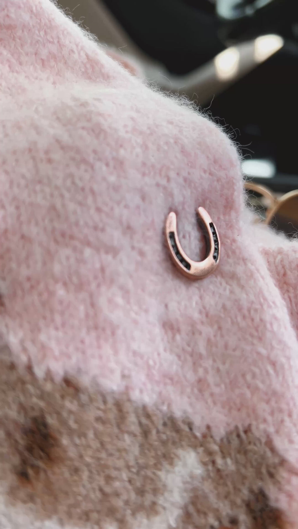 Initial inside horseshoe pendant necklace, featuring a small initial inside a horseshoe pendant, decorated with shiny glass rhinestones, and a delicate oval link chain.