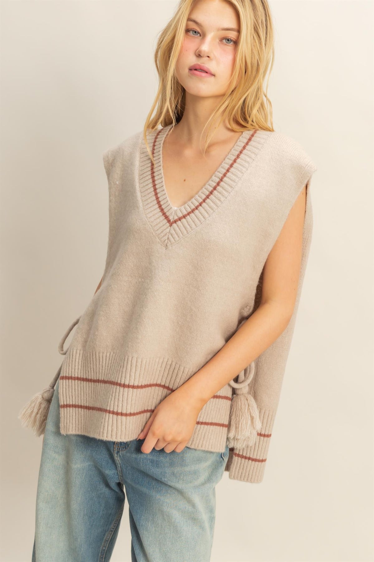 Perfect for fashion-forward layering, this sweater vest showcases style and comfort with its unique silhouette. Featuring a deep V-neckline that adds a touch of daring elegance, this vest is framed by finely ribbed hemlines and contrast striping that visual interest.