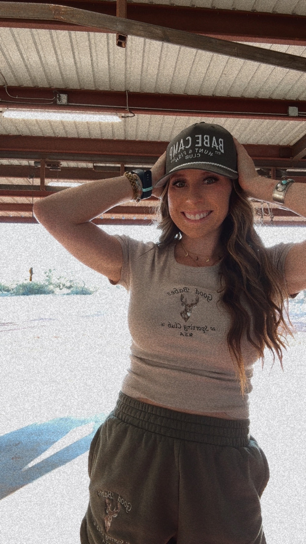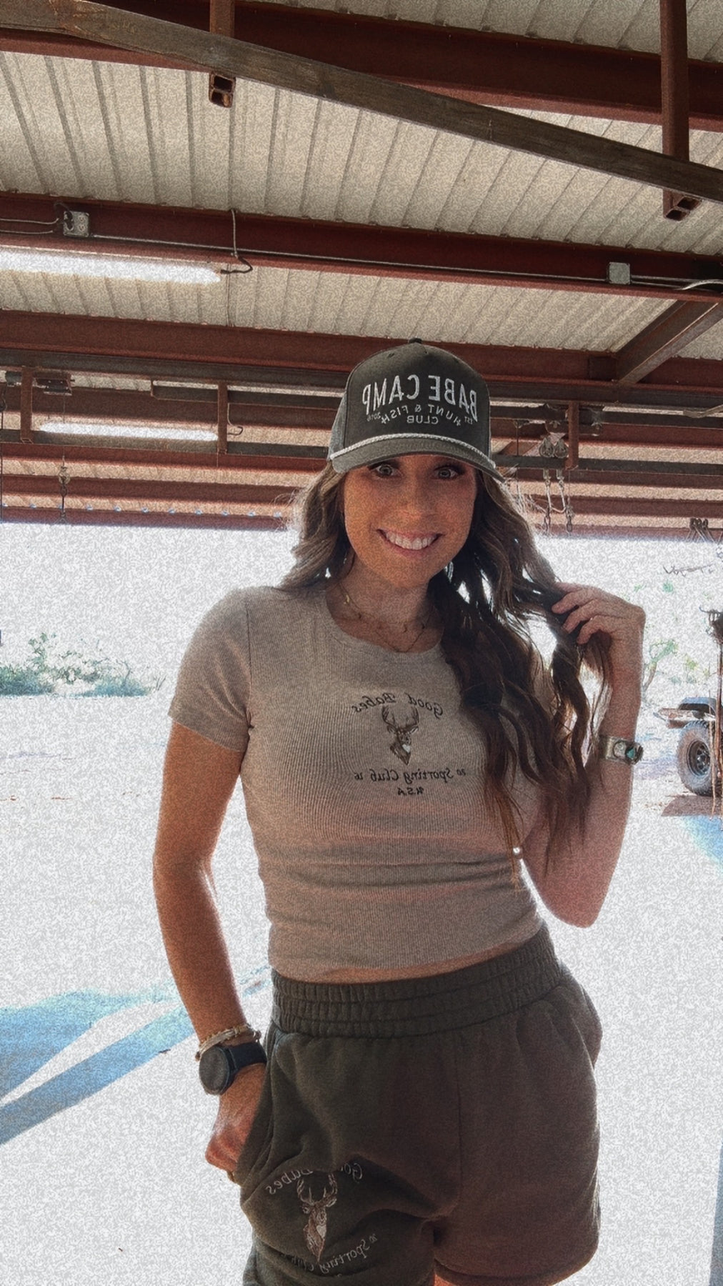 Western, but make it neutral. This taupe ribbed tee keeps it simple with short sleeves, a crew neckline, and a