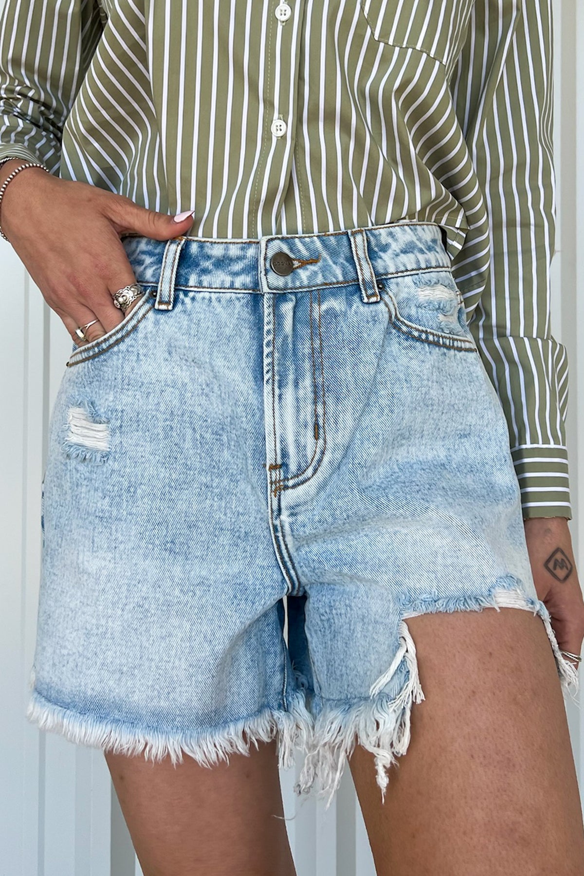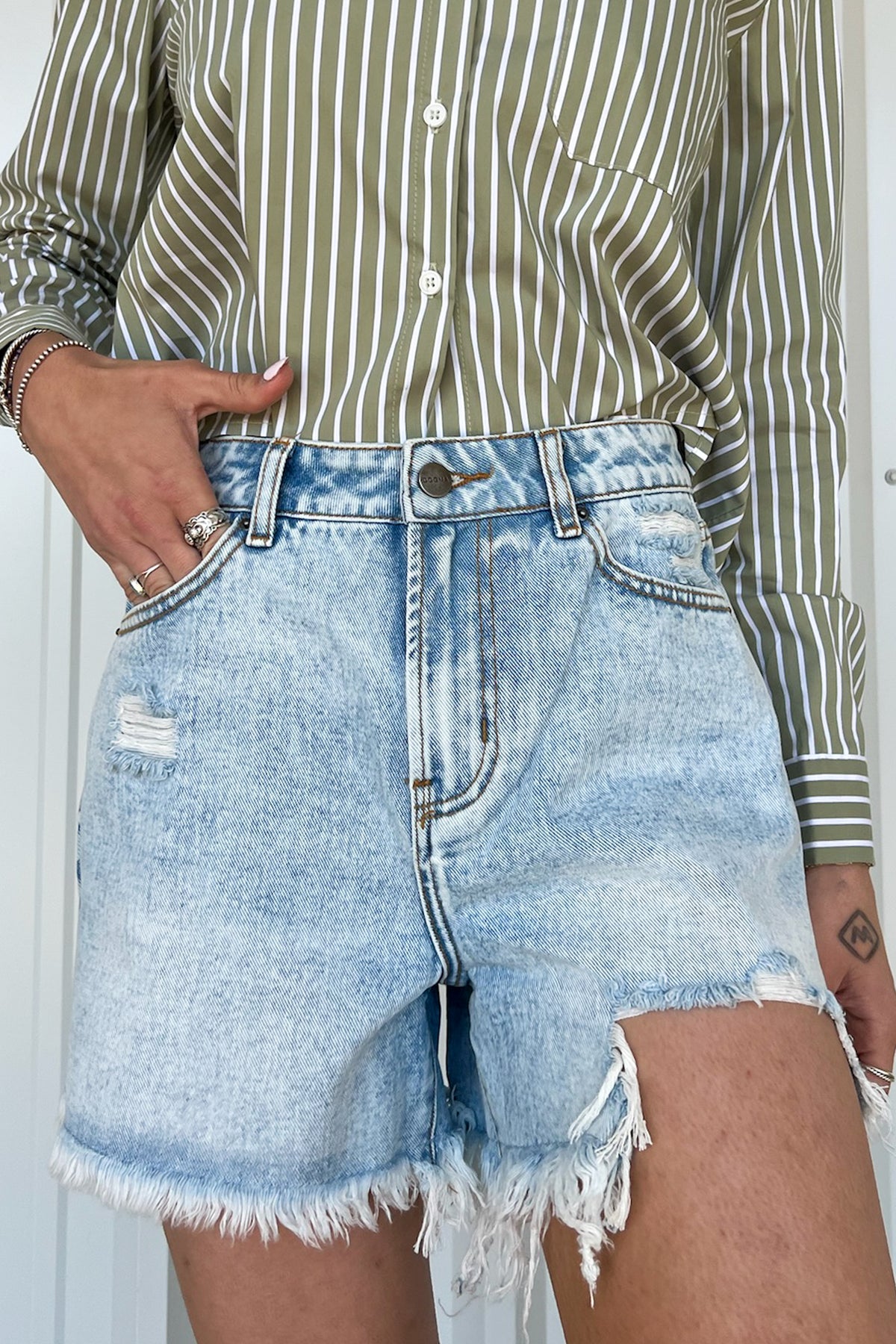 These super high-rise denim shorts feature a flattering fit and a released hem for that perfectly undone finish. Easy to pair, easy to love—your warm-weather staple just leveled up.