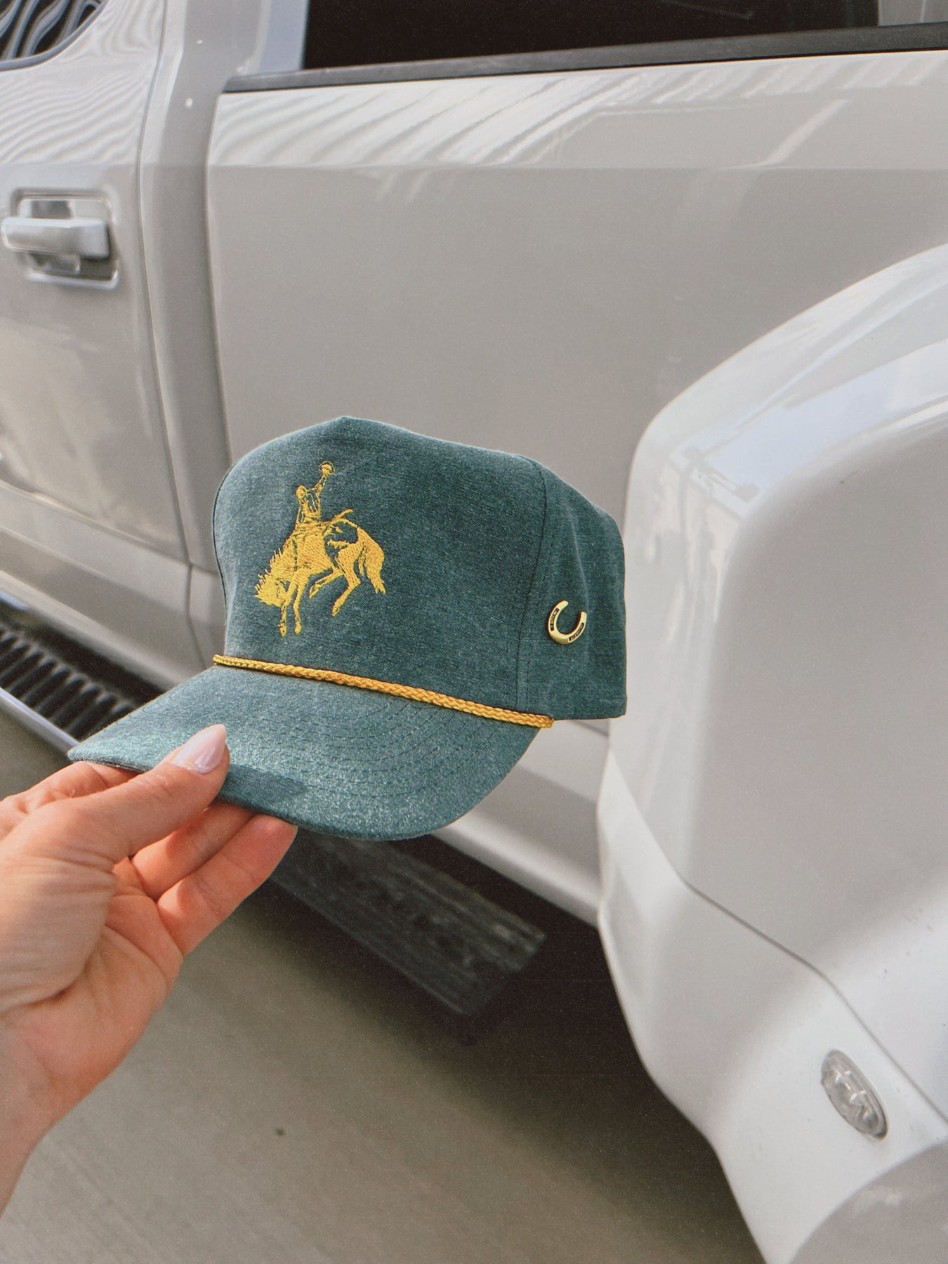 Western to the core. The Buckin Bronc Trucker Hat in Olive features bold gold rope trim and a custom bucking bronc embroidery. Clean, classic, and made to stand out.