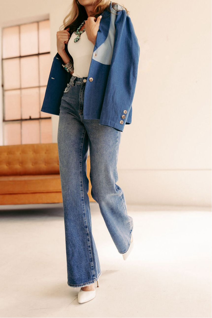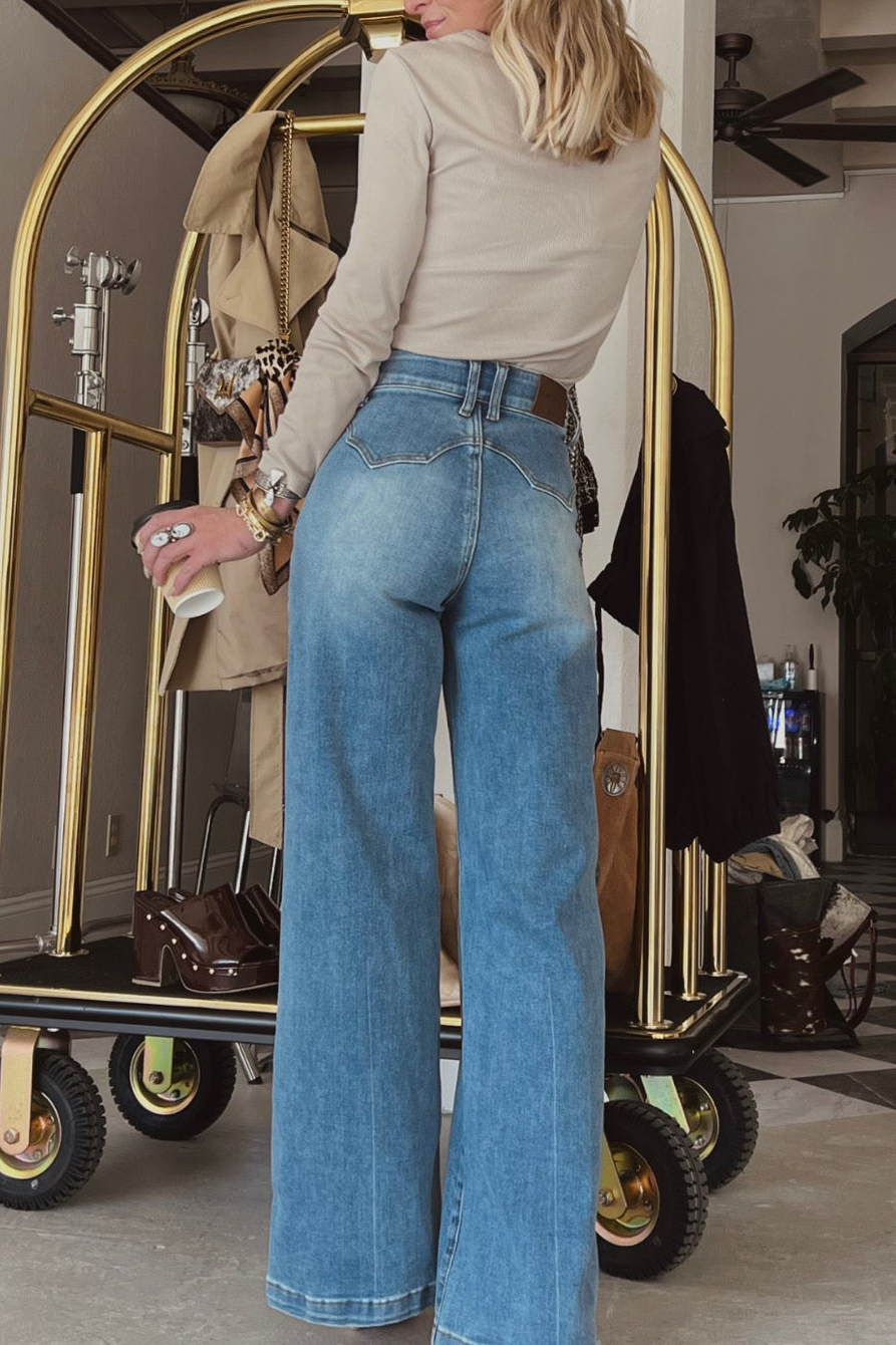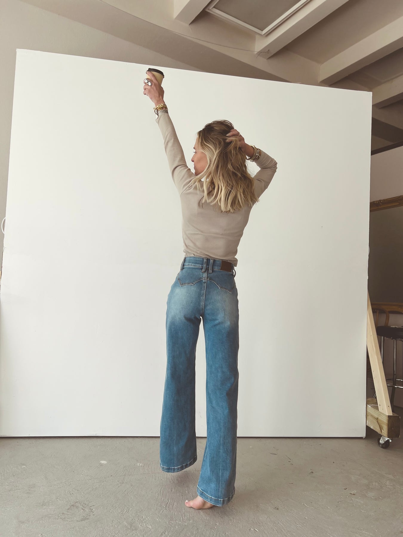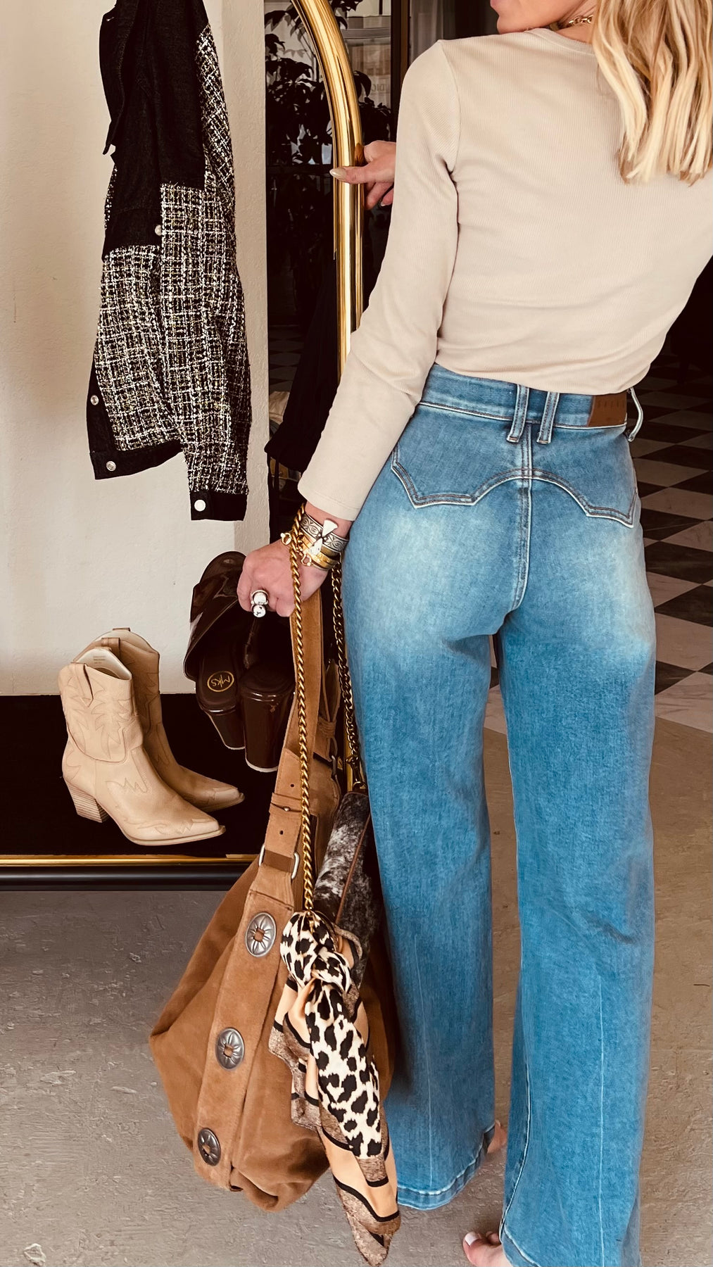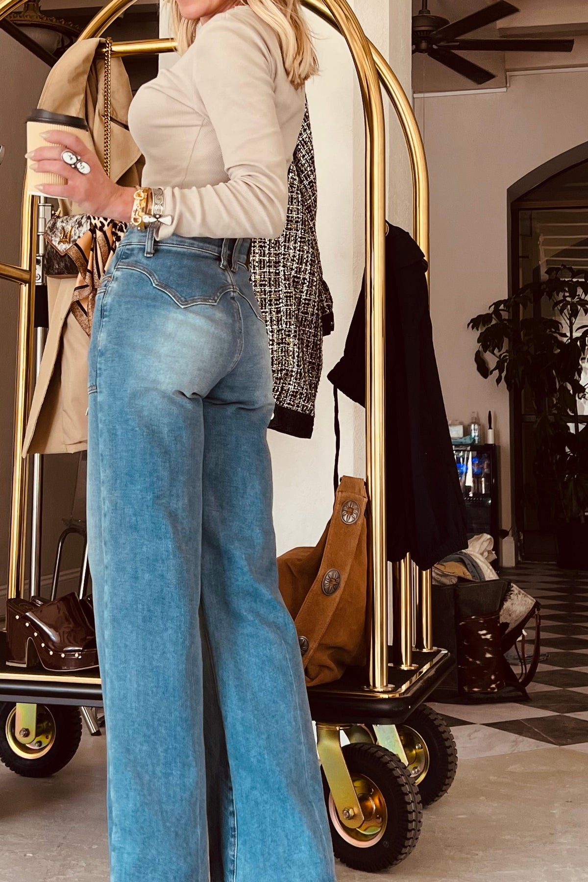 Elevate your denim game with this high-rise, wide leg jean—designed to flatter and elongate. Featuring bold front patch pockets and a clean front zipper fly, it’s a modern twist on a timeless classic. Perfect for dressing up or keeping it casual.