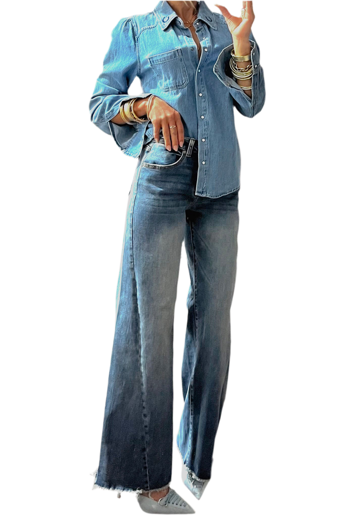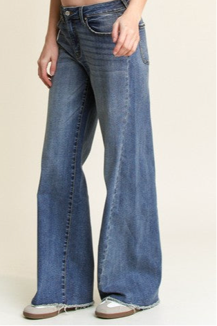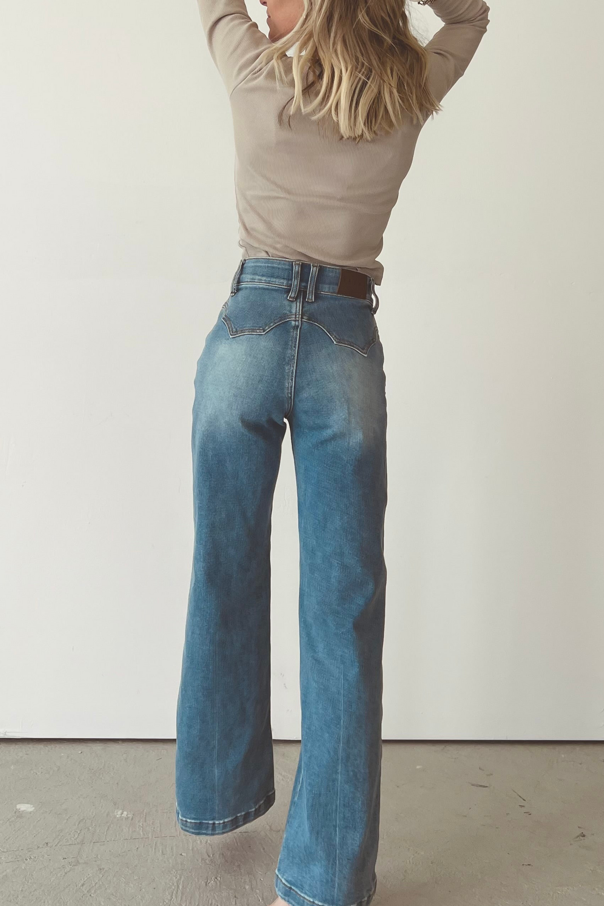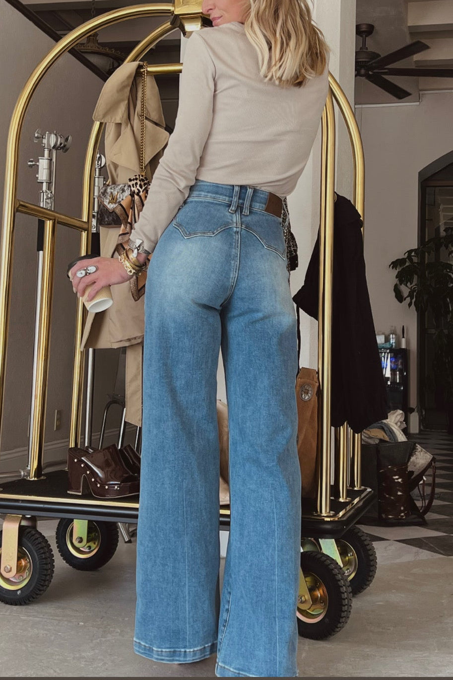 Flatter your figure with confidence in our Tummy Control High Rise Denim. Designed to smooth and support, this wide leg style features a sleek front slit for added movement and a touch of Western flair. A perfect mix of comfort, shape, and standout style.