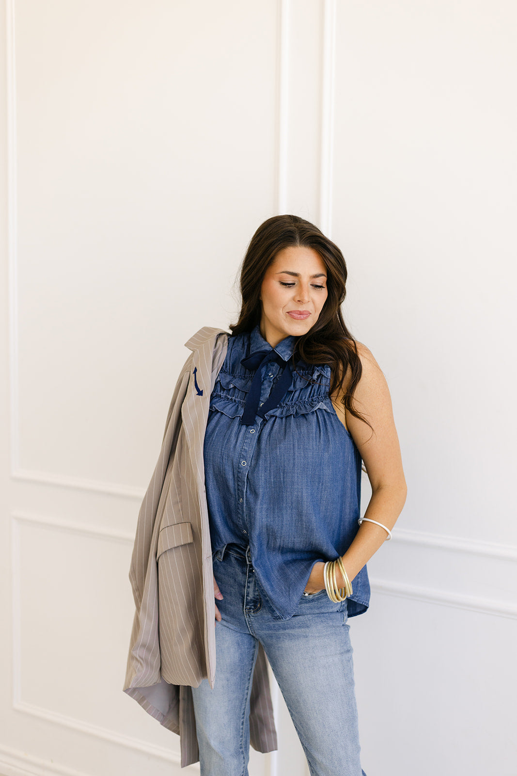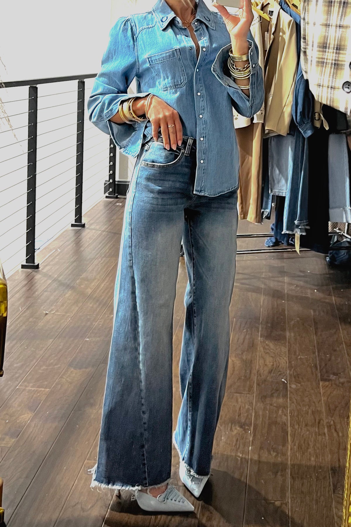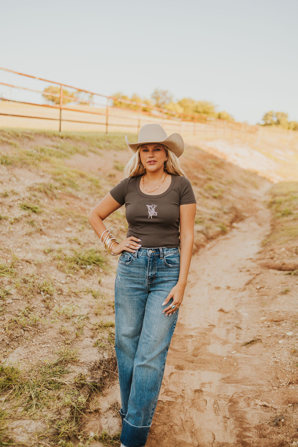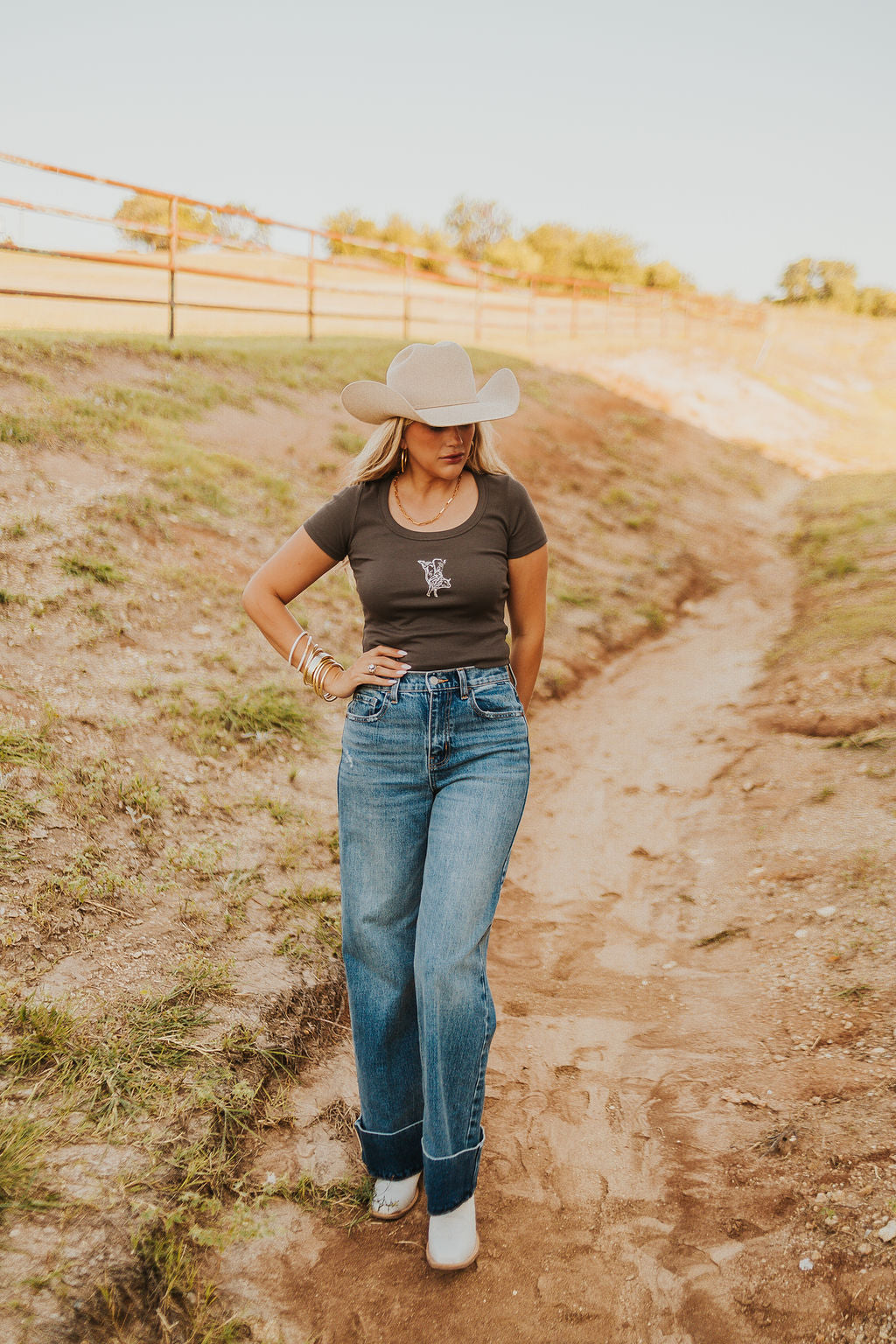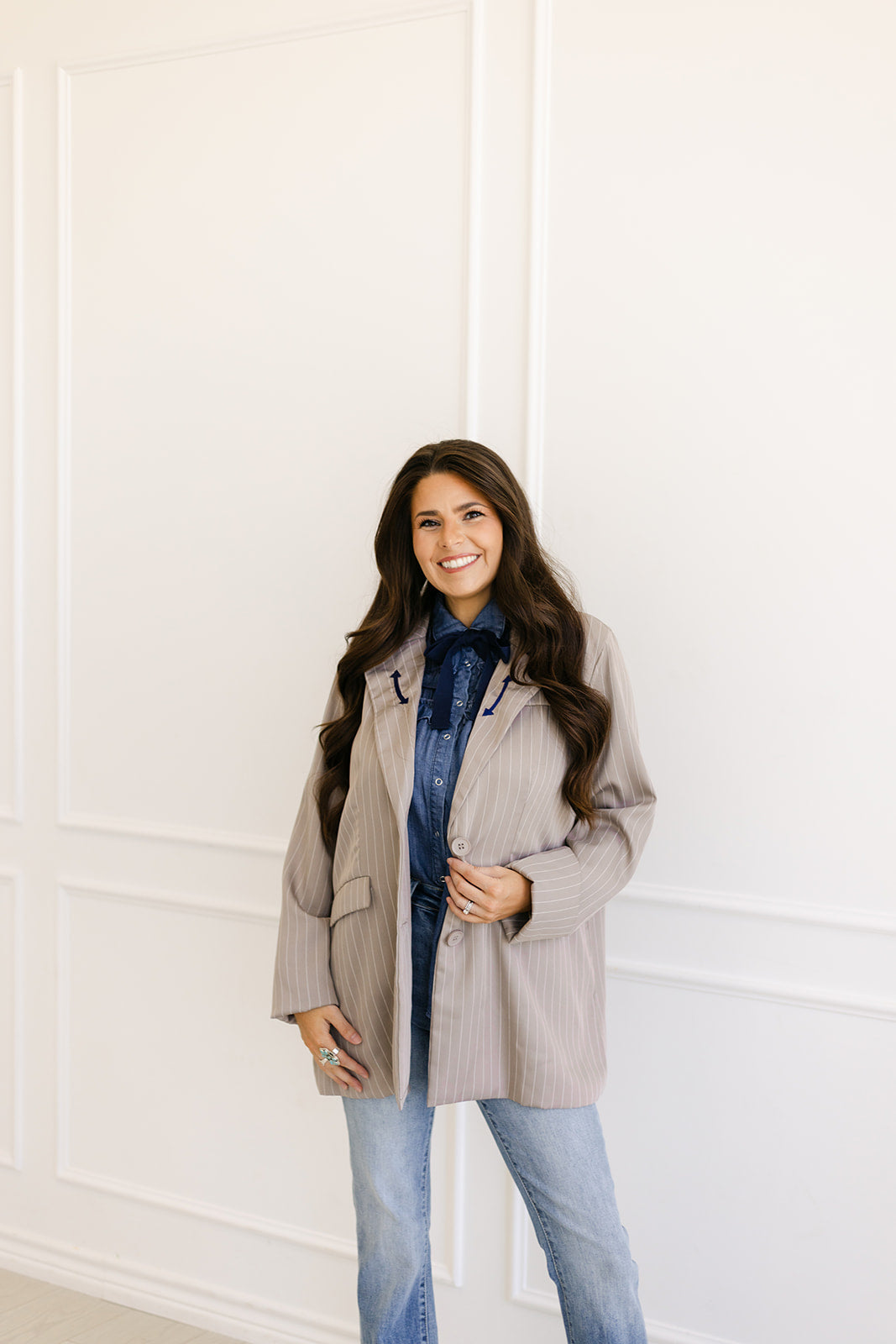 This oversized denim shirt jacket features a relaxed fit, classic button-up front, and the cutest embroidered horseshoe details on each collar lapel. Perfect for throwing over basics or pairing with denim-on-denim for an effortless, lived-in look.