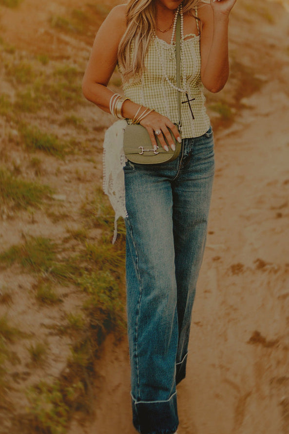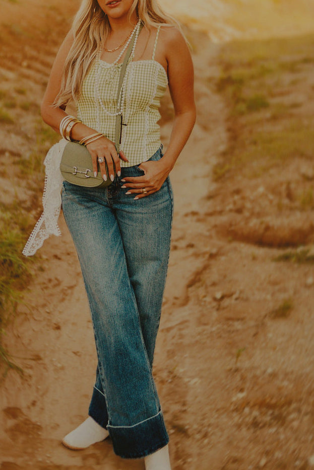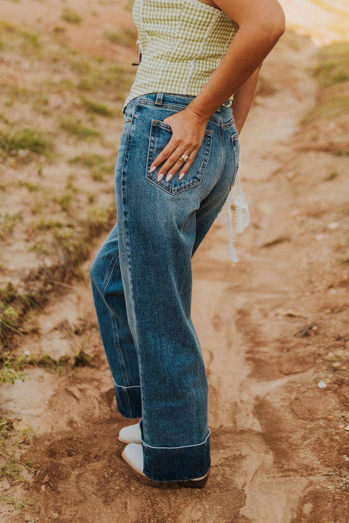 Elevated denim with a statement twist. These high-rise, wide leg jeans feature a medium wash and bold self high-cuffed hem for a fresh, structured look. Perfectly balanced between casual and polished, they’re the ultimate pair for stepping into fall with style