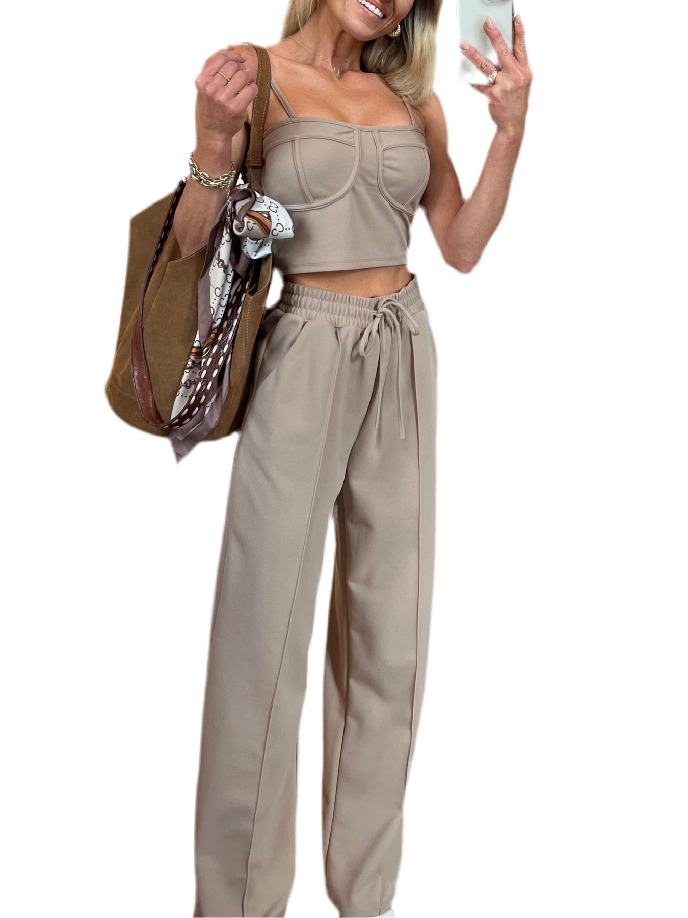 Upgrade your everyday wardrobe with this effortlessly stylish two-piece set. Featuring a structured bustier crop cami top and high-waisted straight-leg pants, this set blends comfort with a sleek, modern design. The bustier-inspired top provides a contoured fit, while the elastic waistband on the pants offers adjustable comfort. Functional slant pockets add a practical touch, making this set a must-have for versatile styling. Dress it up with heels or keep it casual with sneakers for a laid-back vibe.
