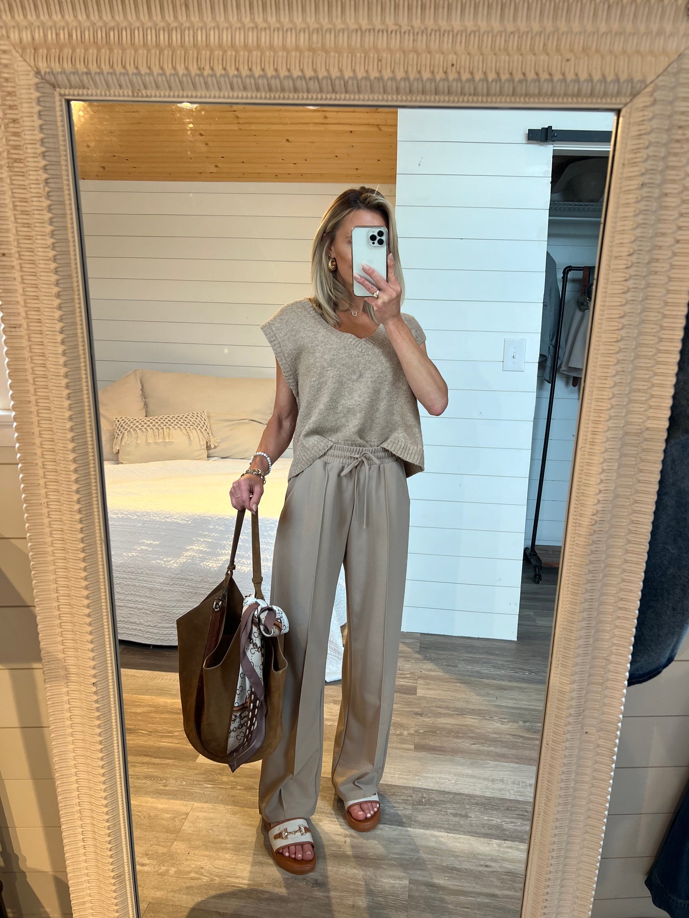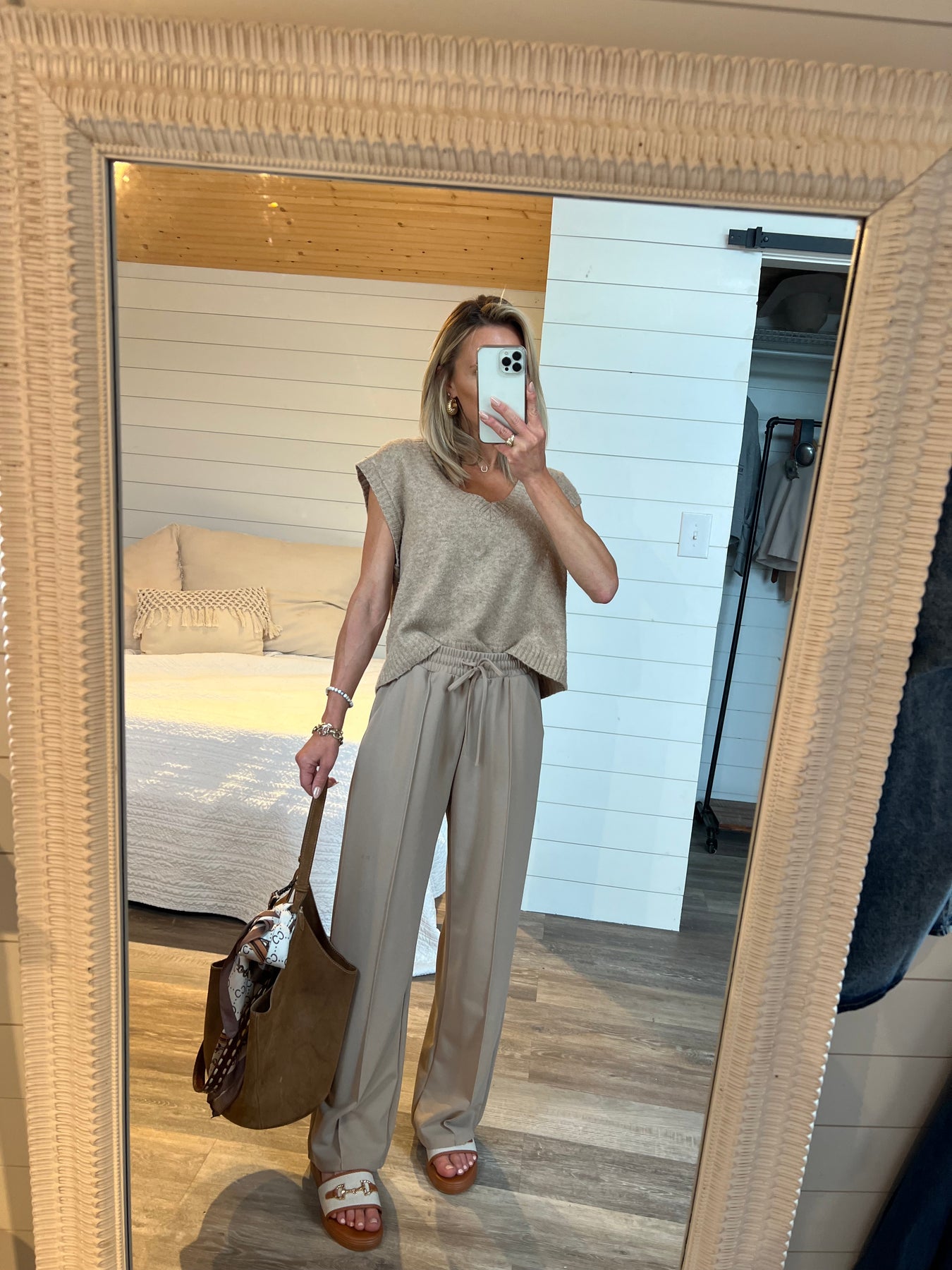 Chic and breathable, this linen set features a sleeveless v-neck top with a button-down front and side ties, paired with high-waisted wide-leg pants. Lightweight and effortless—perfect for warm days and easy styling.