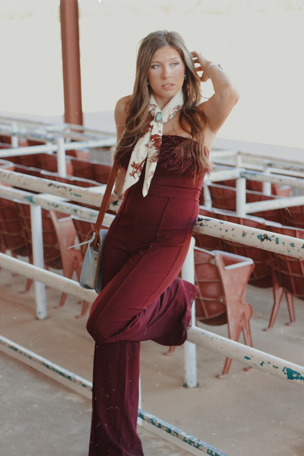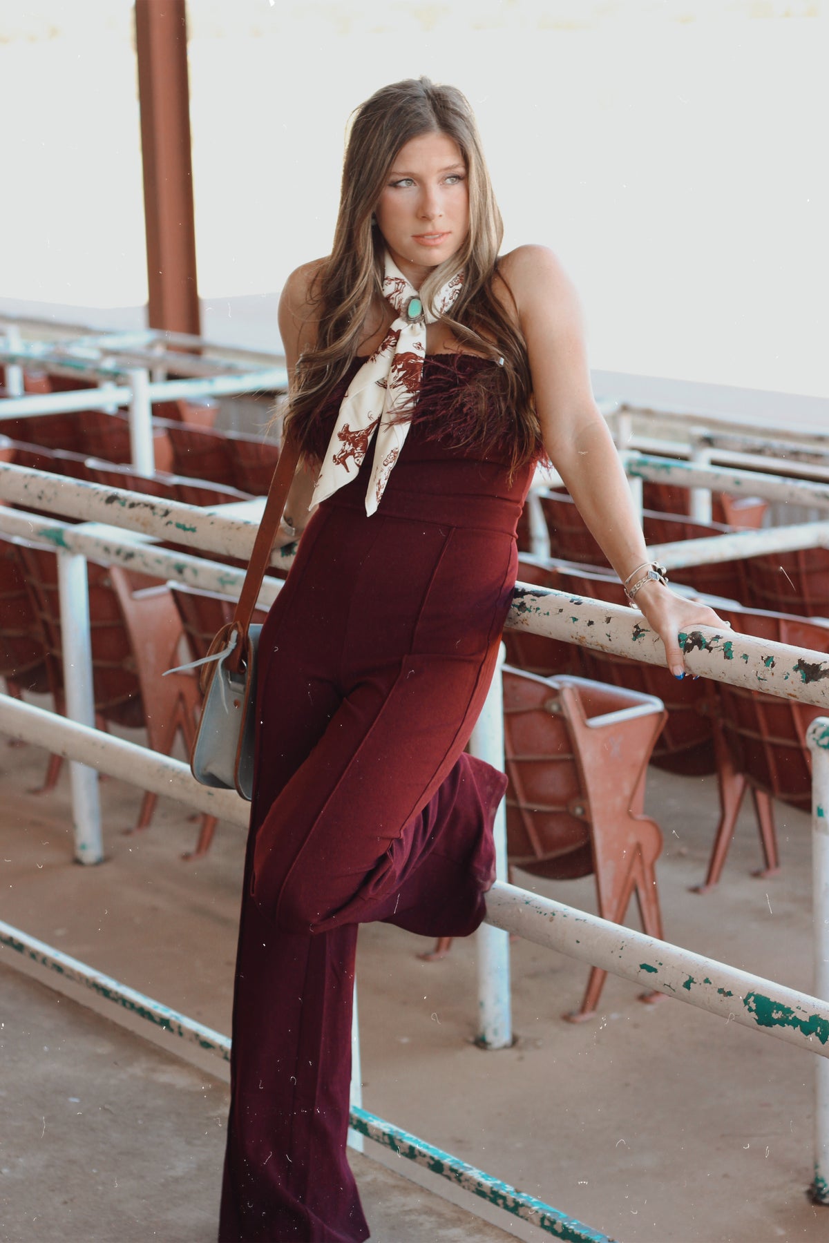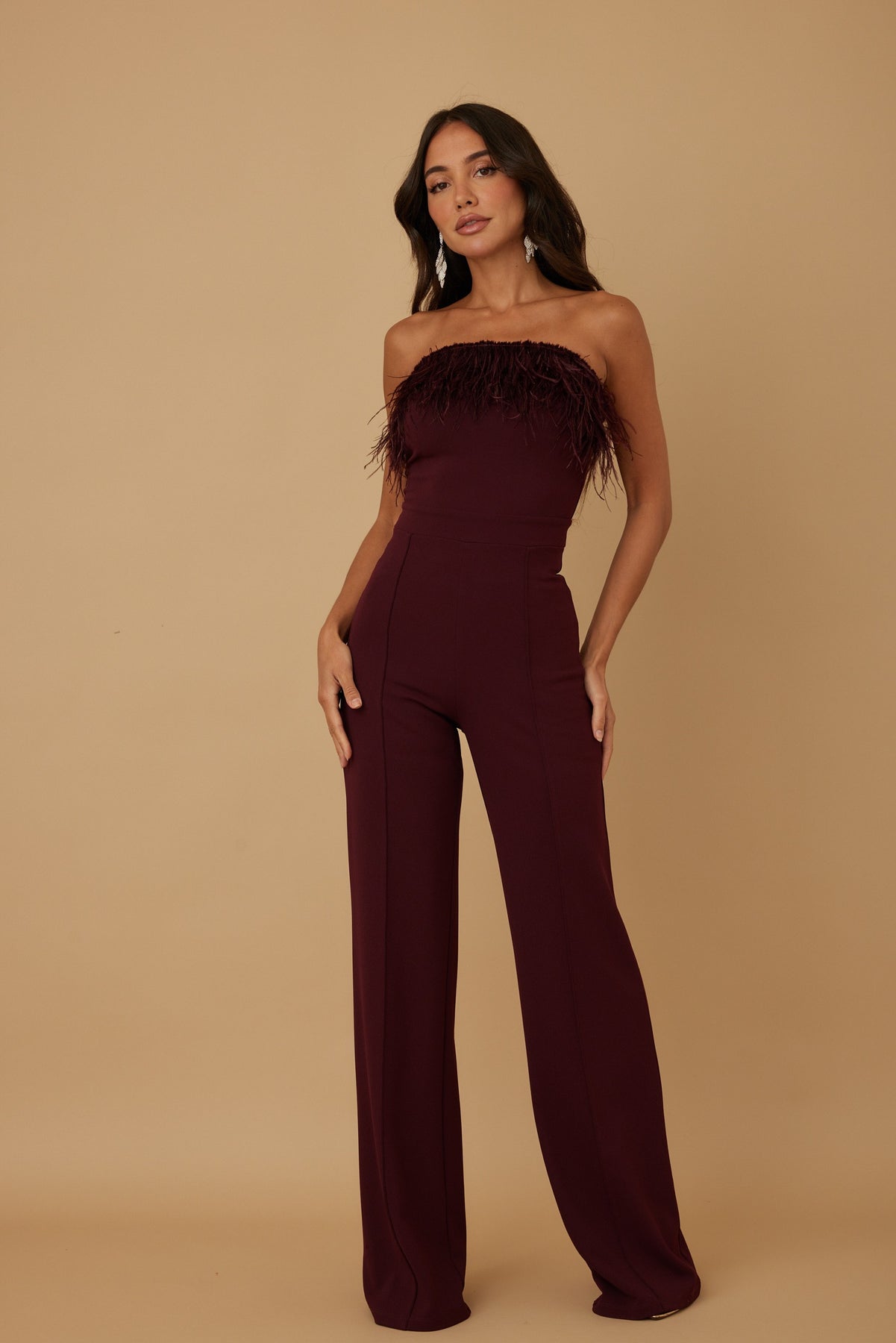 - OFF SHOULDER FEATHER TRIM DETAILED FASHION JUMPSUIT