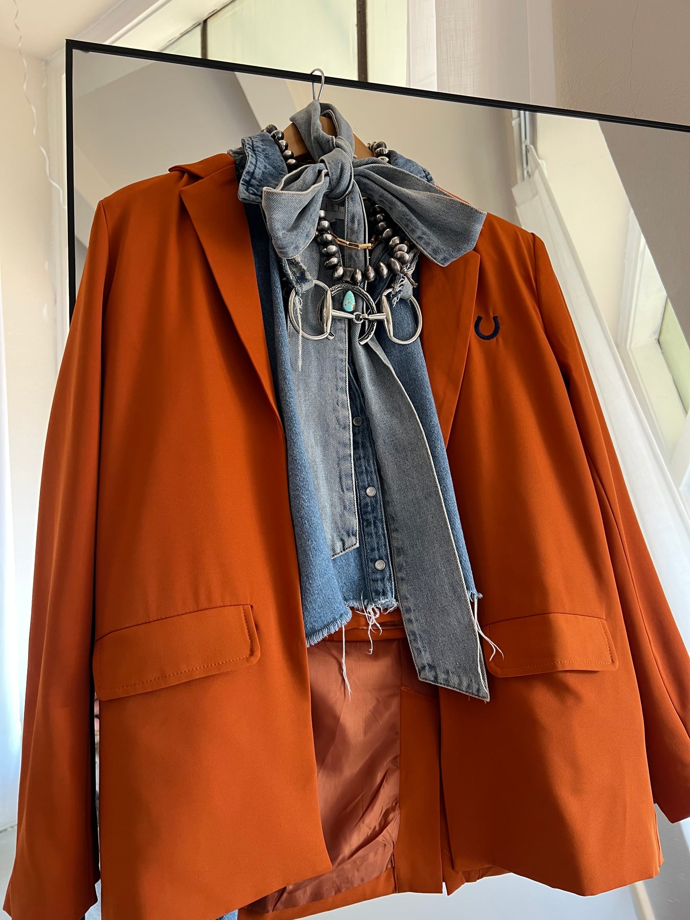 Class meets cowgirl cool. A rich rust hue and relaxed tailoring give this collared jacket set an elevated, high-end rodeo vibe.