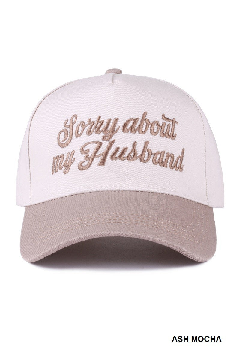 -"SORRY ABOUT MY HUSBAND" TWO-TONE CANVAS -TRENDY DESIGN -ALL SEASONS -VERSATILE STYLE -ADJUSTABLE STRAP -LIGHTWEIGHT AND BREATHABLE MATERIAL -CIRCUMFERENCE: 22-25", BRIM: 2.35"