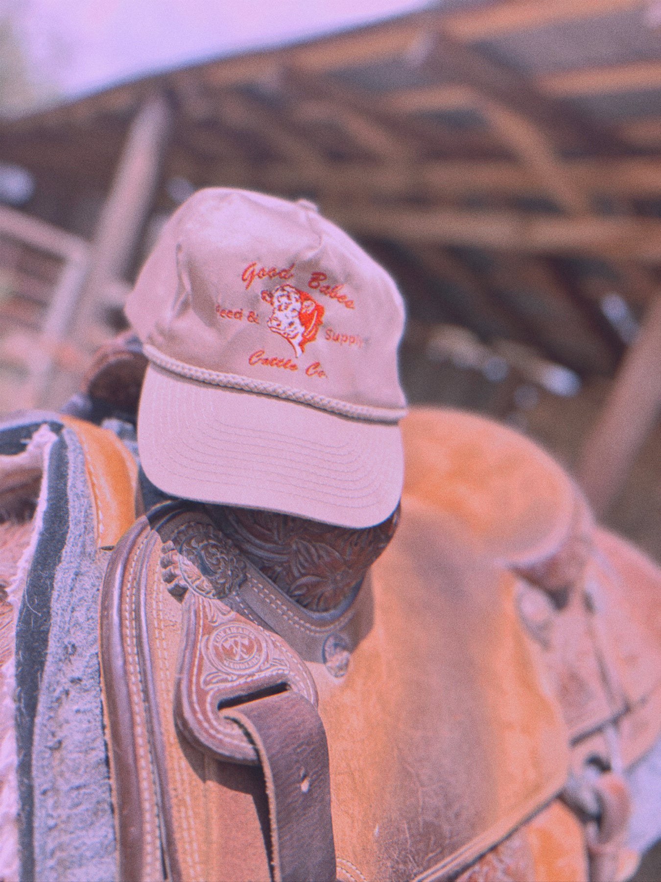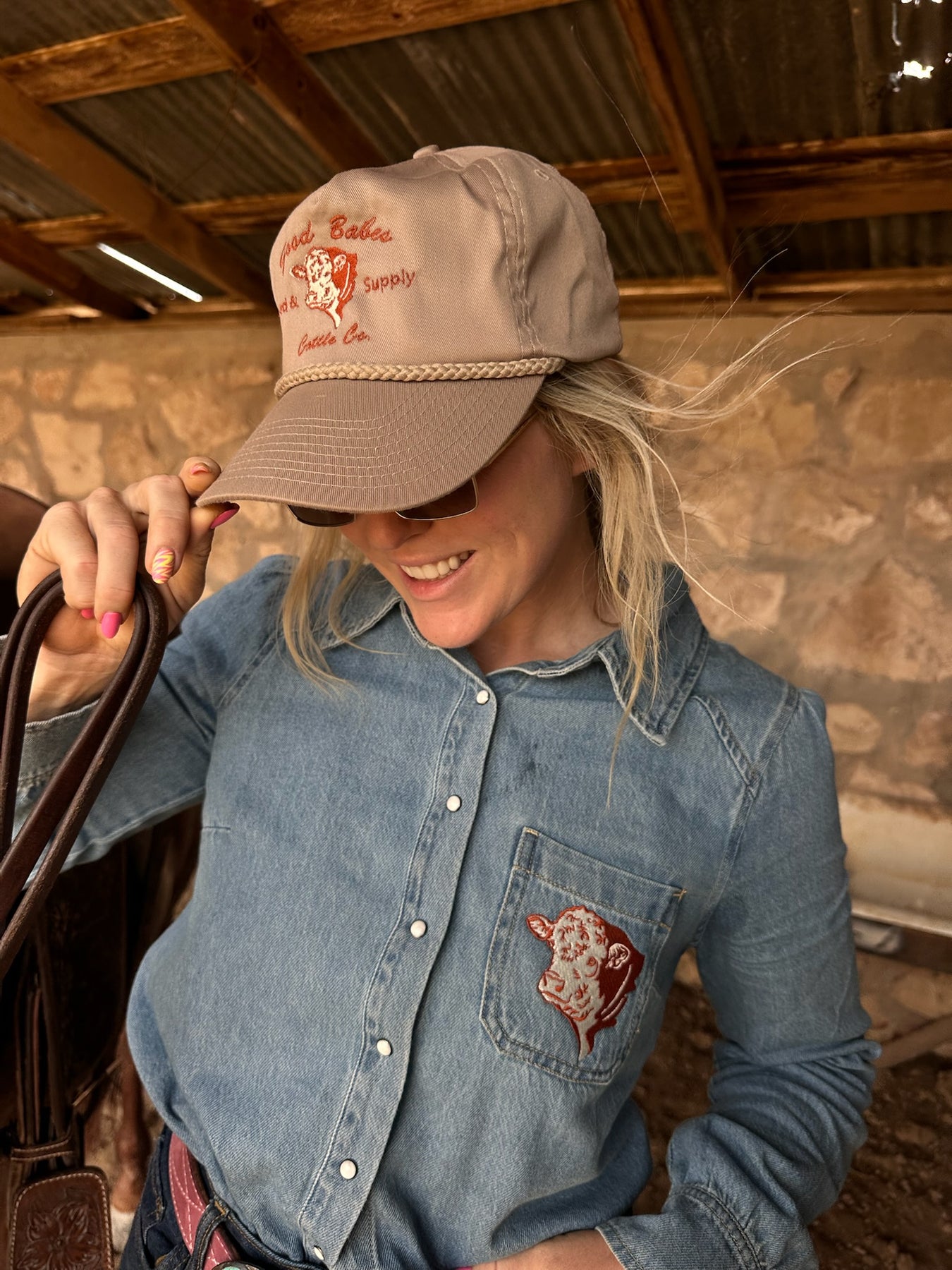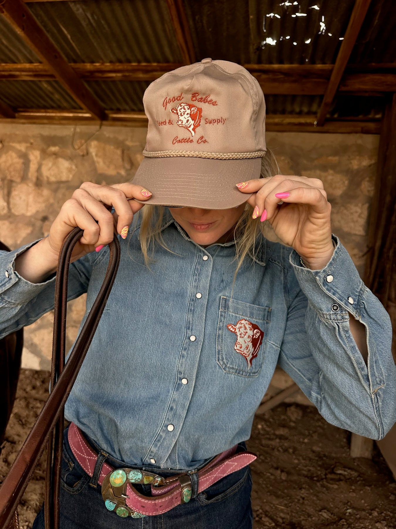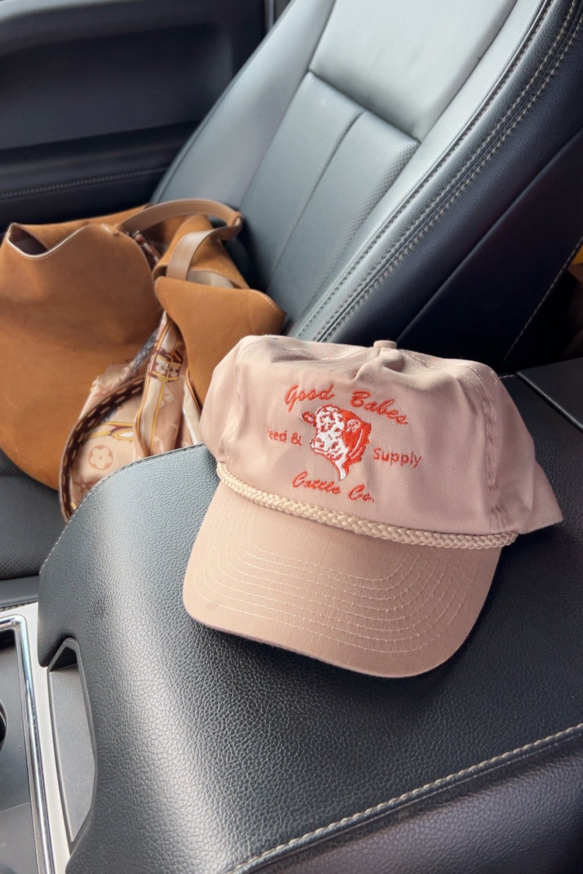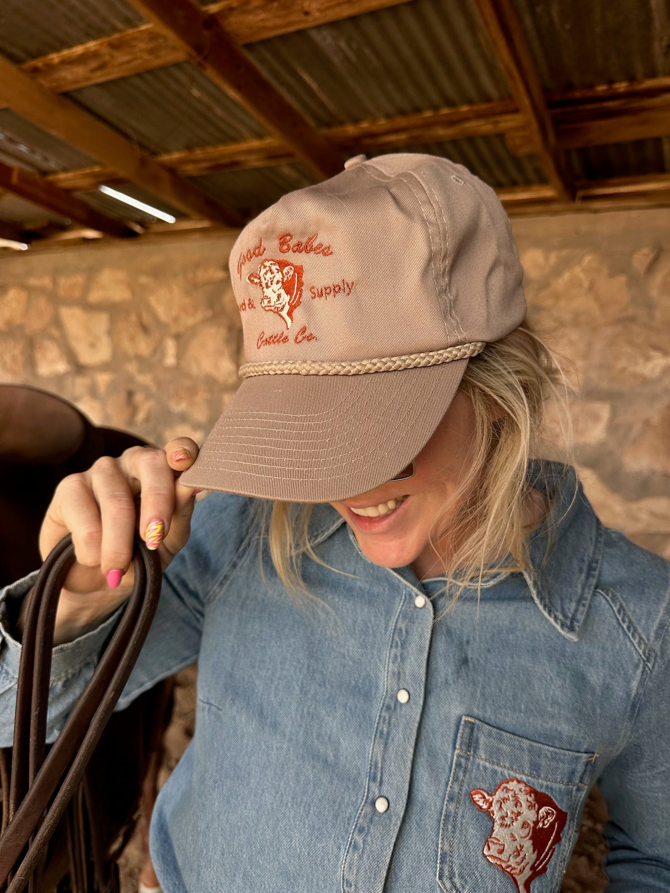 A vintage-inspired rope hat featuring the Good Babes Cattle Co. Feed & Supply logo with a Hereford front and center. Classic western style with a timeless fit, rope detail, and snapback closure.
