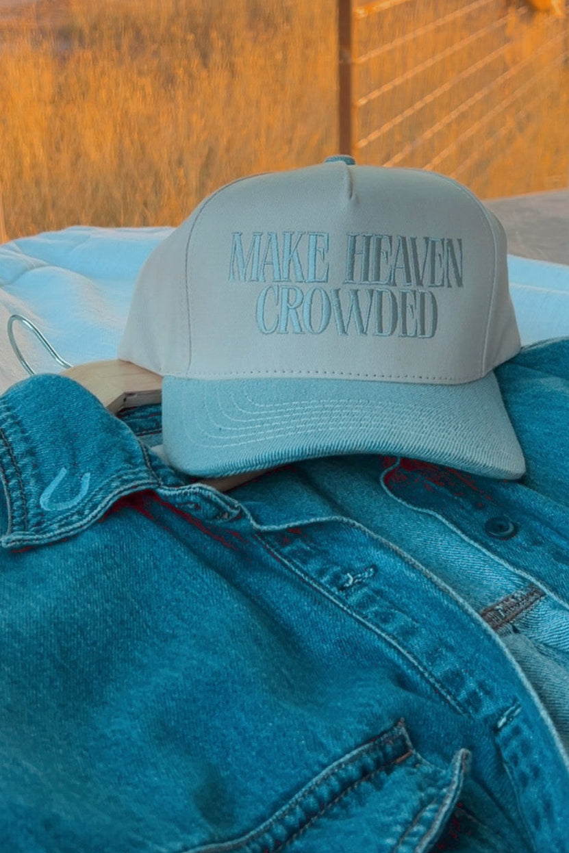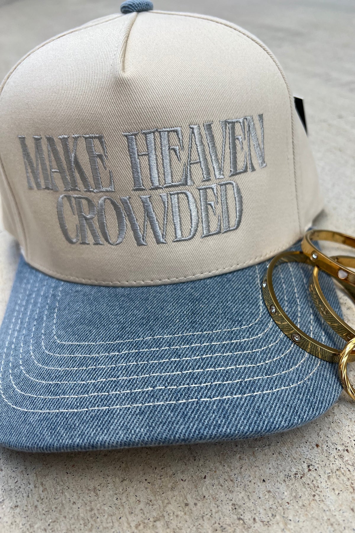 Make Heaven Crowded two-toned denim cap with a classic fit, curved brim, and bold embroidered design for a laid-back, statement-making look.