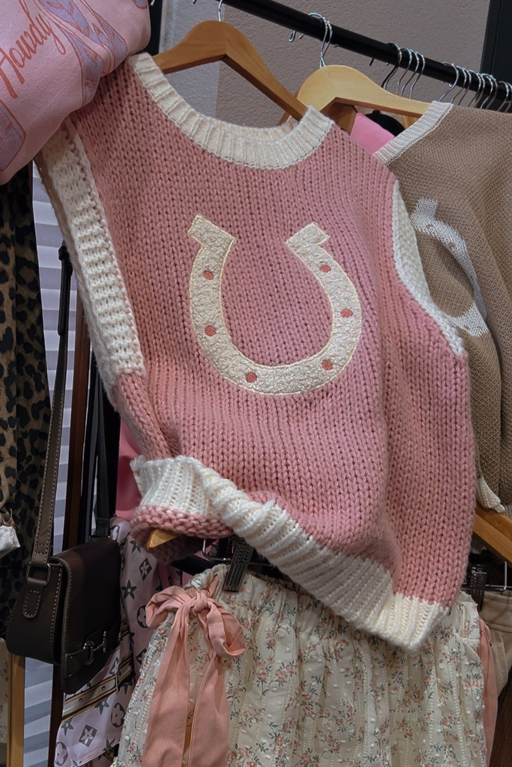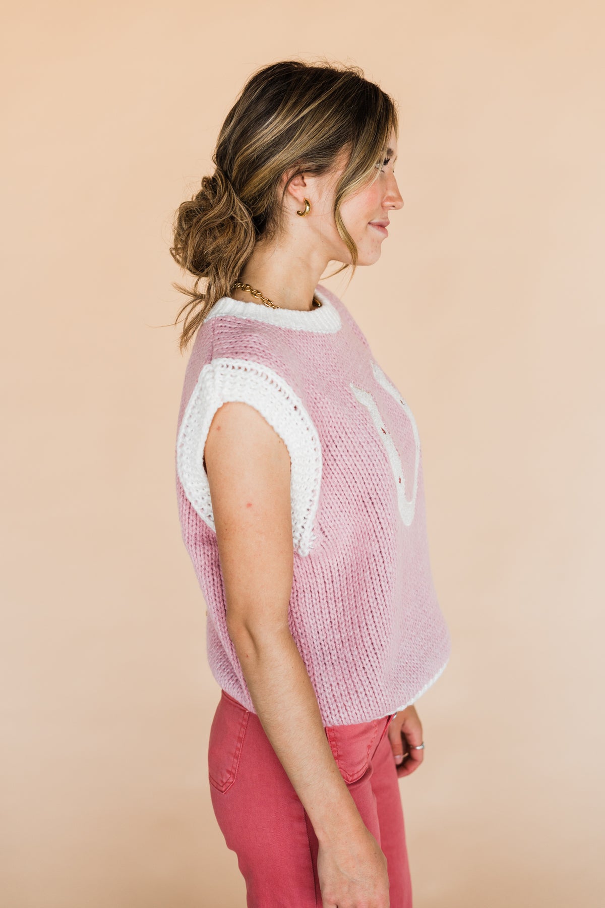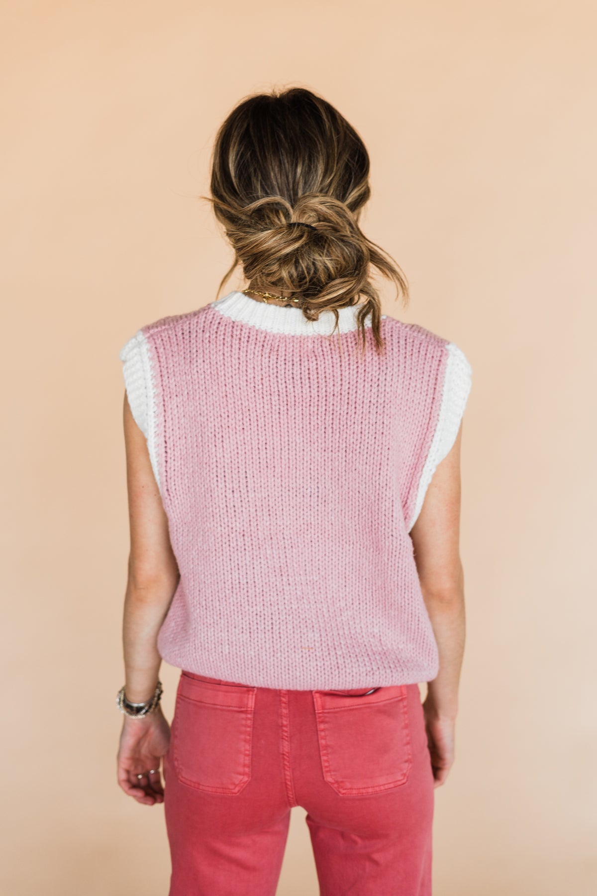 The cutest little sweater vest! Layer it with your favorite button-down or wear it alone, you're going to love the pop of color. Runs a little bit roomy!
