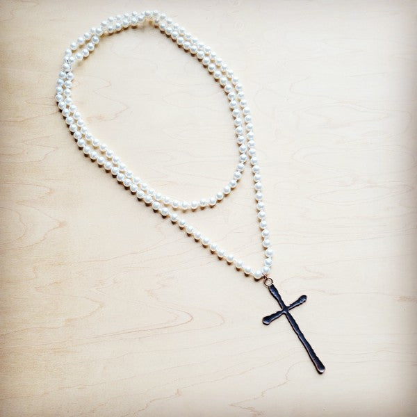 Glass Pearl beads Accented with an antique copper cross This necklace is approx 50\" in length Great for layering with shorter necklaces or wrapping multiple times Cross is approx. 4 inches in length Although your item will resemble the photo, each piece is created by hand, so no two are identical.