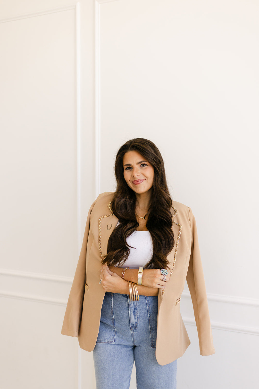 She means business — but make it western. With 3/4 ruched sleeves, shoulder pads, and stitched lapel embroidery, this blazer brings western energy to office essentials.