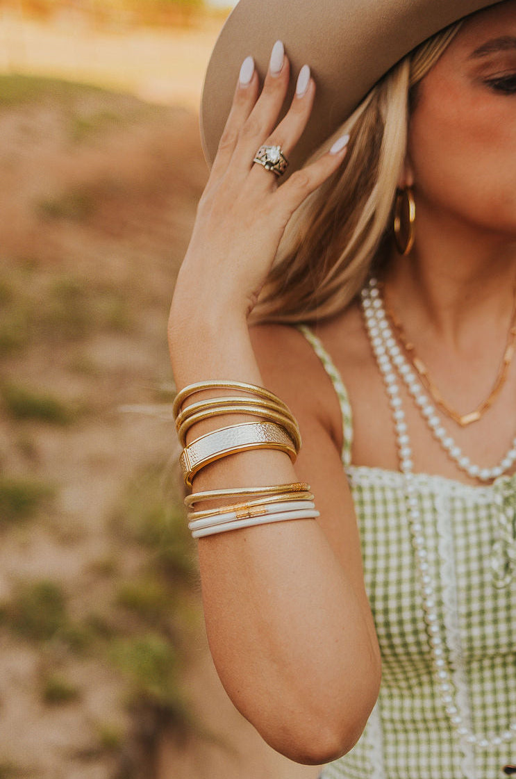 Bold meets refined in this statement leather bangle. Featuring a sleek hinged design for easy wear, this cuff blends rugged texture with modern edge—perfect for stacking or wearing solo. A must-have accessory with a hint of western flair.