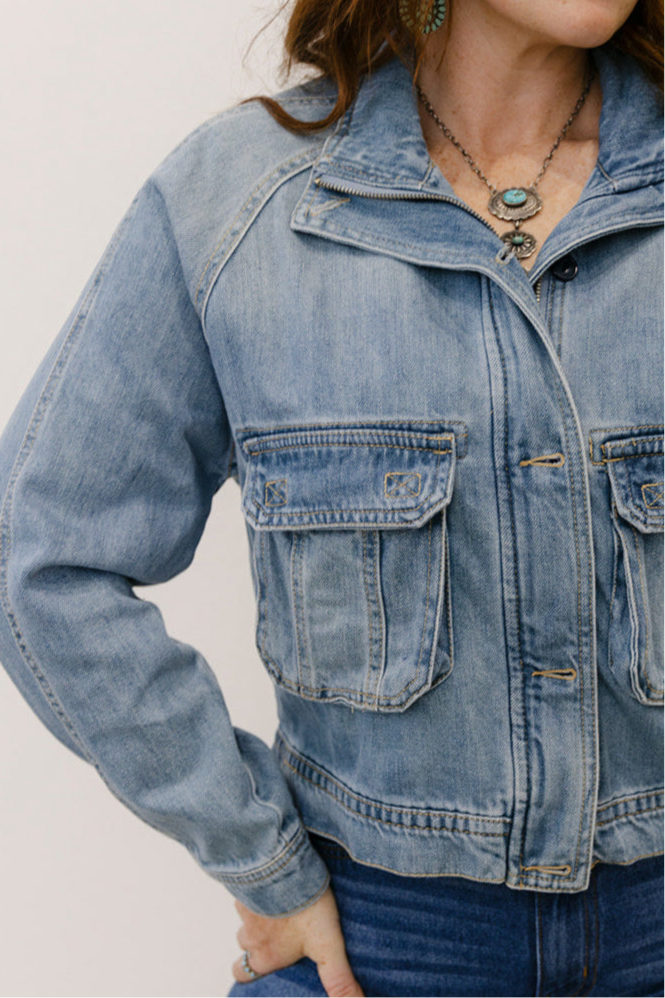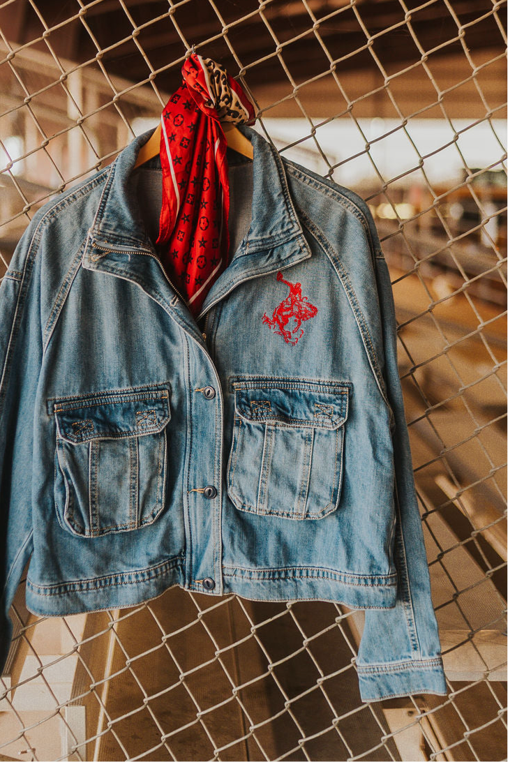 An easy denim layer with standout western detail. Features a zip front, front pockets, and a red bucking horse embroidered for just the right pop.