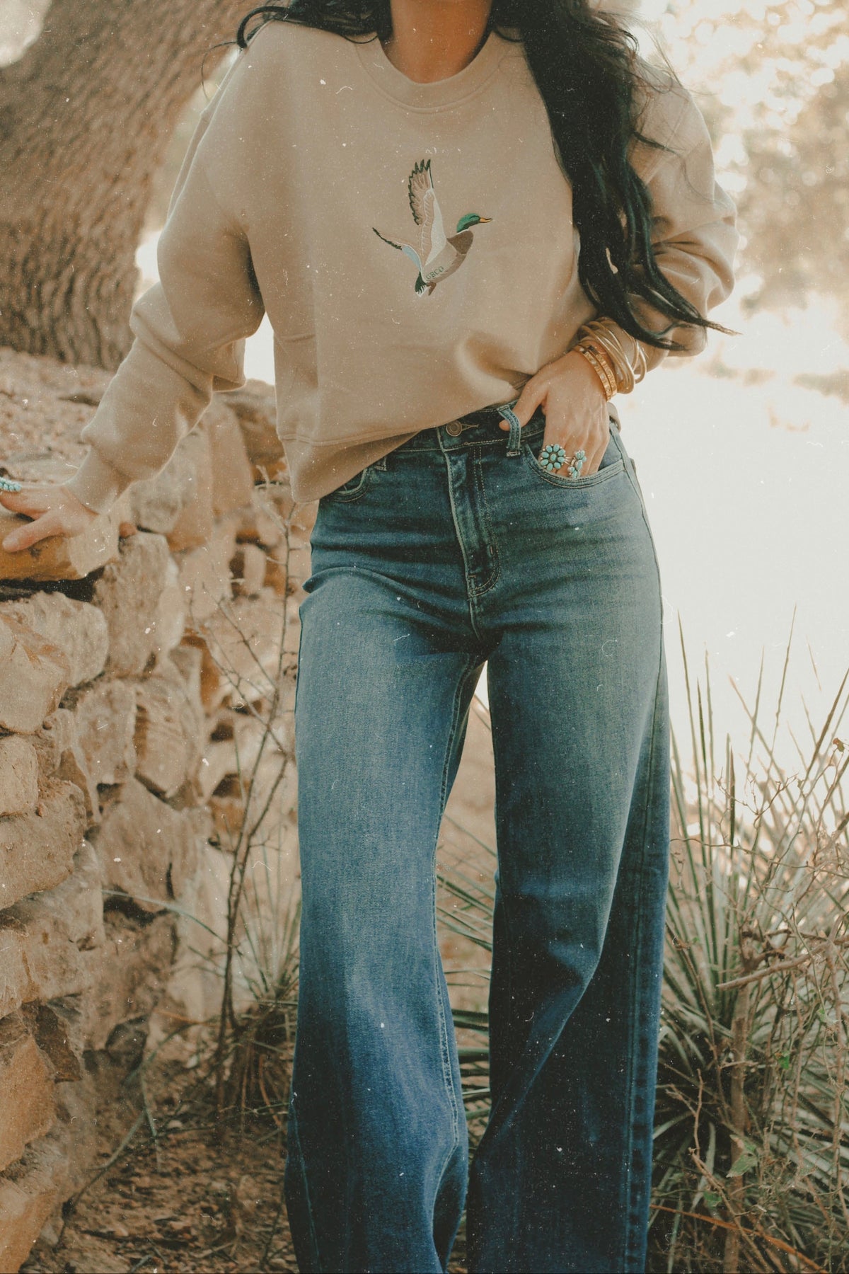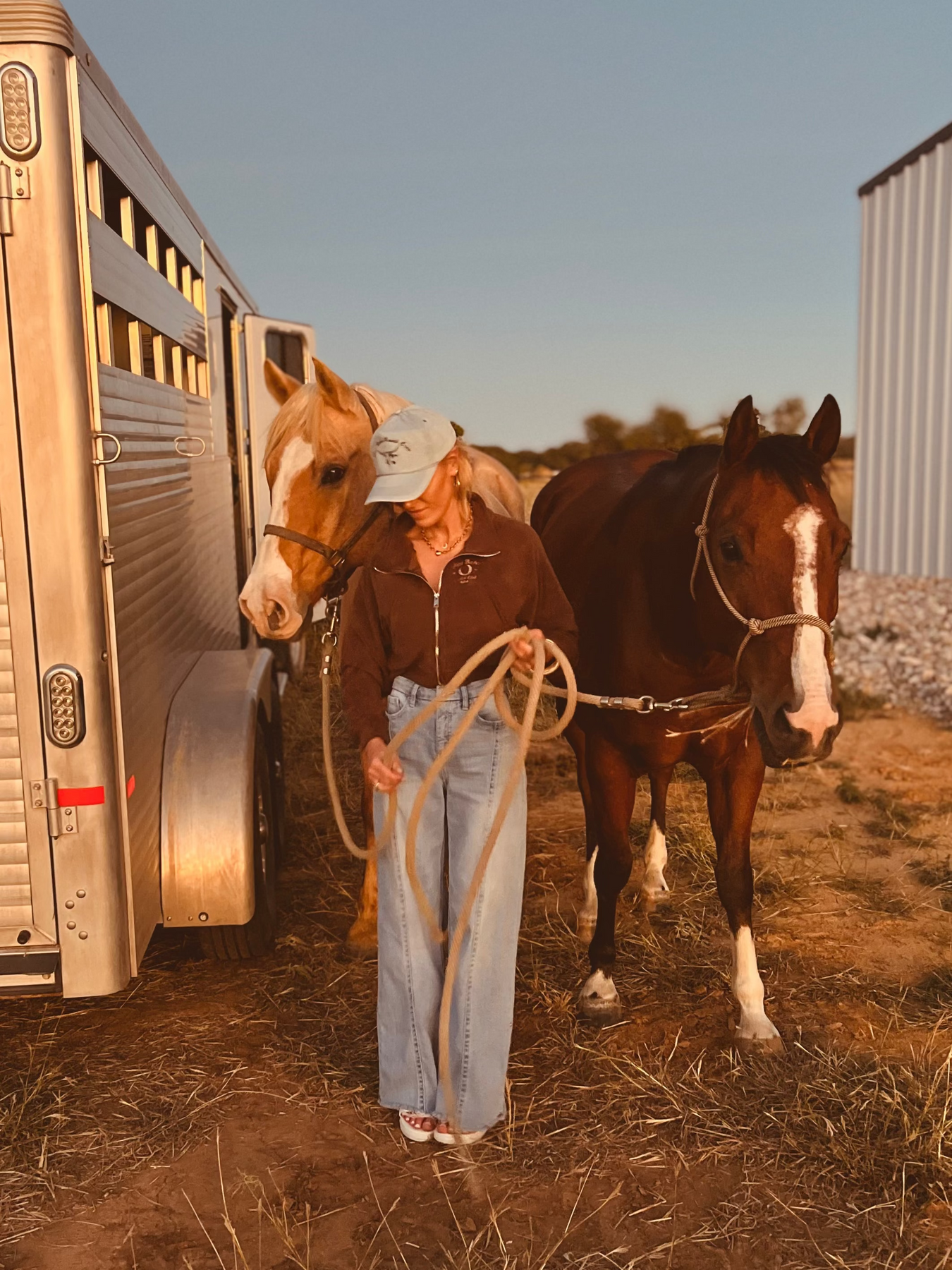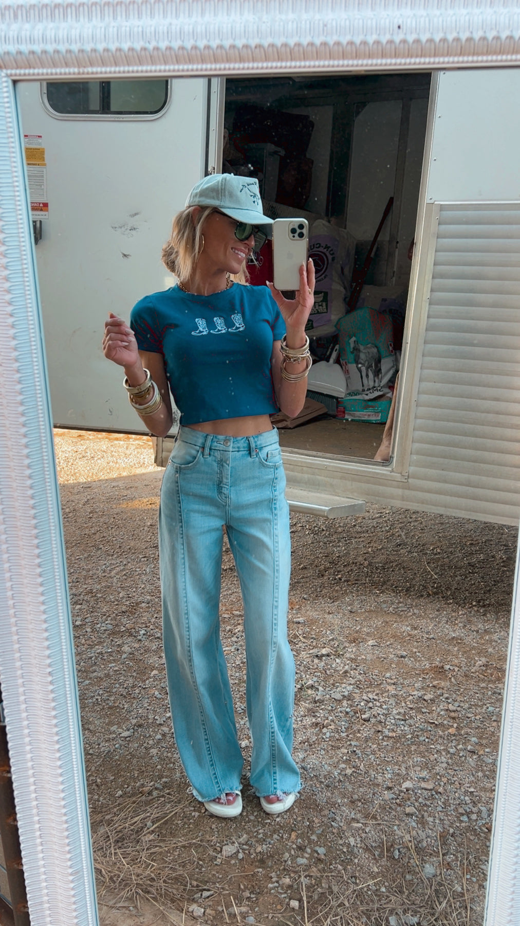 Equal parts street and western. These ankle-length cargo jeans feature an elastic back waistband, slanted pockets, and optional ankle-tie straps. We added a little extra luck in the form of three custom white horseshoes embroidered at the hem—and yes, they’re just as cute in person.